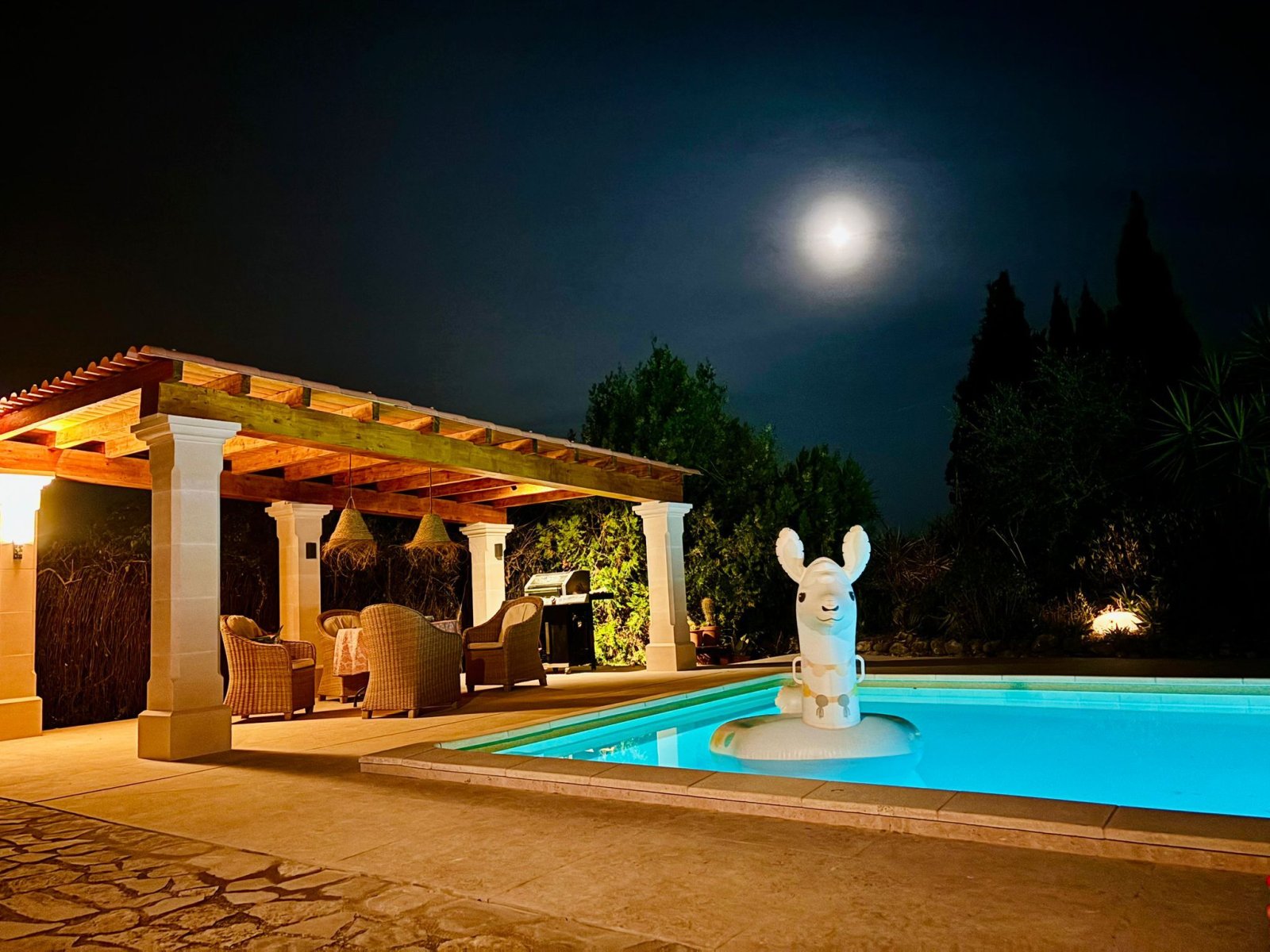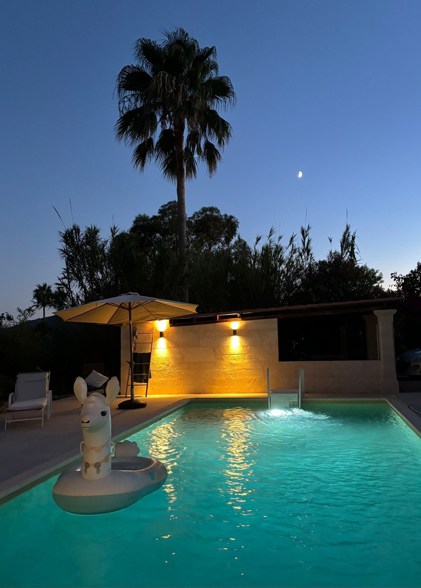 Im Außenbereich erwartet Sie ein mediterraner Traumgarten mit über 4.000m², üppig bepflanzt mit Orangen- und Olivenbäumen, Palmen, Feigen und Beerensträuchern. Mehrere weitläufige Terrassen mit über 120m² Fläche sowie eine überdachte Veranda mit eindrucksvollen Säulen laden zu geselligen Stunden und entspannten Momenten ein. Das Highlight bildet der neu renovierte Pool (8x4m) mit integriertem Sitzbereich, flankiert von einer Außendusche und modernem Beleuchtungssystem.