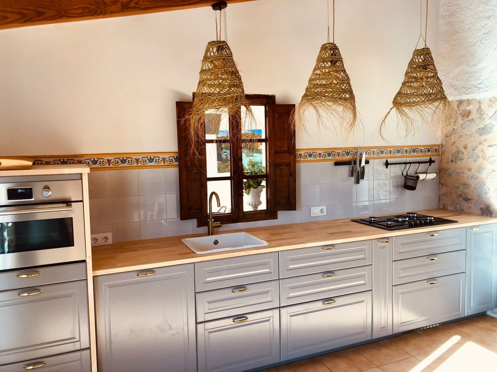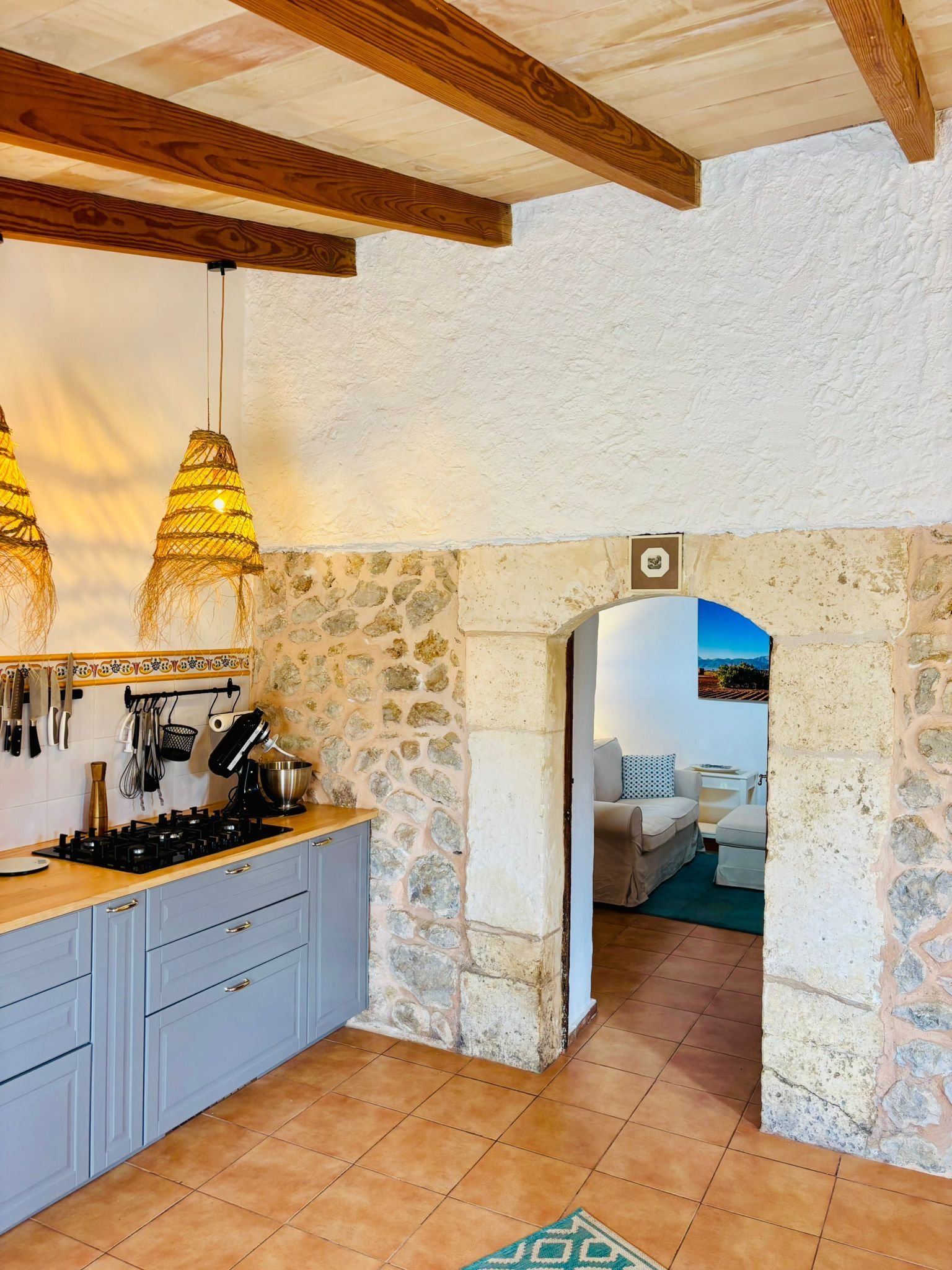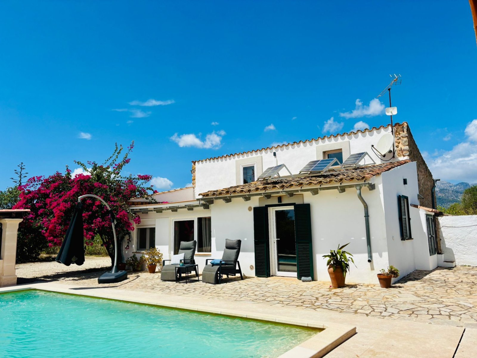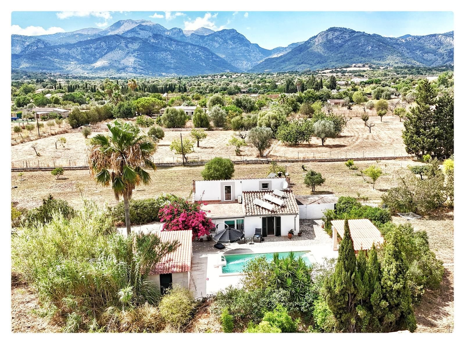Über einen privaten, ebenen Zufahrtsweg erreichen Sie das Anwesen, das sich mit einer gepflegten Auffahrt, großzügigen Stellplätzen und einer Doppelgarage präsentiert. Bereits beim Betreten offenbart sich die besondere Atmosphäre des Hauses: Natursteinwände, Holzbalkendecken und helle Räume schaffen ein Ambiente, das gleichermaßen elegant wie behaglich wirkt. Auf einer Wohnfläche von ca. 95m² erwarten Sie hochwertige Ausstattungsdetails, die keine Wünsche offenlassen. Der Wohn- und Essbereich überzeugt mit einer neuen, modern ausgestatteten Küche samt Markengeräten, einem großzügigen Essplatz und einem behaglichen Kaminofen. Ein Natursteinbogen führt in das lichtdurchflutete Wohnzimmer, wo eine eindrucksvolle Kaminfassade für ein unvergleichliches Wohngefühl sorgt. Dank Klimaanlage und Pellet-Ofen genießen Sie zu jeder Jahreszeit höchsten Komfort. Das Hauptschlafzimmer ist großzügig geschnitten, hell und klimatisiert, während das moderne Badezimmer mit ebenerdiger Dusche und stilvollem Design punktet. Ergänzt wird das Raumangebot durch einen zusätzlichen Raum im Obergeschoss, der direkten Zugang zur Dachterrasse bietet – mit atemberaubendem Panoramablick über die Serra de Tramuntana und den malerischen Ort Campanet.