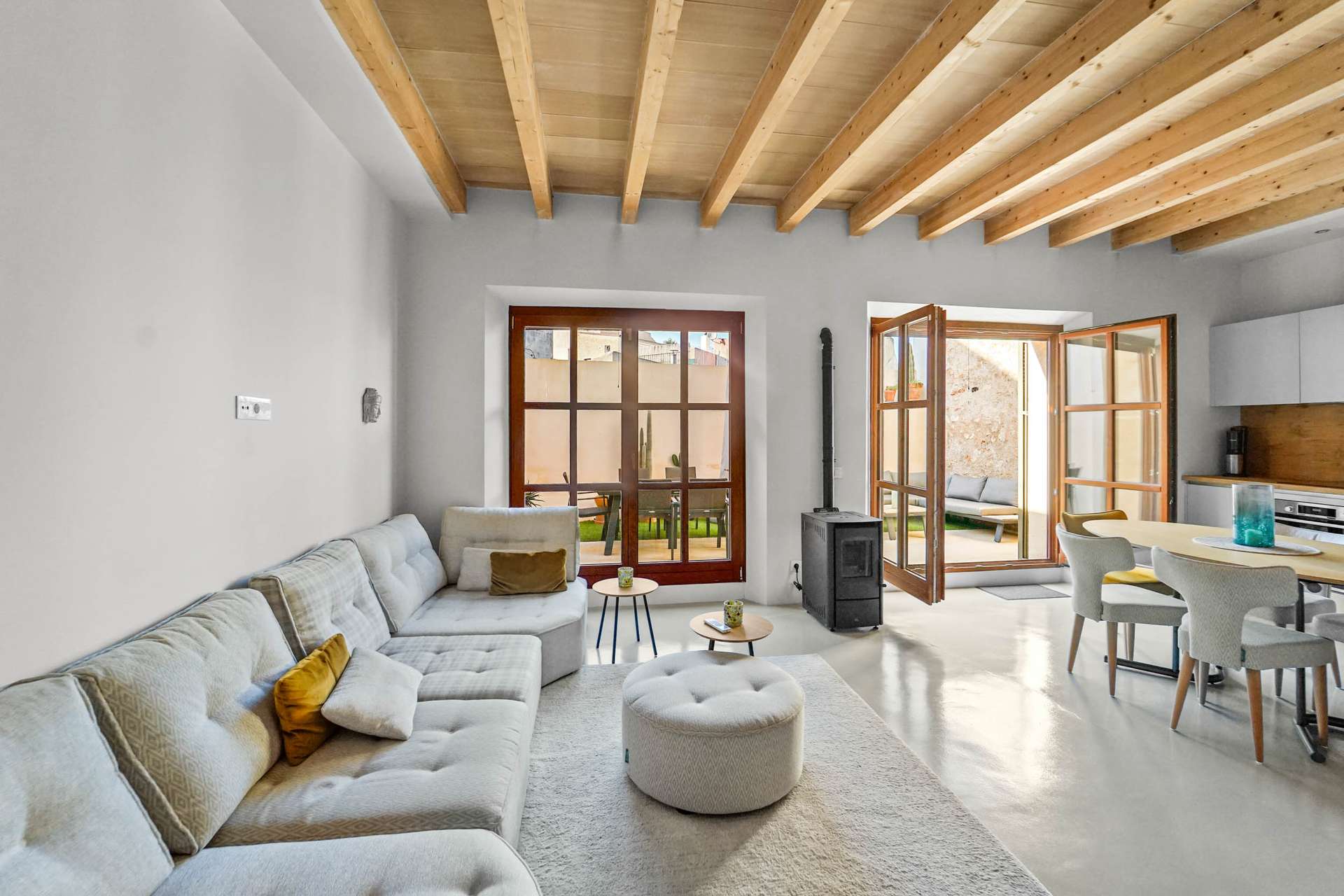 Das Erdgeschoss begeistert mit einem offenen, großzügigen Wohn- und Essbereich – mit hoher Balkendecke – samt Einbauküche mit hochwertigen Geräten. Breite, isolierverglaste Terrassentüren erstrecken sich zum Innenhof hin über die gesamte Front und sorgen für Helligkeit. Bei schönem Wetter verschmelzen durch die weit geöffneten Türen Innen- und Außenbereich. Die geräumige, blickgeschützte Terrasse im gepflegten Innenhof, in die ab dem frühen Nachmittag warmes Sonnenlicht fällt, bietet Ruhe und Abgeschiedenheit. Mit einem großen Esstisch, einem Gasgrill sowie einem Loungebereich finden Sie hier zugleich den perfekten Rahmen für gesellige Abende mit Freunden.