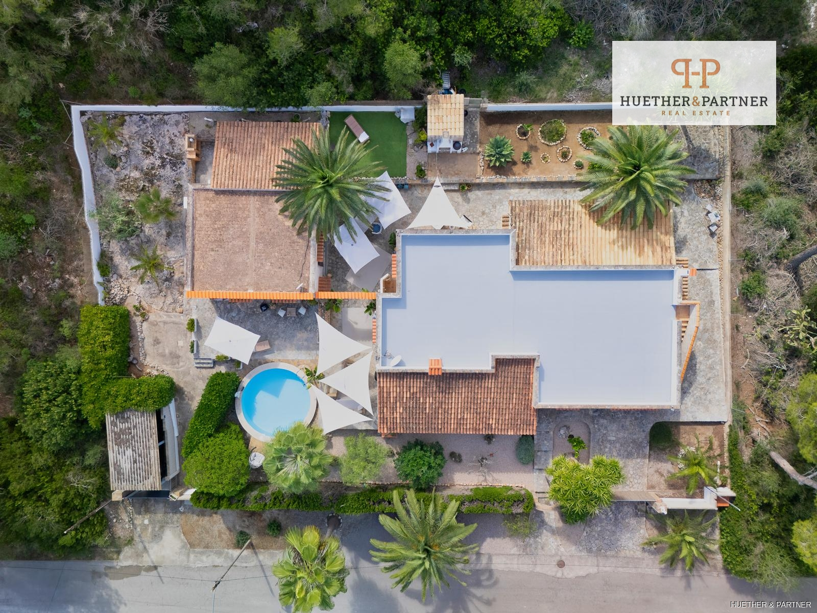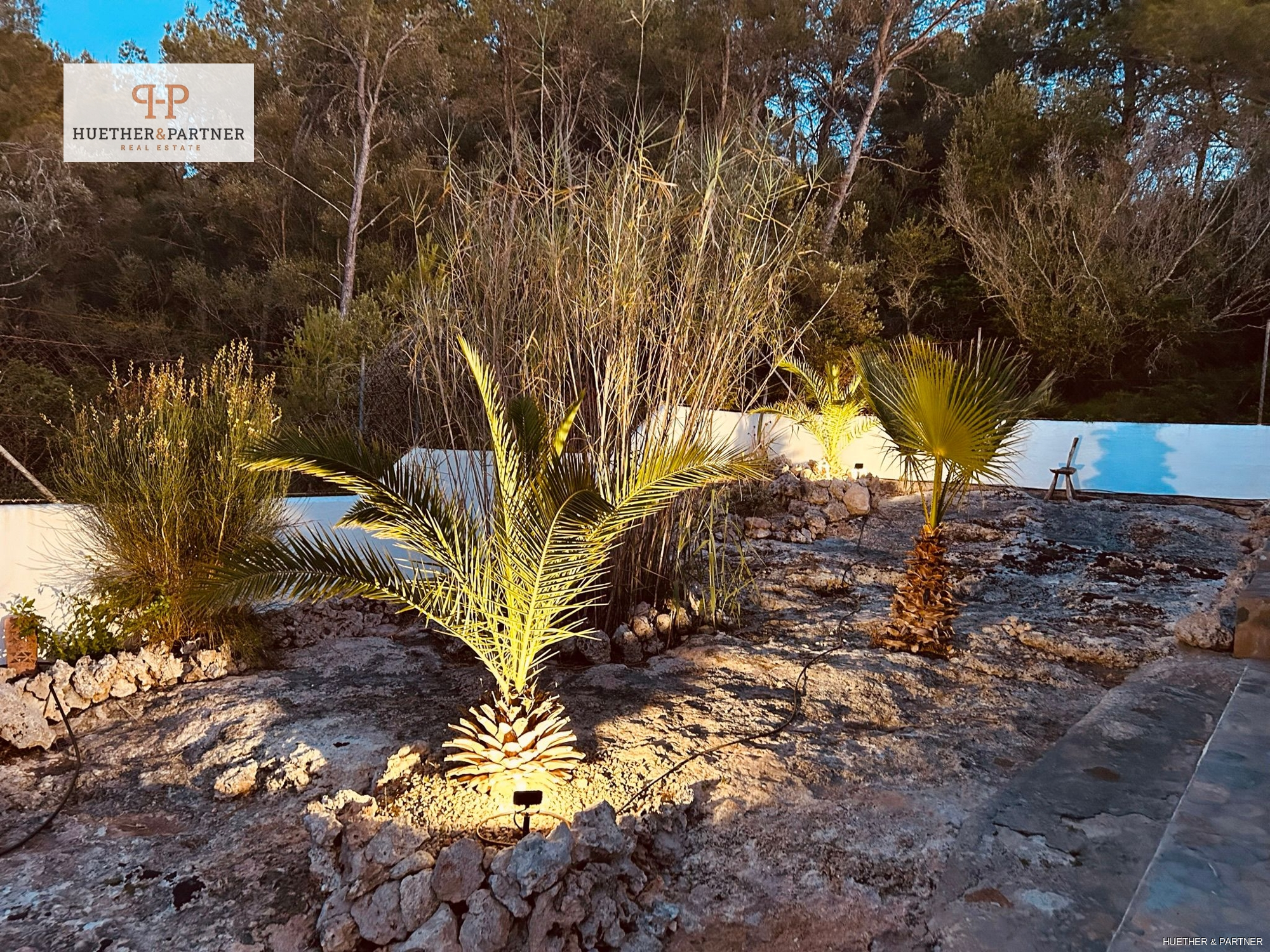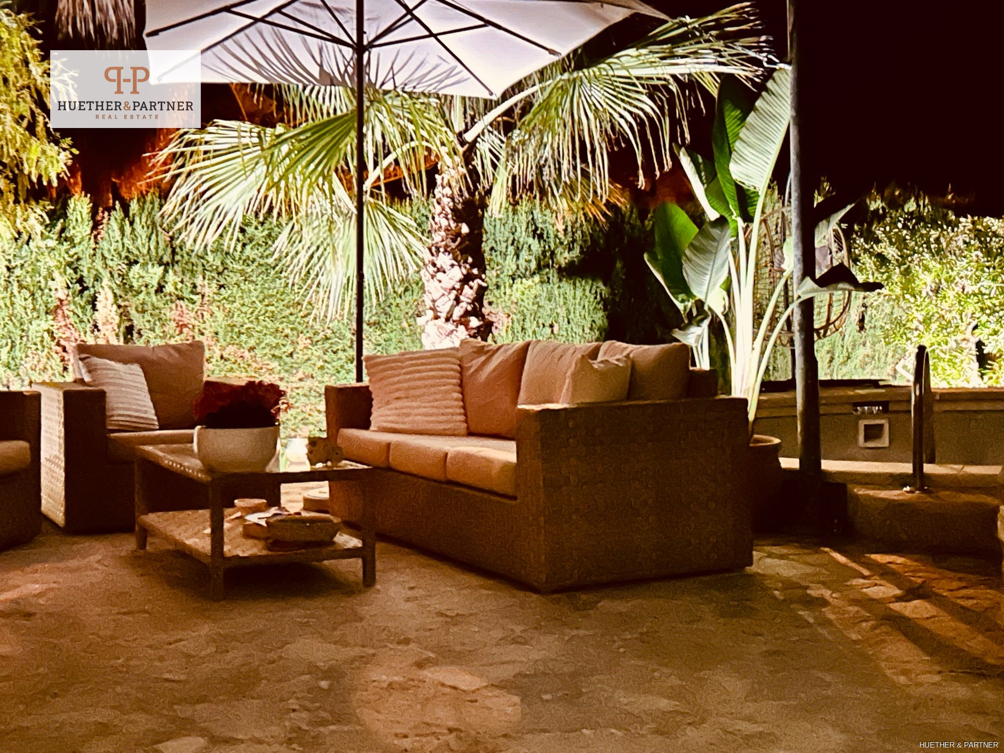Der Außenbereich des Hauses ist eine absolute Wohlfühl-Oase. Der Pool liegt zwischen Haupthaus und Gästehaus, Sitzecken, kleiner Teich mit Wasserlauf, Steingarten, einem wunderschönen gemauerten Tisch unter einer Palme und mediterranem Garten. Eine Dachterrasse über dem gesamten Haupthaus lässt alle Wünsche zur Gestaltung offen. Abends erwartet Sie ein illuminierter mediterraner Traum. Das gesamte Haus ist umringt von einer Grünzone, die nicht bebaut werden darf. Keine Nachbarn in unmittelbarer Nähe sorgen für Ruhe und Privatsphäre.