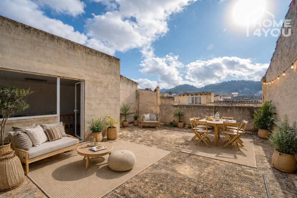 The existing living space of approx. 160m² is currently divided between the first floor and the second floor. The layout includes a large kitchen, a living area, three bedrooms, a bathroom and a striking central staircase with historical character. The outdoor area impresses with a spacious garden and a generous Roof terrace of approx. 80m² - with views over the rooftops of Felanitx.