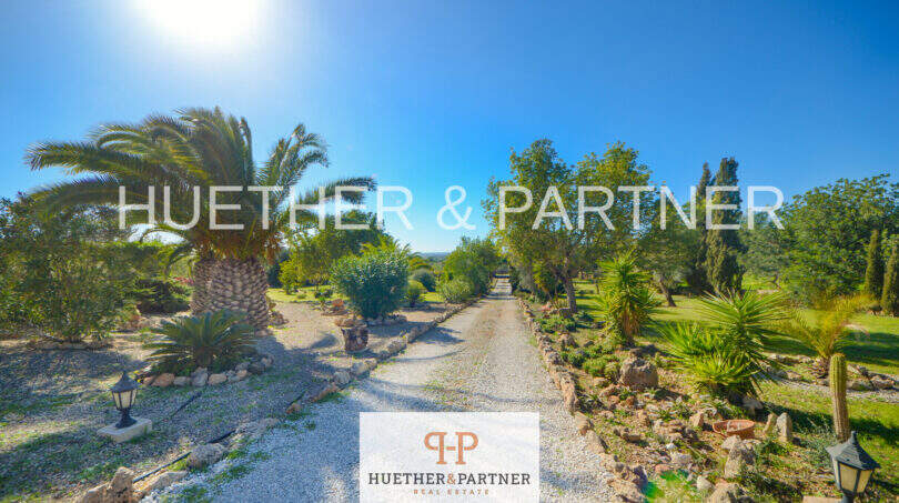Finca kaufen nahe Palma, legal mit Pool: eine eindrucksvolle, von mediterranen Pflanzen gesäumte Zufahrt führt Sie auf das Anwesen und vermittelt bereits beim Eintreten ein Gefühl von Ruhe, Privatsphäre und Exklusivität.