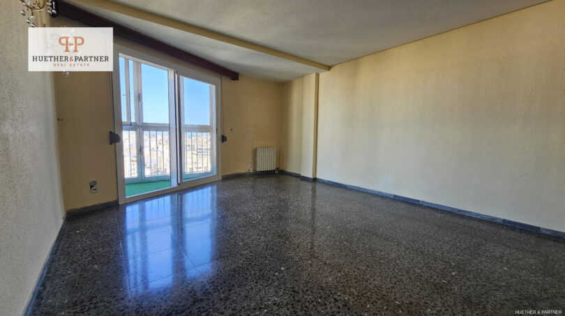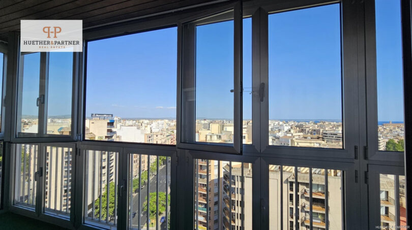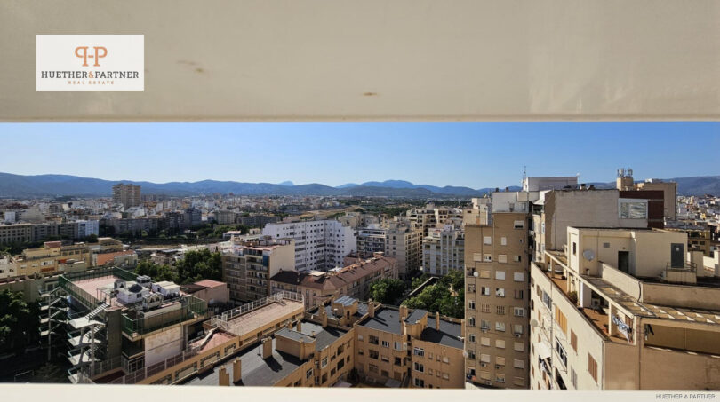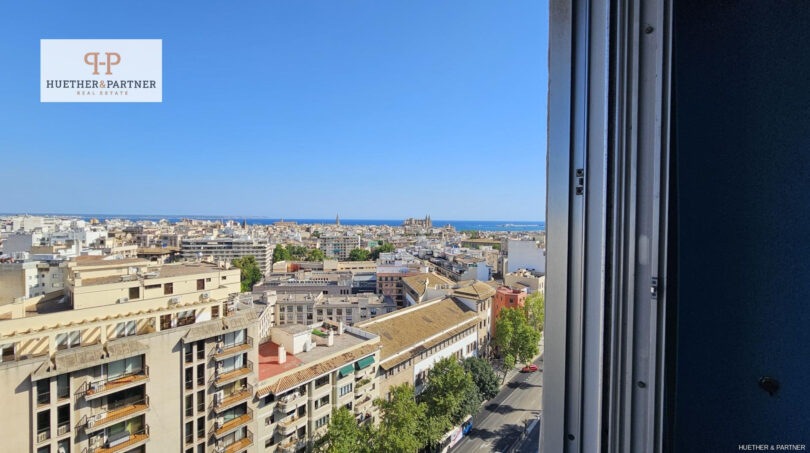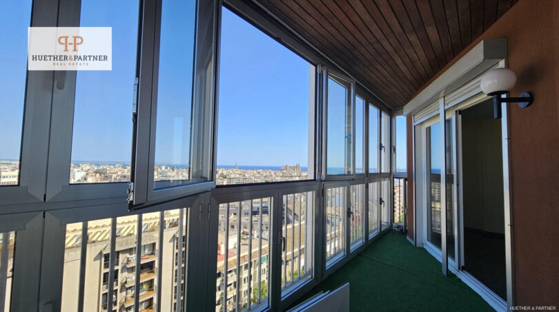 Welcome to your new home at lofty heights: this spacious home Apartment to the Sale on the 13th floor offers a unique panoramic view that stretches from the Mediterranean Sea and the cathedral to the Serra de Tramuntana and the entire bay of Palma.