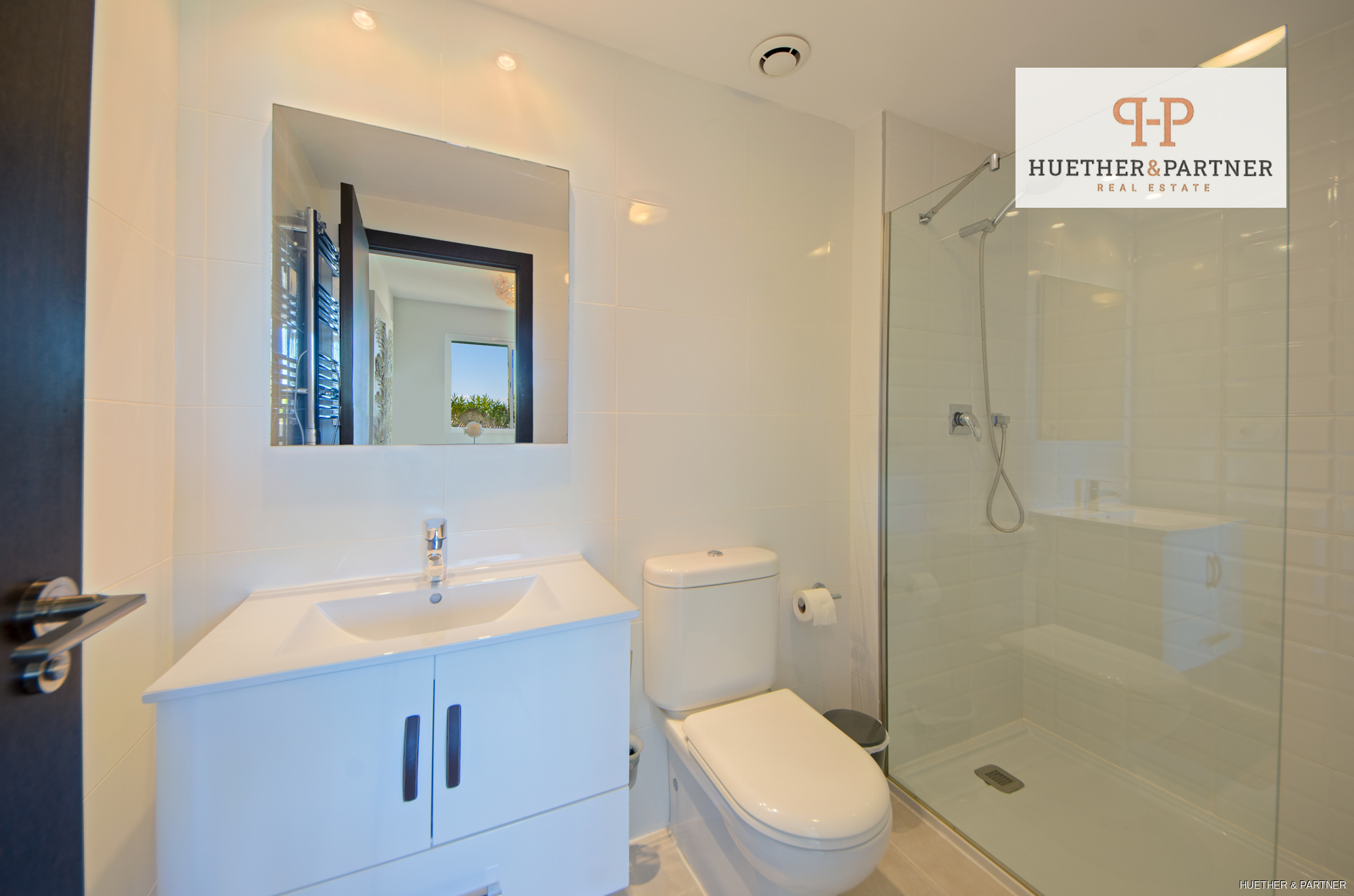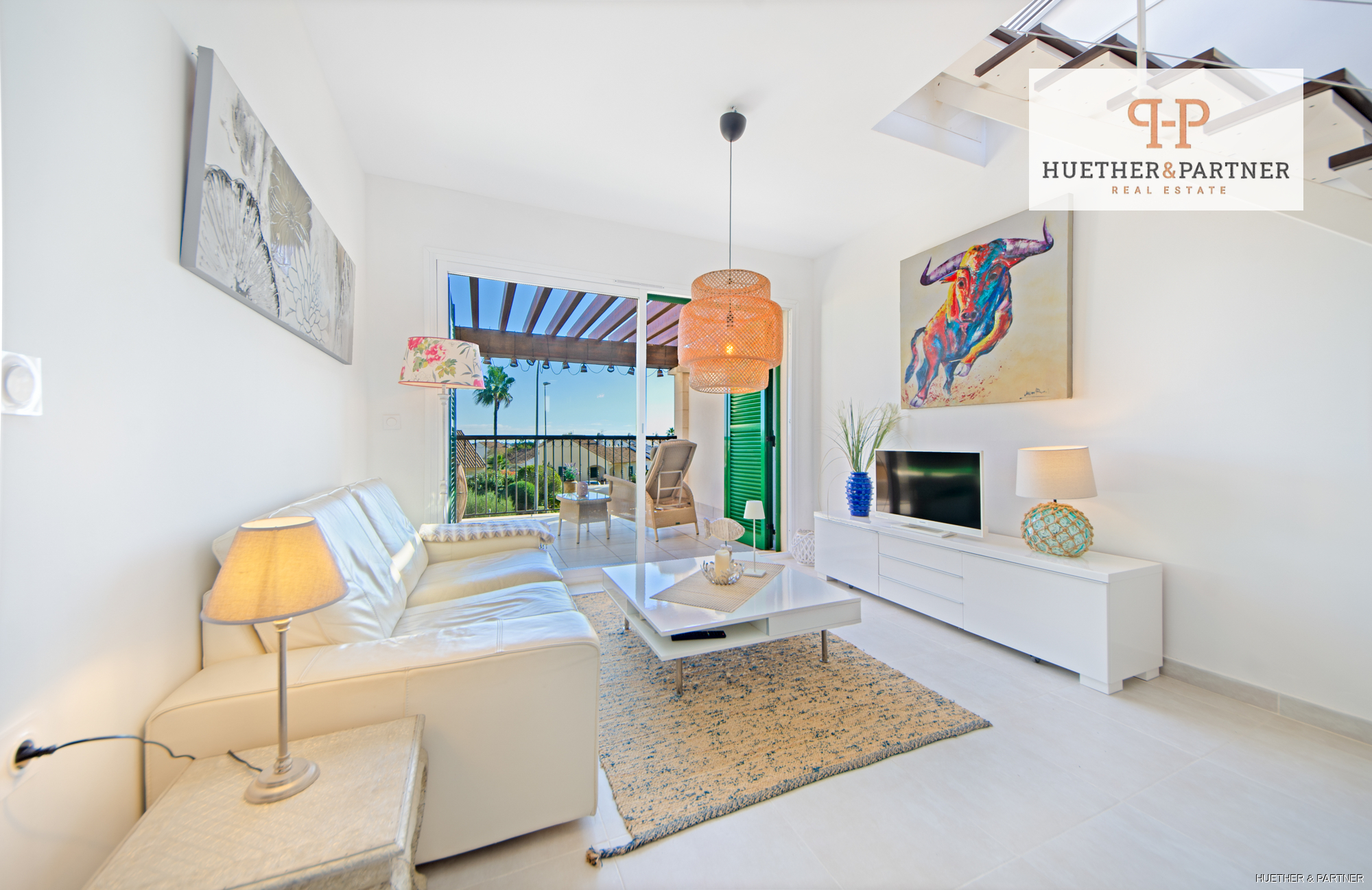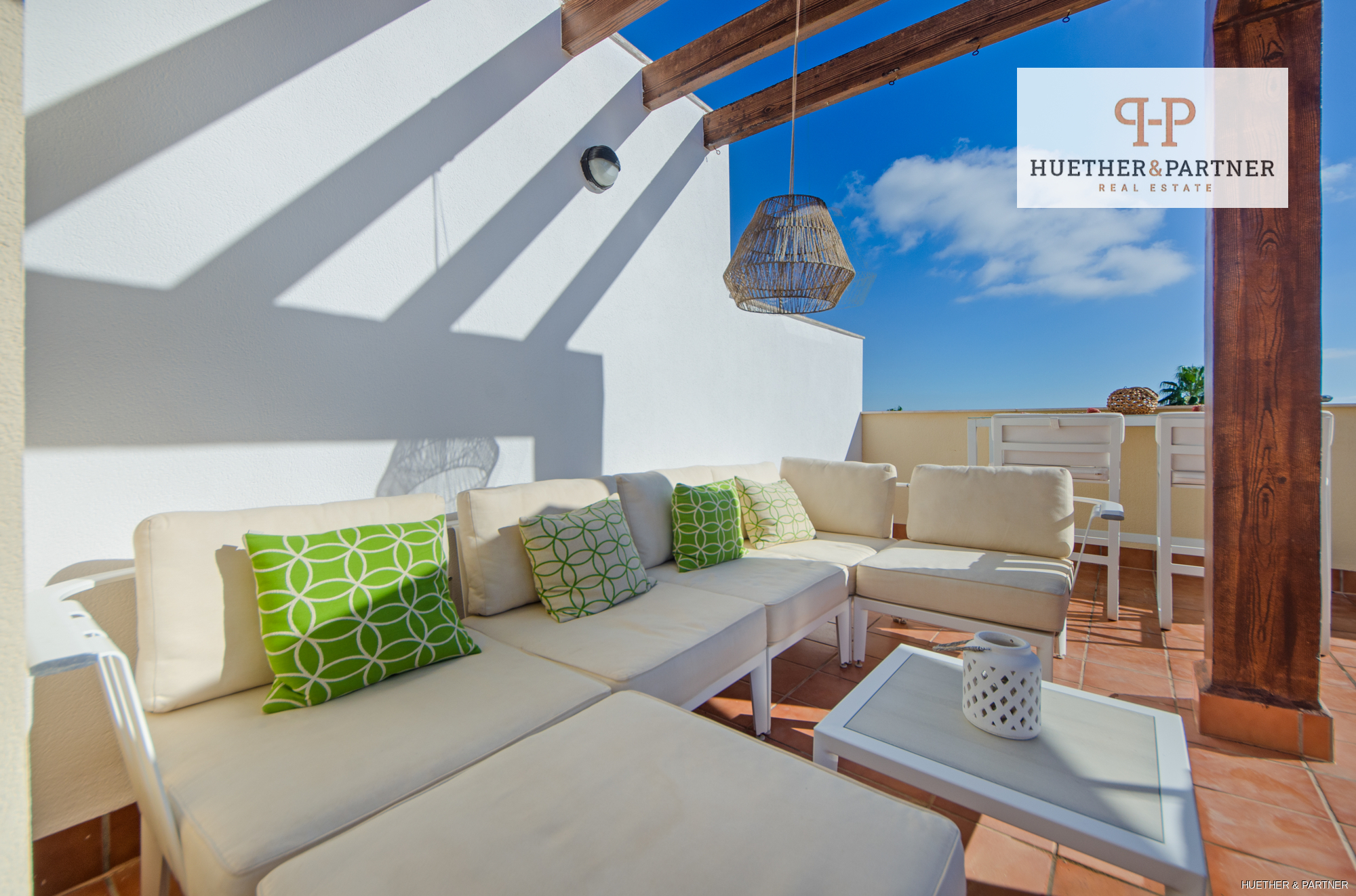 Innen überzeugt die Wohnung mit einem großzügigen Raumkonzept, das durch natürliche Lichtverhältnisse und hochwertige Materialien besticht. Die offene Küche, ausgestattet mit eleganten lackierten Fronten und erstklassigen AEG-Geräten, bietet nicht nur Funktionalität, sondern auch ein stilvolles Ambiente. Der angrenzende Haushaltsraum ist mit Waschmaschine und Trockner ausgestattet. Das lichtdurchflutete Wohnzimmer führt zur beeindruckenden Dachterrasse, die sich per Fernbedienung elektrisch öffnen lässt. Hier können Sie die frische Luft und den Panoramablick auf das Meer genießen oder auf einem 52m² großen, windgeschützten Bereich entspannen, ausgestattet mit hochwertigen Garpa-Gartenmöbeln. Ein BBQ und eine Außendusche mit Warmwasser machen die Terrasse zu einem idealen Rückzugsort.