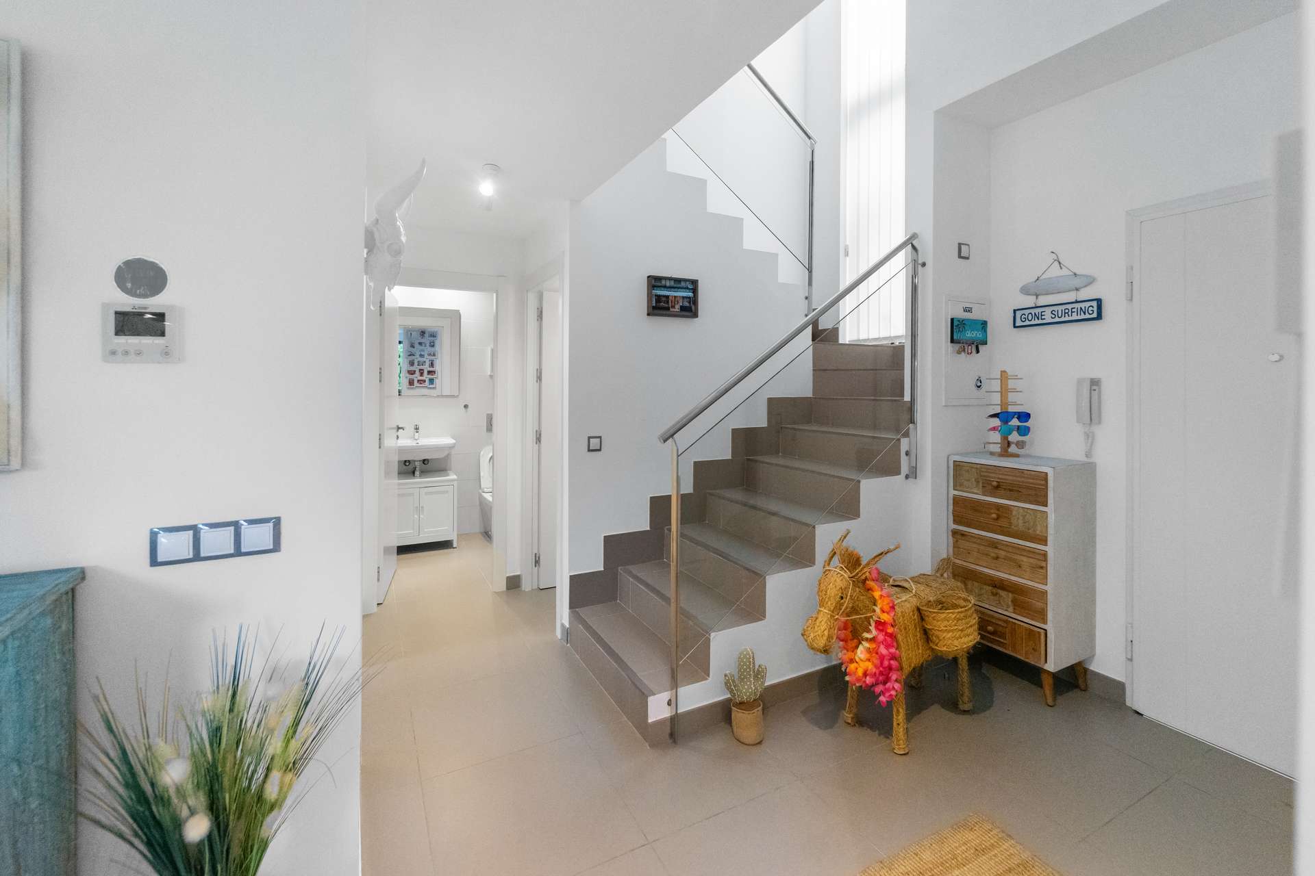 There are a total of three bedrooms, one of which is on the lower living level, as well as three stylish bathrooms. In addition to the central heat pump and air conditioning, all bathrooms are also equipped with electric underfloor heating, which ensures a pleasant indoor climate all year round.