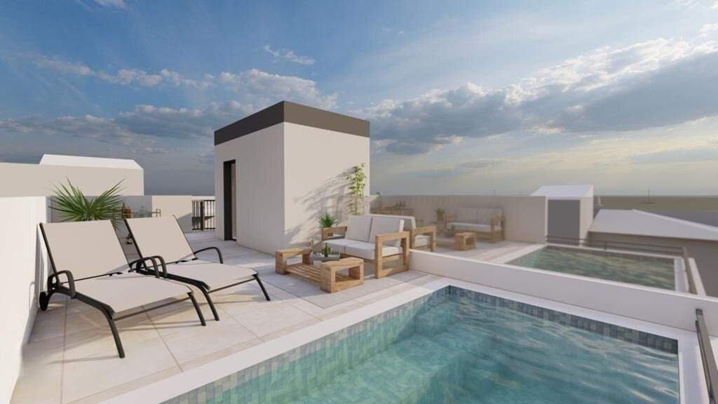 Penthouse kaufen an der Playa de Palma, Meerblick und Pool: diese exklusive Neubau-Penthousewohnung vereint modernes Wohnen mit einer der begehrtesten Lagen Mallorcas – direkt an der Playa de Palma. Nur wenige Schritte trennen Sie vom feinsandigen Strand, während sich in unmittelbarer Umgebung eine große Auswahl an Restaurants, Cafés und stilvollen Ausgehmöglichkeiten befindet. Trotz dieser zentralen Lage genießen Sie hier eine angenehm ruhige Wohnatmosphäre in einer wenig befahrenen Straße – ein seltener Vorteil in dieser Region.