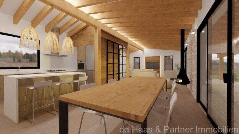 Der große, helle Wohn- und Essbereich mit modernem Kamin und Zugang zur überdachten Terrasse sowie zur Poolterrasse (30m² Pool) lädt zum gemütlichen Verweilen ein. Die Raumhöhe mit bodentiefen Fenstern sorgt für ein lichtdurchflutetes Konzept. Die an den Essbereich anschließende, modern ausgestattete Küche mit Kochinsel lässt keine Wünsche offen. Ein Gäste-WC steht ebenfalls zur Verfügung. Der Master-Schlafbereich mit Bad en Suite und Ankleidebereich sowie Zugang zum Außenbereich, zwei weitere Schlafzimmer und ein Vollbad machen diese Finca ideal für die ganze Familie.