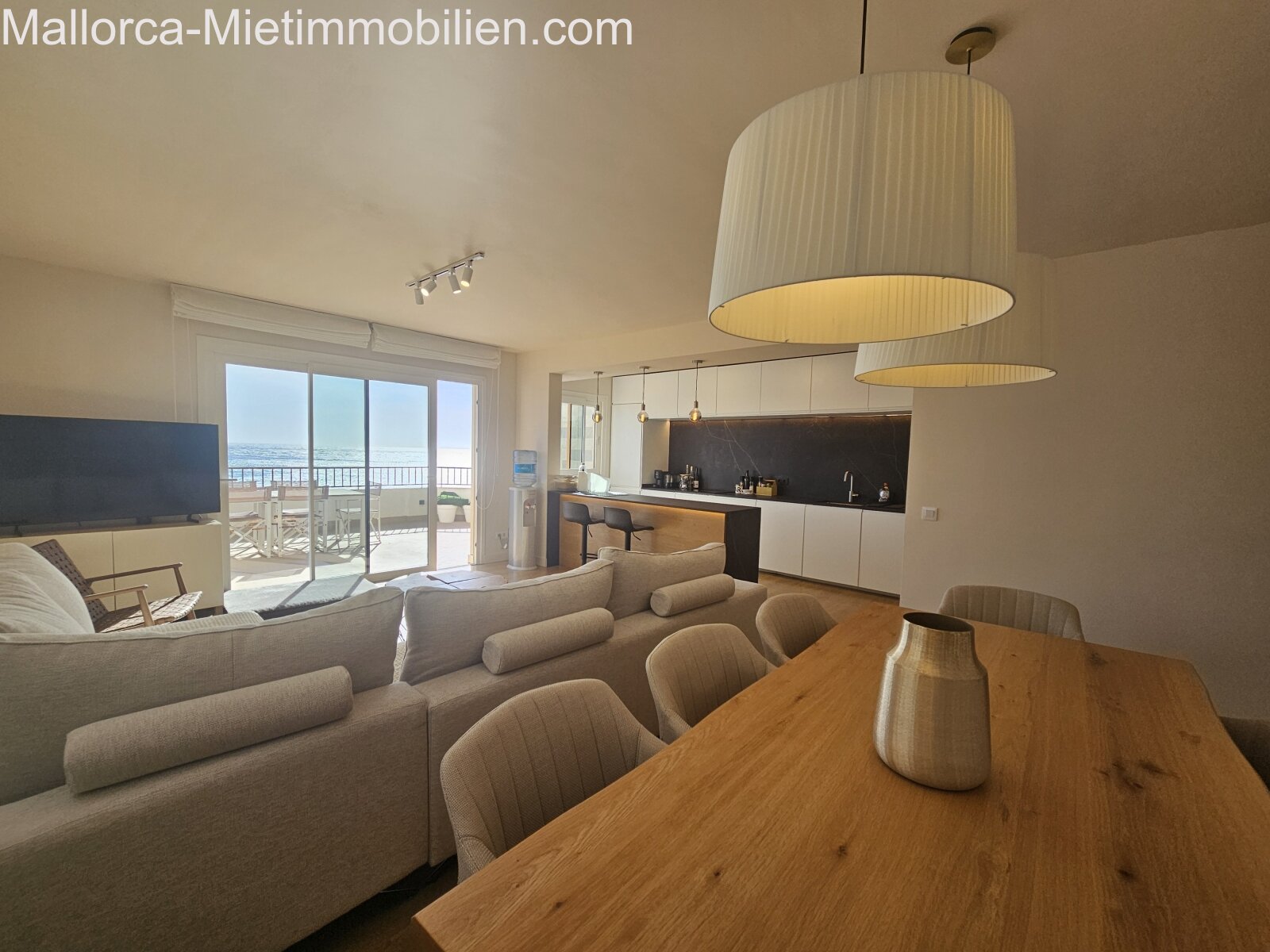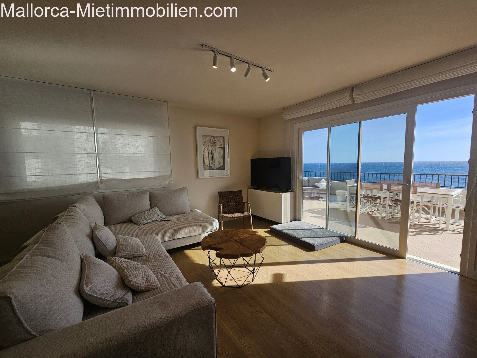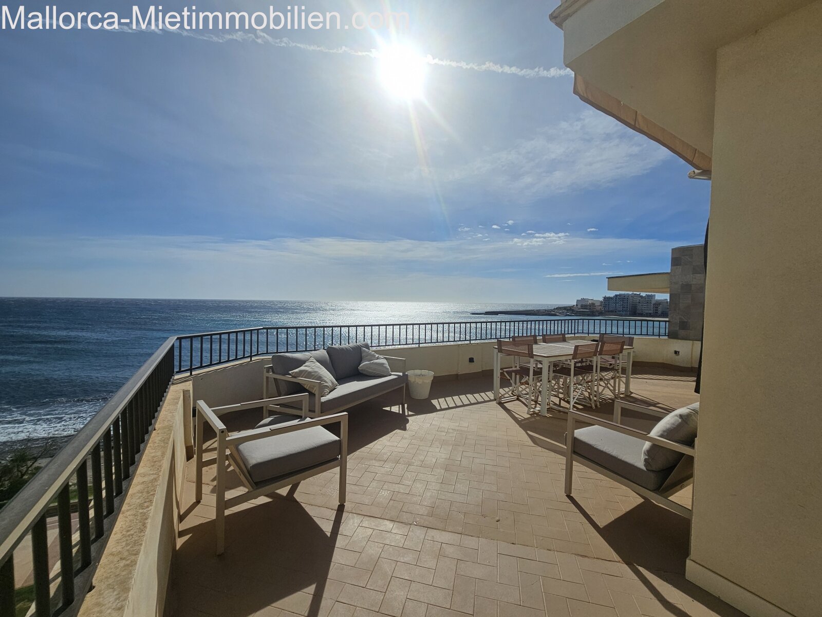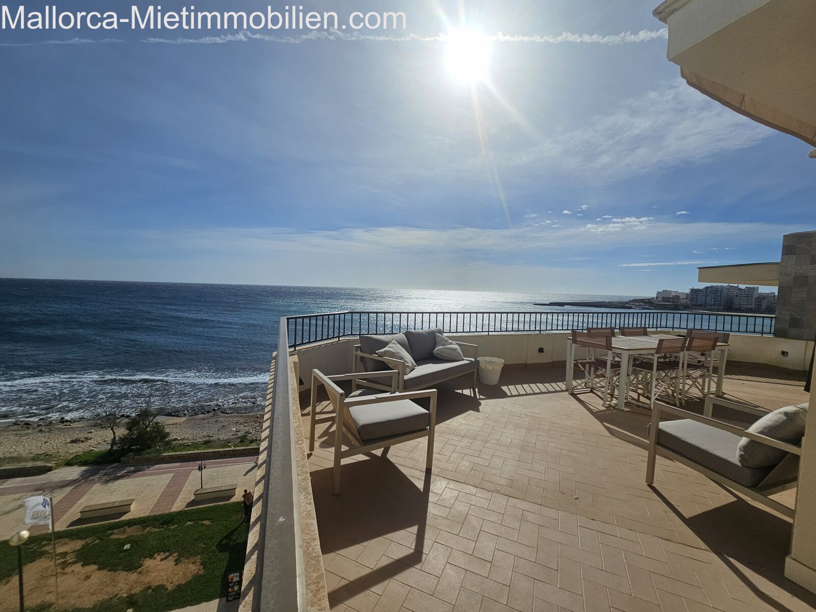 Apartment zu mieten in S’Illot mit Terrasse: unglaublich stylische Wohlfühloase in erster Linie bei S’Illot – nur 40m vom Meer entfernt, ideal zum Schwimmen, der Strand liegt etwa 60m entfernt. Die Mietwohnung bietet eine umlaufende Terrasse und eine private Dachterrasse samt Abstellhaus. Elektrisch ein- und ausfahrbare Überdachung sowie BBQ sind vorhanden.