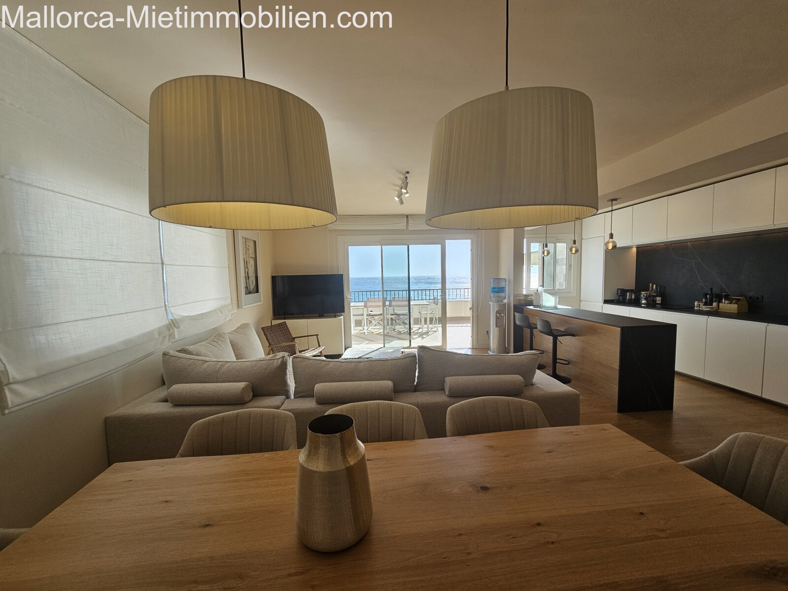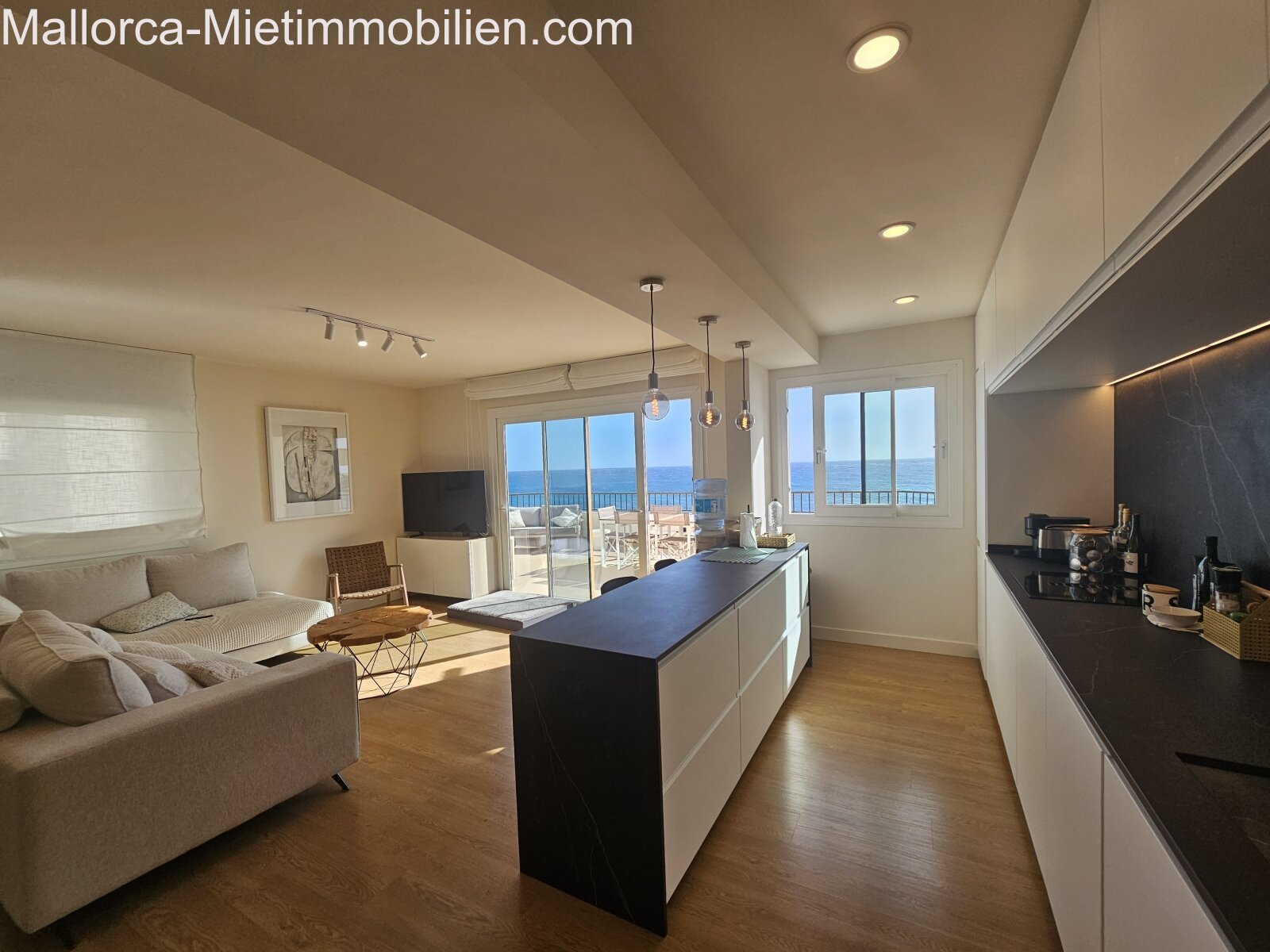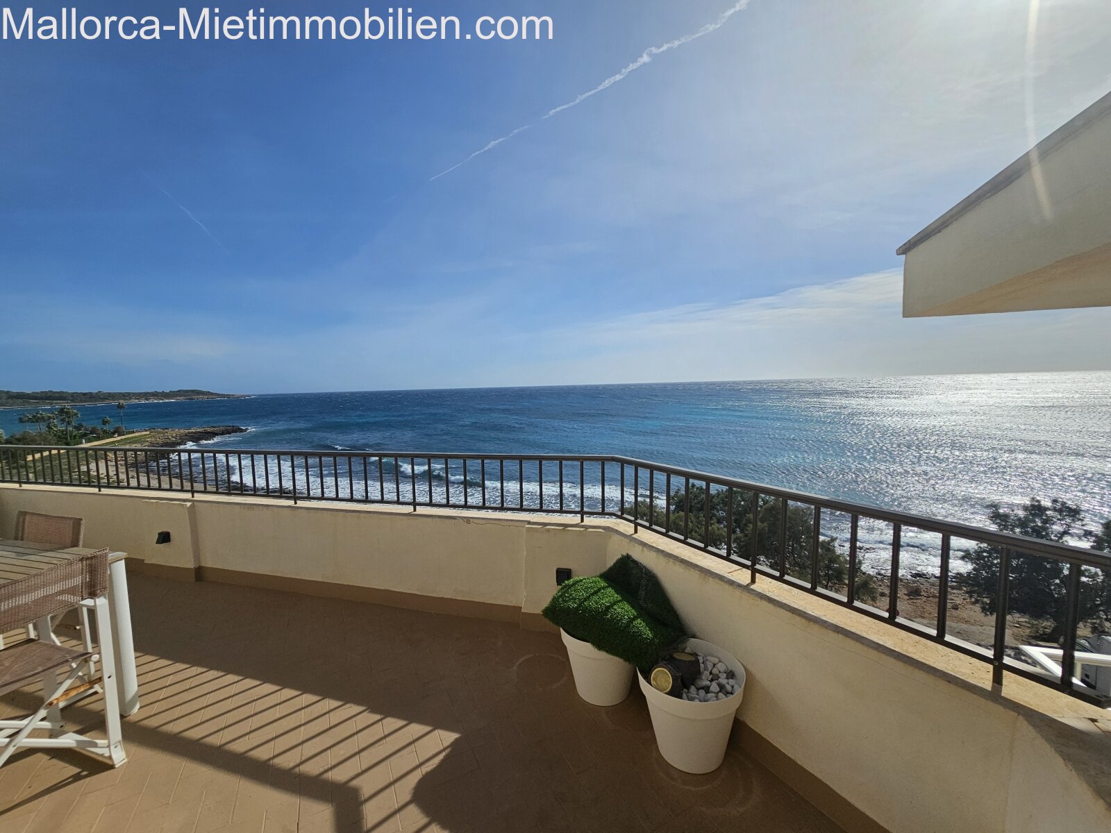 Apartment zu mieten in S’Illot mit Terrasse: unglaublich stylische Wohlfühloase in erster Linie bei S’Illot – nur 40m vom Meer entfernt, ideal zum Schwimmen, der Strand liegt etwa 60m entfernt. Die Mietwohnung bietet eine umlaufende Terrasse und eine private Dachterrasse samt Abstellhaus. Elektrisch ein- und ausfahrbare Überdachung sowie BBQ sind vorhanden.