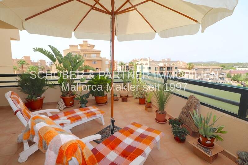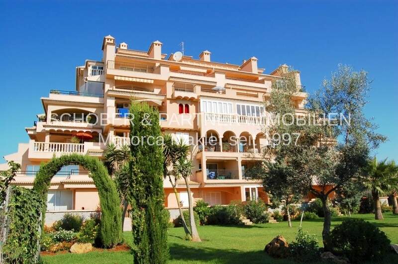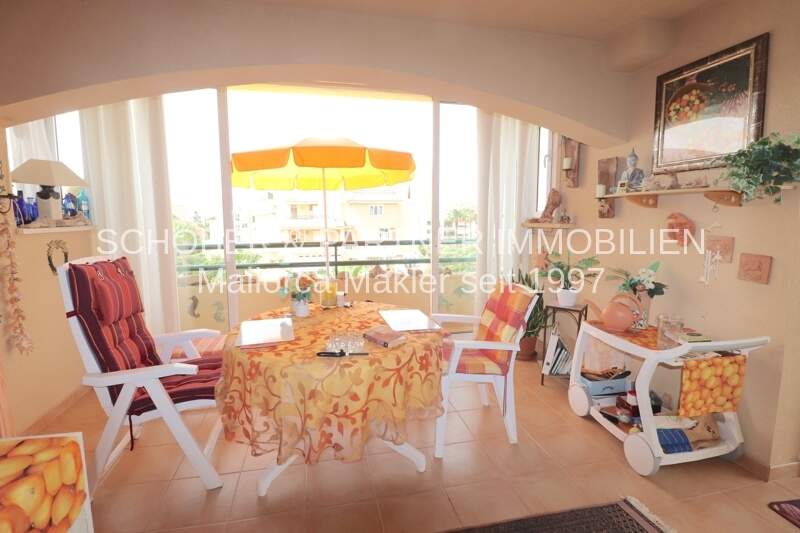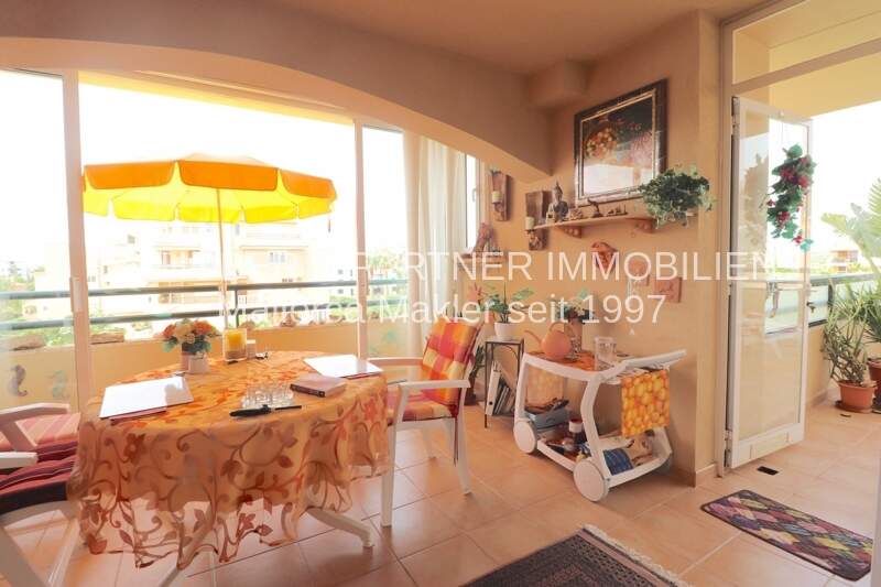Apartment in Sa Coma kaufen, Ecklage mit Pool: Die Eigentumswohnung liegt im 4. Obergeschoss einer sehr gepflegten Gemeinschaft und wurde 2003 von dem renommierten Bauträger „Cotesa“ qualitativ hochwertig erbaut. Durch die Ecklage, die Ausrichtung der Wohnung und die Aussicht kann man durchaus von einer der schönsten Apartments in der Anlage sprechen – diese besteht aus 2 Mehrfamilienhäusern und einem großen Community pool mit mediterraner Gartenanlage.