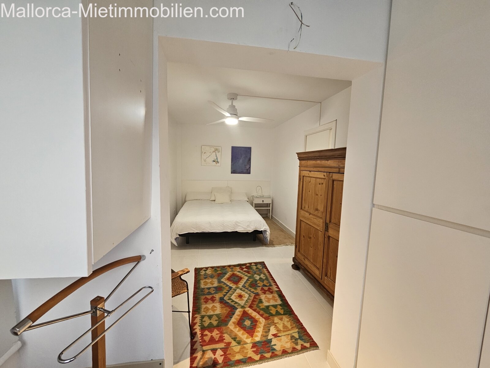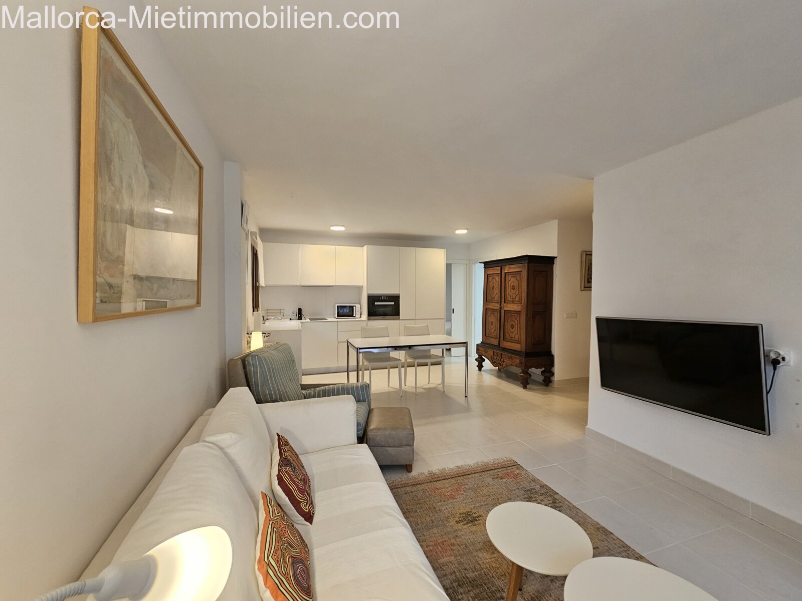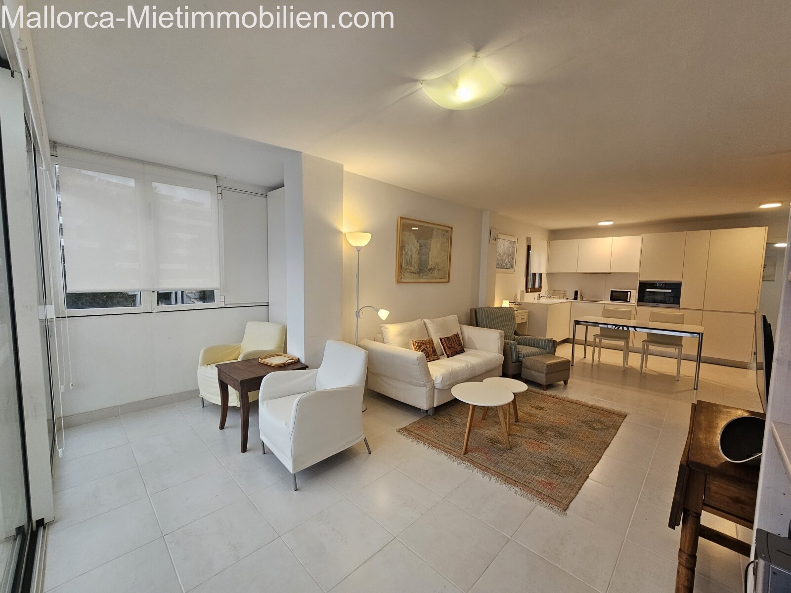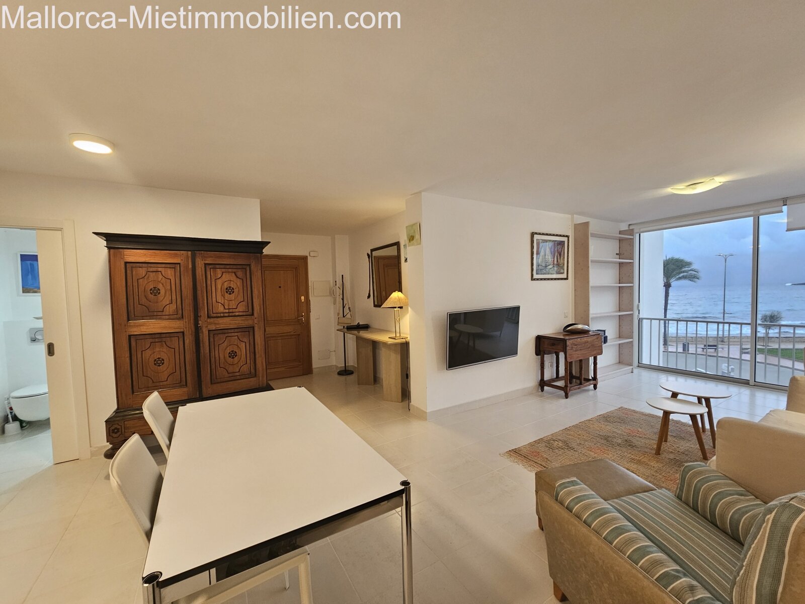 Apartment zu mieten in Cala Millor mit Balkon und Fahrstuhl: zauberhaftes, modernes Apartment in der ersten Linie – 20m Strandzugang. Offener Schnitt, wobei der Balkon direkt zum Wohnraum angegliedert und voll verglast wurde und bis auf ein Glaselement komplett aufzuschieben geht.