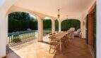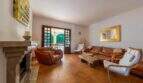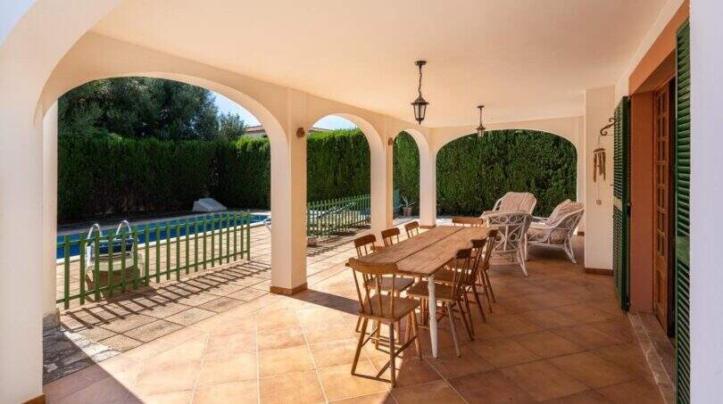 Inside, you are greeted by a spacious entrance area that reflects the elegant style of the house. A double door on the right leads into the impressive dining room, which offers enough space for a large dining table with up to 8 people. This is the ideal room for convivial evenings with family and friends. The adjoining kitchen, which is also accessible through a separate door from the dining room, offers a practical utility room with direct access to the outdoor terrace and pool area. There is also a separate guest WC and a shower room, which are easily accessible from the pool terrace. At the end of the central hallway is the spacious living room, which receives plenty of natural light through large patio doors and offers direct access to the covered terrace. The fireplace makes for a cozy atmosphere in the cooler months and invites you to relax in the evenings. The large, covered terrace, which is directly adjacent to the living room, offers the perfect place to relax outdoors while overlooking the private pool with all-day sunshine. Surrounded by a 4m high hedge, the pool area offers complete privacy.
