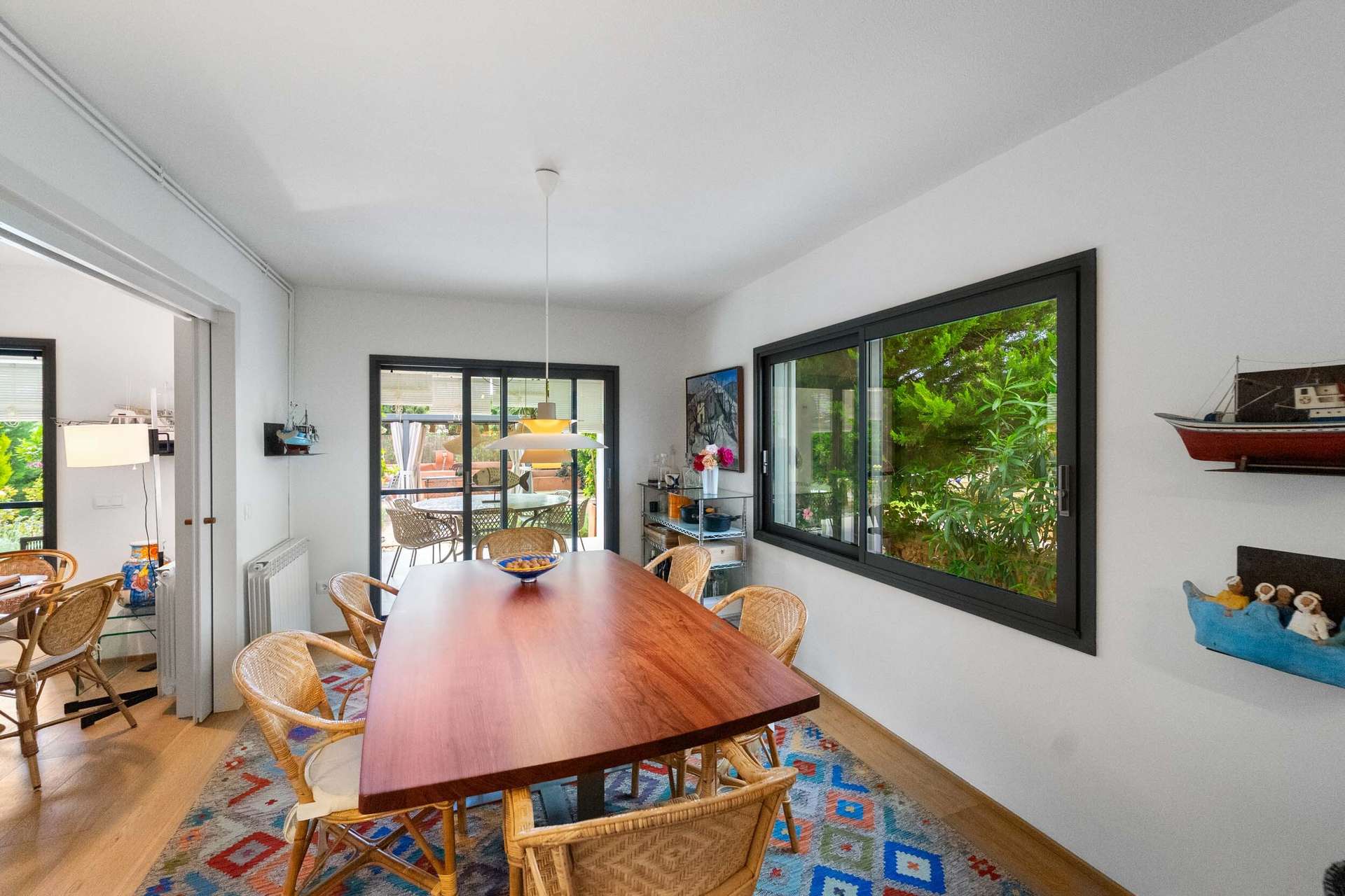 Im Erdgeschoss verbindet sich eine offene, voll ausgestattete Küche harmonisch mit dem Essbereich und einem großzügigen Wohnzimmer mit Kamin, wodurch ein gemütlicher und funktionaler Raum entsteht, der direkten Zugang zum Garten, zur Garage und zu einer überdachten Terrasse bietet, die dank dekorativer Lamellen Privatsphäre und eine angenehme Durchlüftung für das mediterrane Klima gewährleistet.