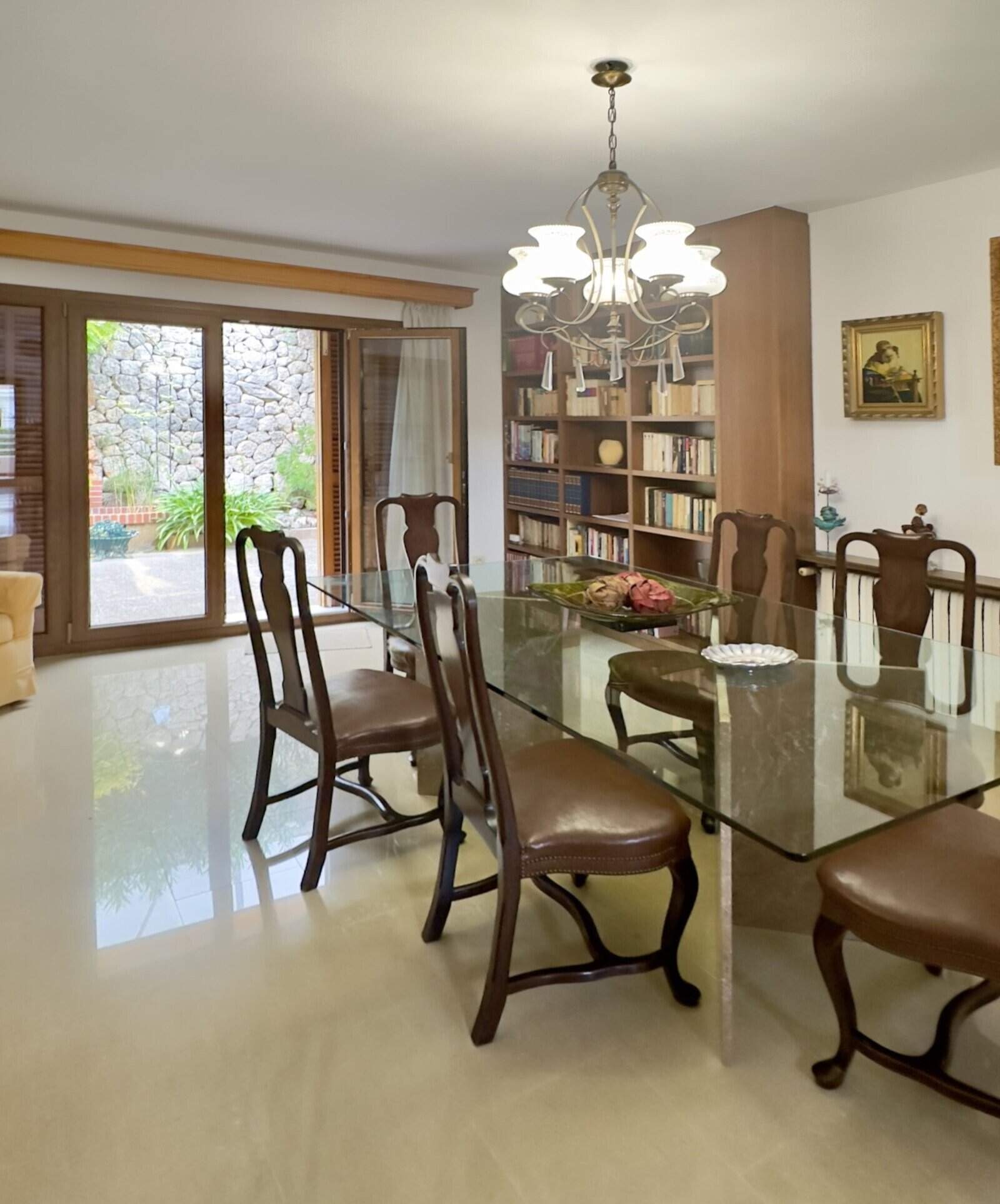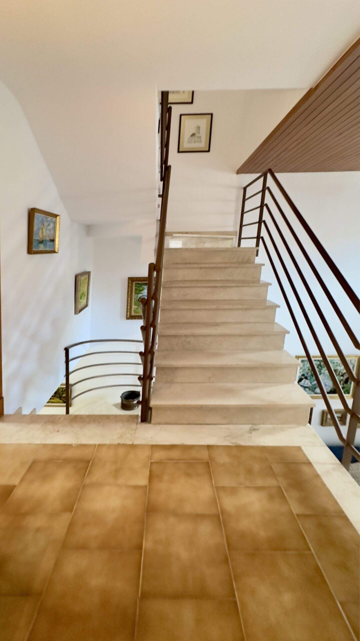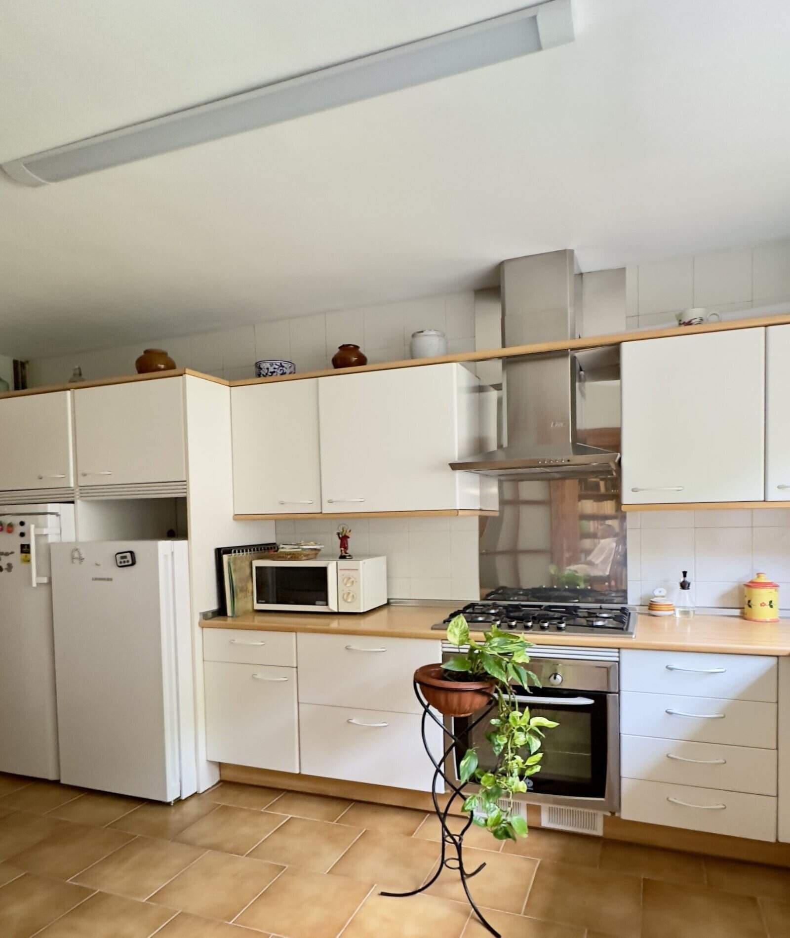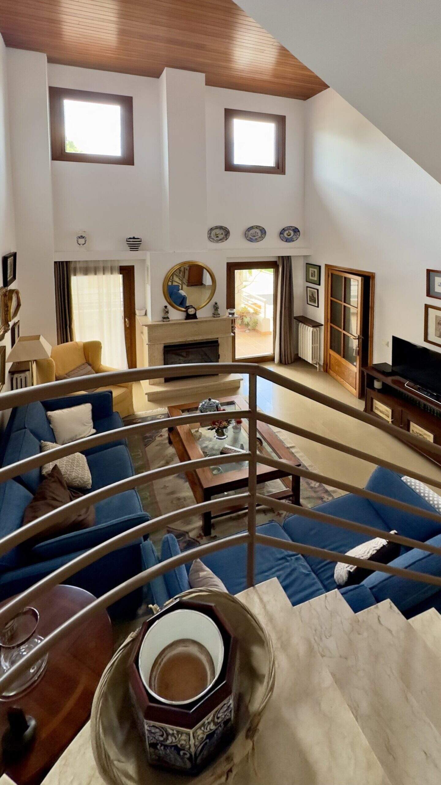 Un luminoso salón-comedor con chimenea y acceso directo a una terraza de 60 m² constituye la pieza central de la casa. Un total de cinco dormitorios, incluyendo un dormitorio principal con su propio cuarto de baño y balcón, ofrecen un montón de lugares para retirarse. Además de una cocina independiente y varios cuartos de baño, hay otras zonas útiles como un lavadero, una bodega y dos trasteros.