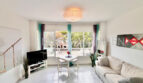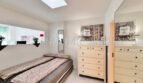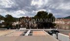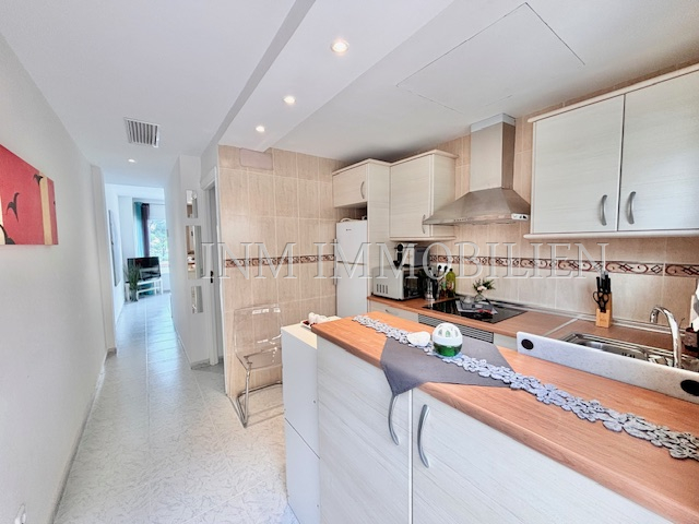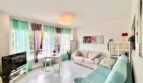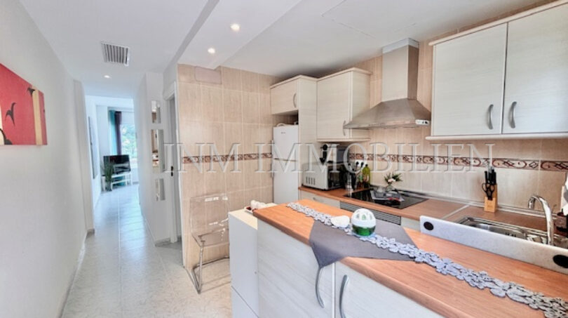 Beim Betreten des Apartments befindet sich auf der rechten Seite eine moderne, offene Einbauküche im amerikanischen Stil, gefolgt von einem gemütlichen Schlafbereich mit Bad en suite. Der Wohnbereich besticht durch große, weit zu öffnende Fensterfronten, die den Raum mit Licht durchfluten und ein großzügiges Raumgefühl schaffen. Von hier aus genießt man einen herrlichen Teilmeerblick, der durch die umliegenden Pinien einen besonders mediterranen Charme erhält.