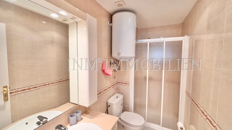 Zur Ausstattung gehören Klimaanlage warm/kalt, pflegeleichte Fliesenböden sowie Zugang zu einer schönen Gemeinschaftsanlage mit Terrasse und Pool – perfekt zum Entspannen nach einem Tag am Meer.