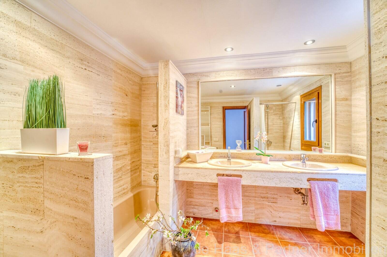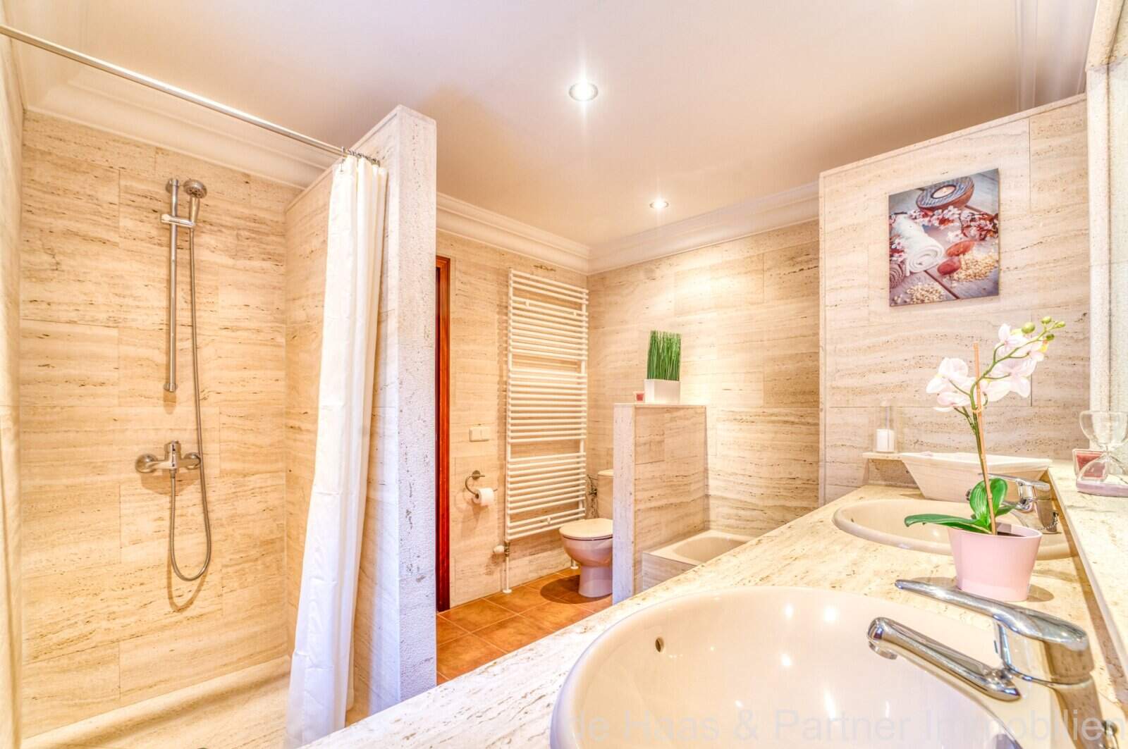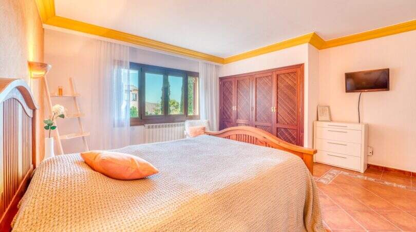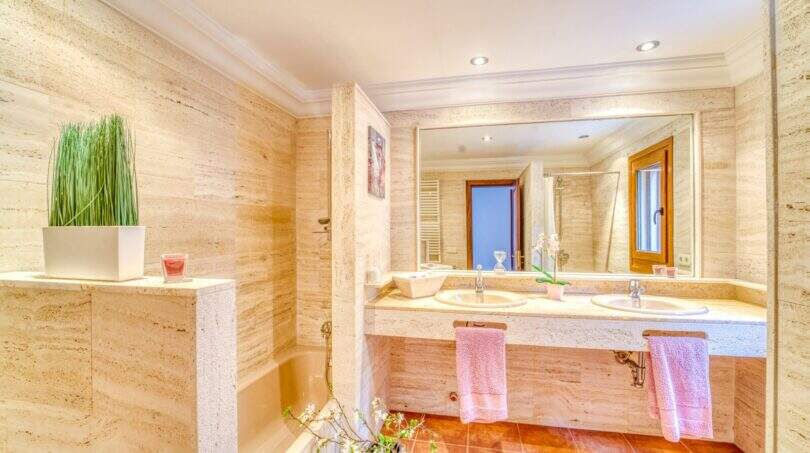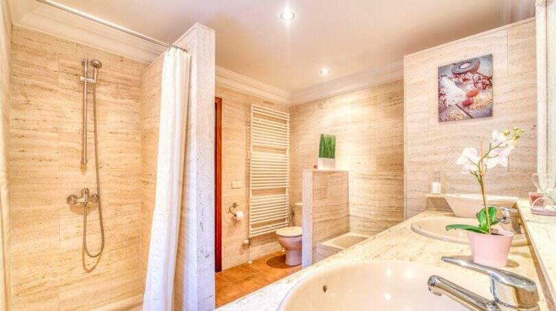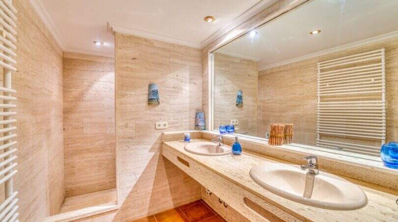Die Wohnfläche von ca. 380m² erstreckt sich über 2 Etagen und weist insgesamt 4 Schlafzimmer und 5 Bäder auf. Sie ist wie folgt aufgeteilt: Erdgeschoss: zwei helle und geräumige Wohnbereiche, einer mit offenem Esszimmerbereich und Kamin, der andere wird als Salon mit Poolbillard genutzt. Ein Duschbad steht im Erdgeschoss ebenfalls zur Verfügung. Die separate Küche, ein Hauswirtschaftsraum und ein Durchgangszimmer, welches z. Zt. als Büro fungiert, schließen sich dem Hauptwohnbereich an. Jeder Wohnbereich hat im Anschluss 2 sehr geräumige Schlafzimmer, je mit einem Vollbad mit Dusche und Badewanne.