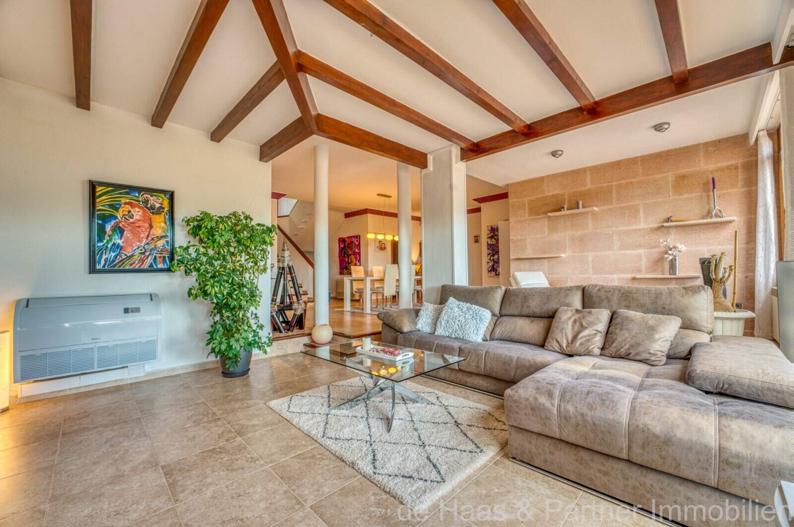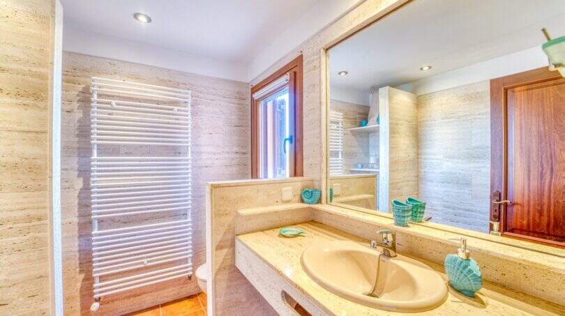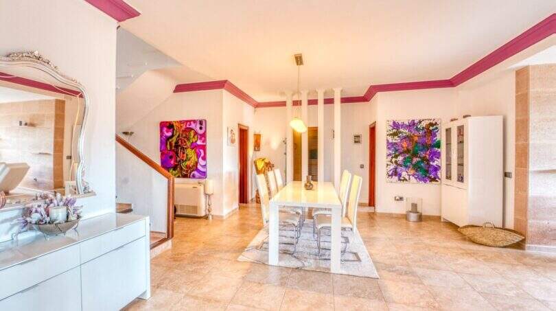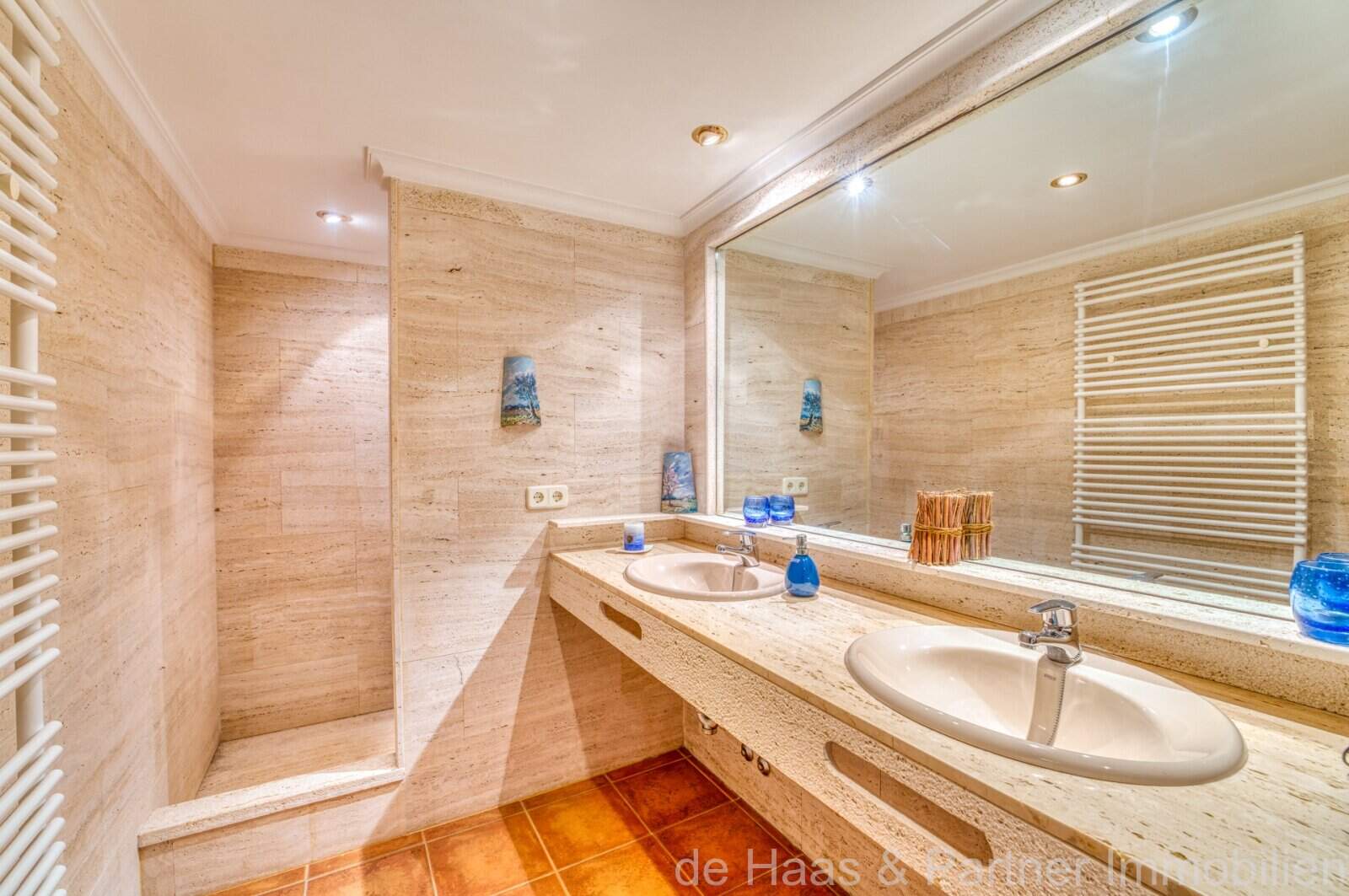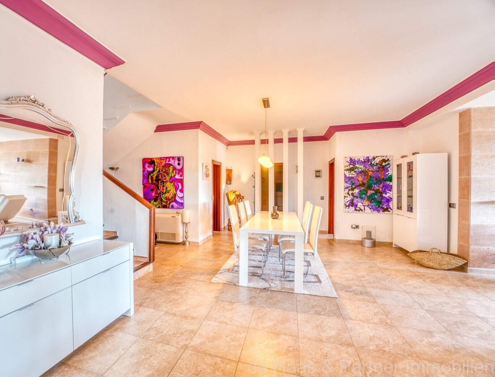 Die Wohnfläche von ca. 380m² erstreckt sich über 2 Etagen und weist insgesamt 4 Schlafzimmer und 5 Bäder auf. Sie ist wie folgt aufgeteilt: Erdgeschoss: zwei helle und geräumige Wohnbereiche, einer mit offenem Esszimmerbereich und Kamin, der andere wird als Salon mit Poolbillard genutzt. Ein Duschbad steht im Erdgeschoss ebenfalls zur Verfügung. Die separate Küche, ein Hauswirtschaftsraum und ein Durchgangszimmer, welches z. Zt. als Büro fungiert, schließen sich dem Hauptwohnbereich an. Jeder Wohnbereich hat im Anschluss 2 sehr geräumige Schlafzimmer, je mit einem Vollbad mit Dusche und Badewanne.