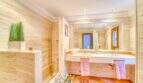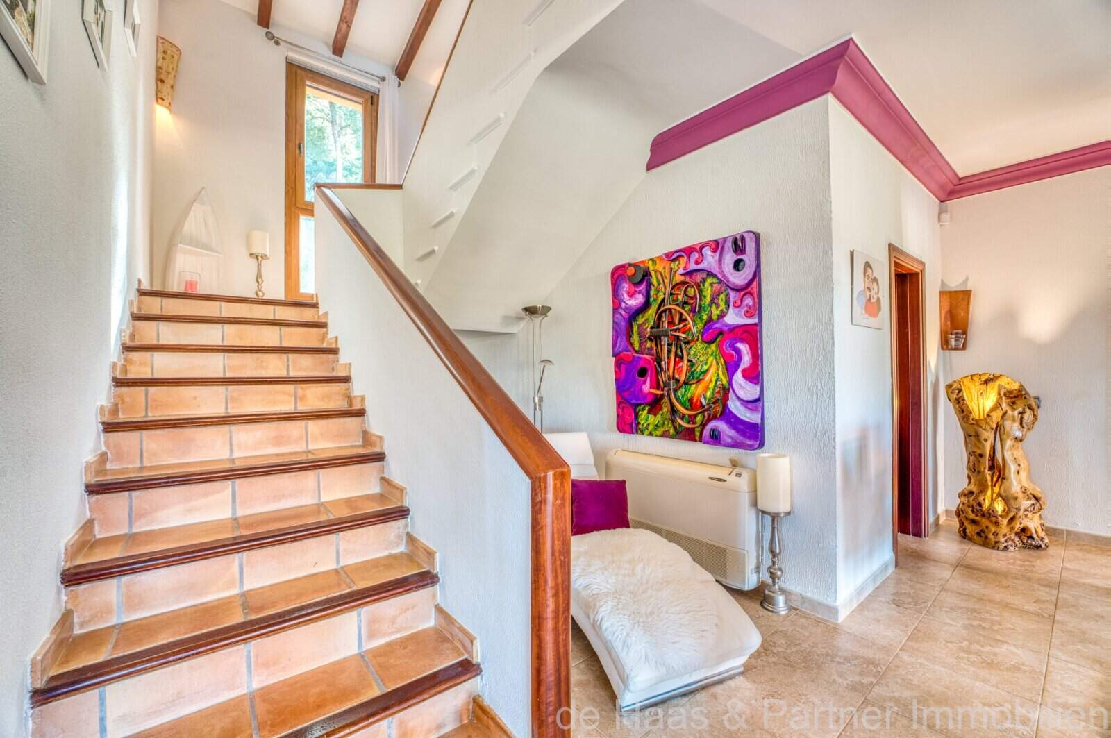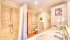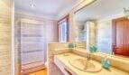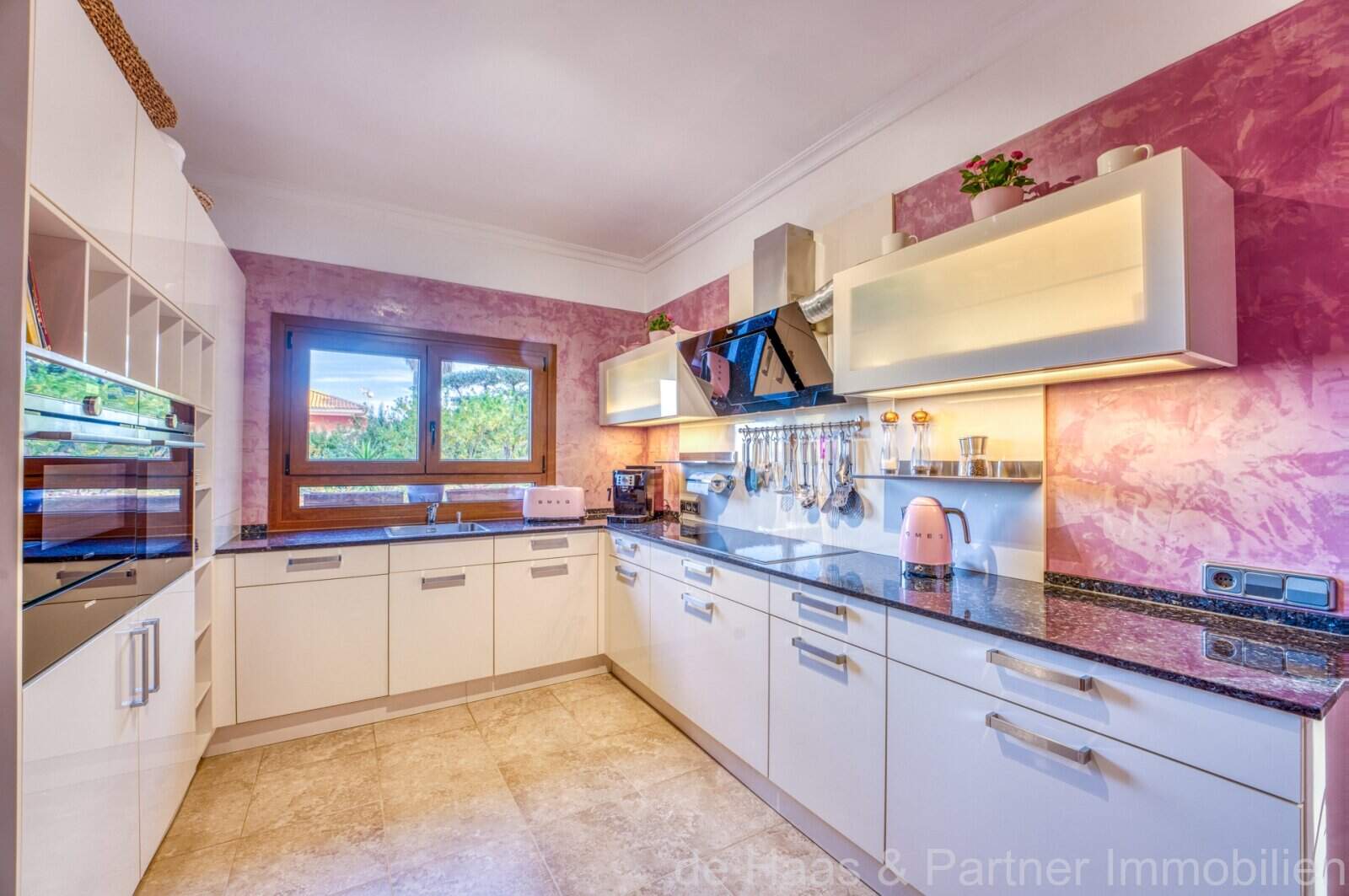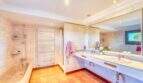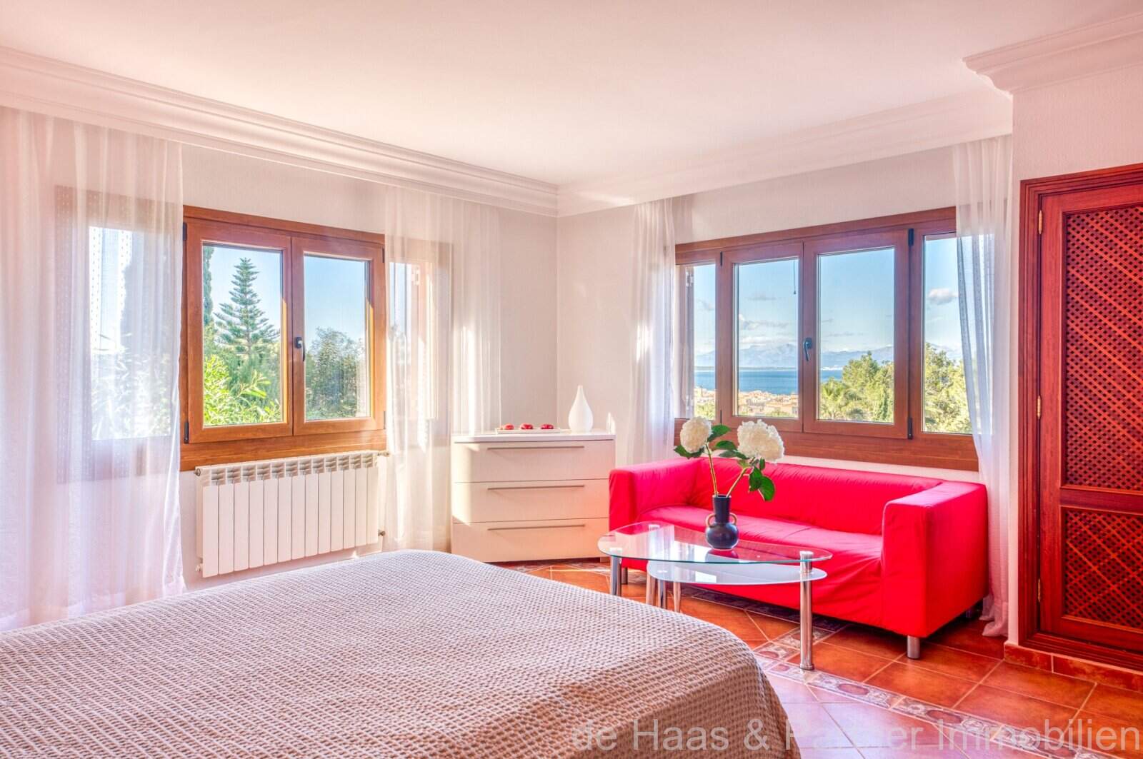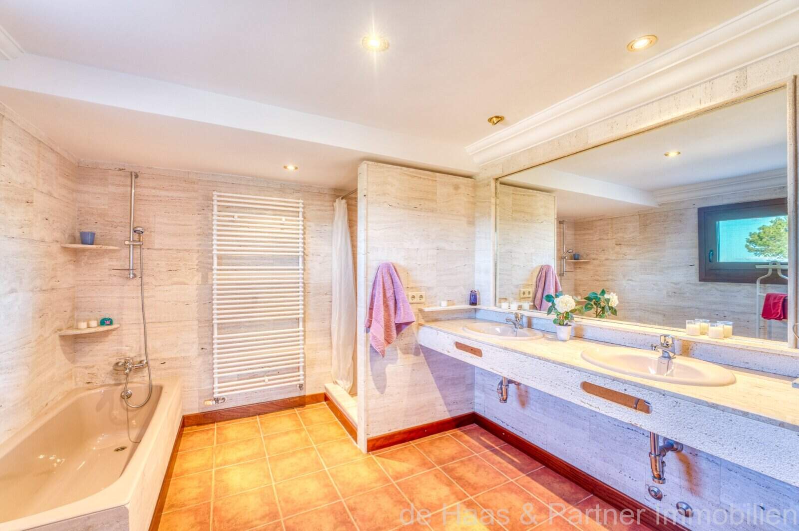 Die Wohnfläche von ca. 380m² erstreckt sich über 2 Etagen und weist insgesamt 4 Schlafzimmer und 5 Bäder auf. Sie ist wie folgt aufgeteilt: Erdgeschoss: zwei helle und geräumige Wohnbereiche, einer mit offenem Esszimmerbereich und Kamin, der andere wird als Salon mit Poolbillard genutzt. Ein Duschbad steht im Erdgeschoss ebenfalls zur Verfügung. Die separate Küche, ein Hauswirtschaftsraum und ein Durchgangszimmer, welches z. Zt. als Büro fungiert, schließen sich dem Hauptwohnbereich an. Jeder Wohnbereich hat im Anschluss 2 sehr geräumige Schlafzimmer, je mit einem Vollbad mit Dusche und Badewanne.