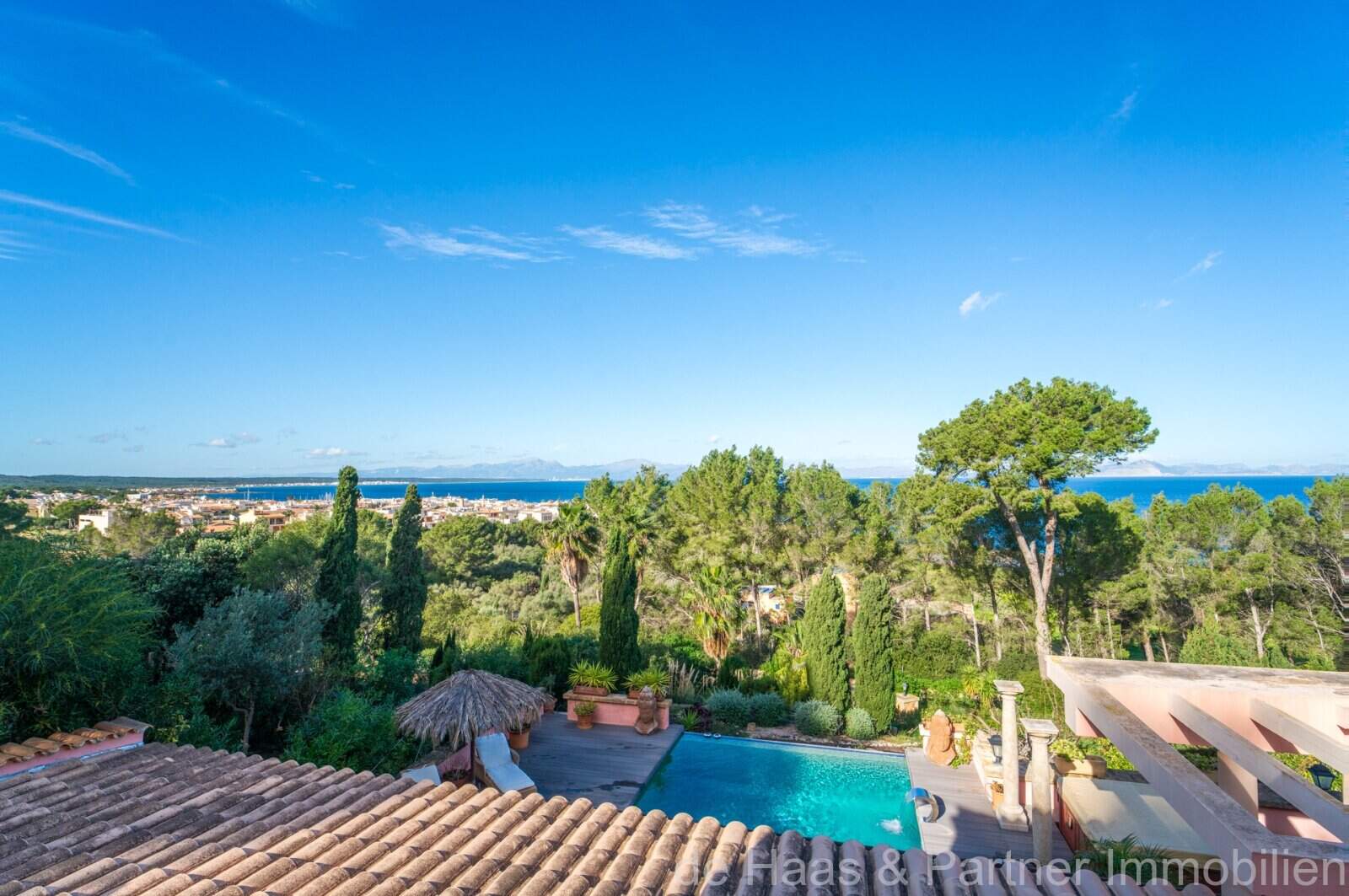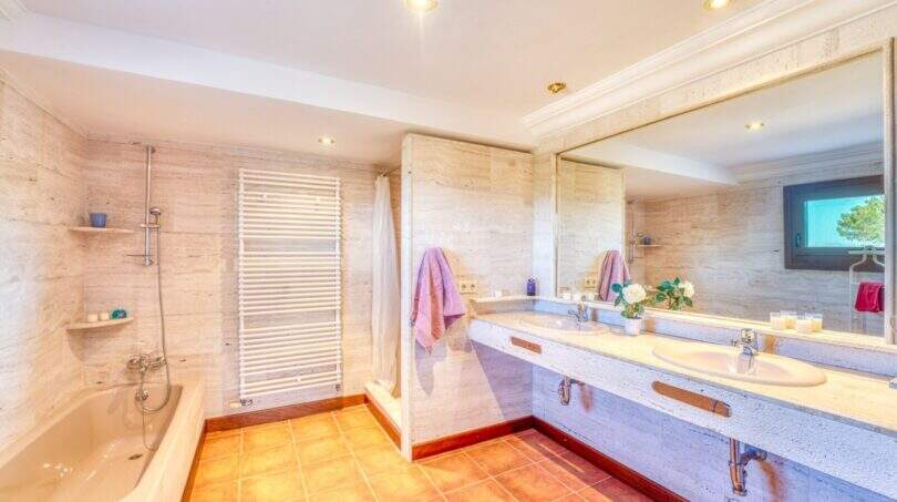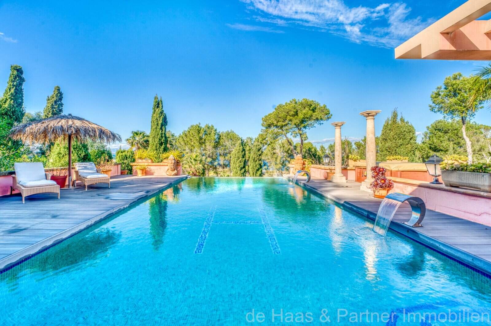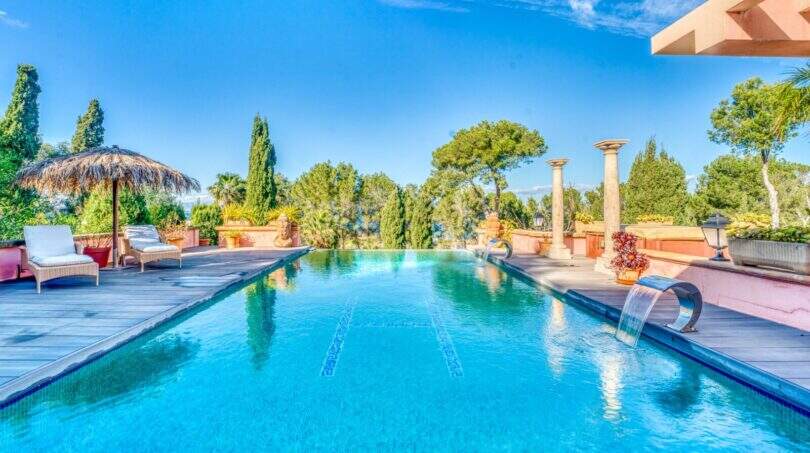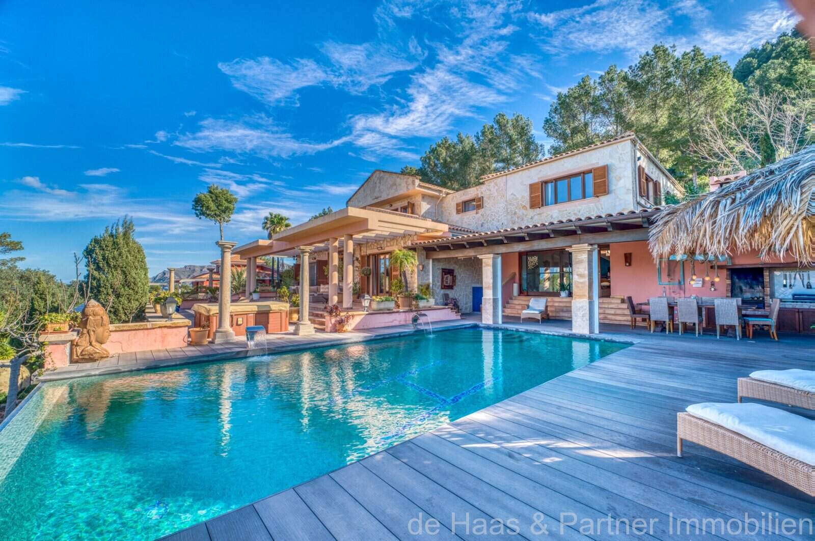 Von den großzügigen Terrassenflächen rund ums Casa (ca. 190m²), von denen ca. 60m² überdacht sind, haben Sie einen spektakulären Panoramablick bis zum Meer und die Nordküste. Der BBQ-Bereich mit Außenküche am Pool bietet die Möglichkeit, mit Freunden gemütliche Abende zu verbringen. Der beheizbare Überlauf-Pool mit 50m² und ein extra Whirlpoolbereich bieten ganzjährige Nutzung.