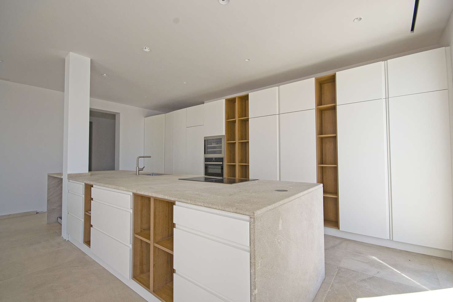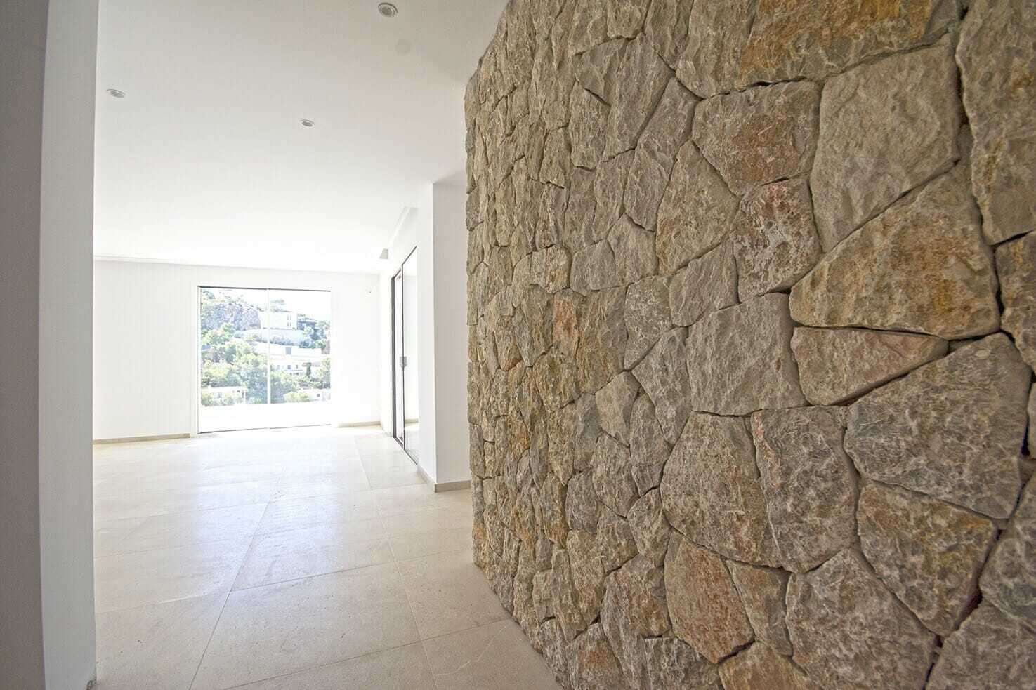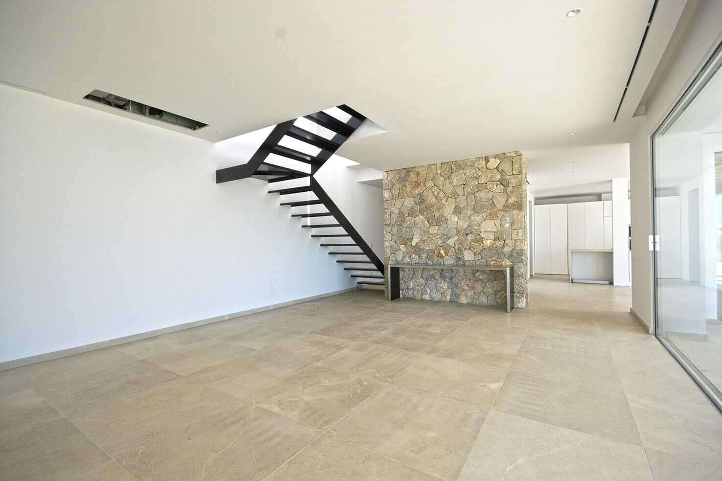 Mehrere Terrassen, Pool und Porche strukturieren den Außenbereich. Im mit außergewöhnlich hochwertigen Materialien ausgebauten Innenbereich befindet sich ein sehr großer Wohn-Essbereich und daran anschließend eine ultramoderne Küche, die durch das Wechselspiel zwischen Marmor, weißen Einbauschränken und naturfarbenem Holz besticht. Die Treppe aus Stahl vor der Natursteinmauer ist fast unsichtbar und führt auf die nächste Ebene. 4 Schlafzimmer mit Bädern und Einbauschränken lassen keine Wünsche offen.