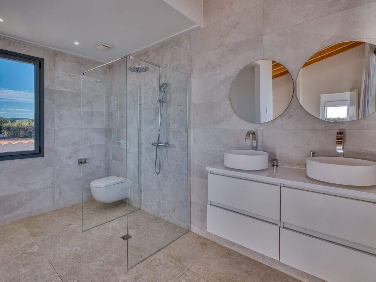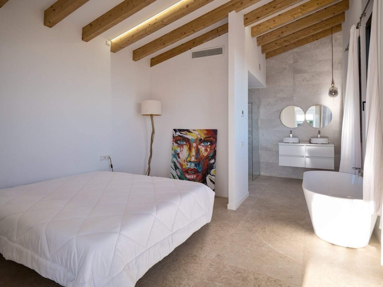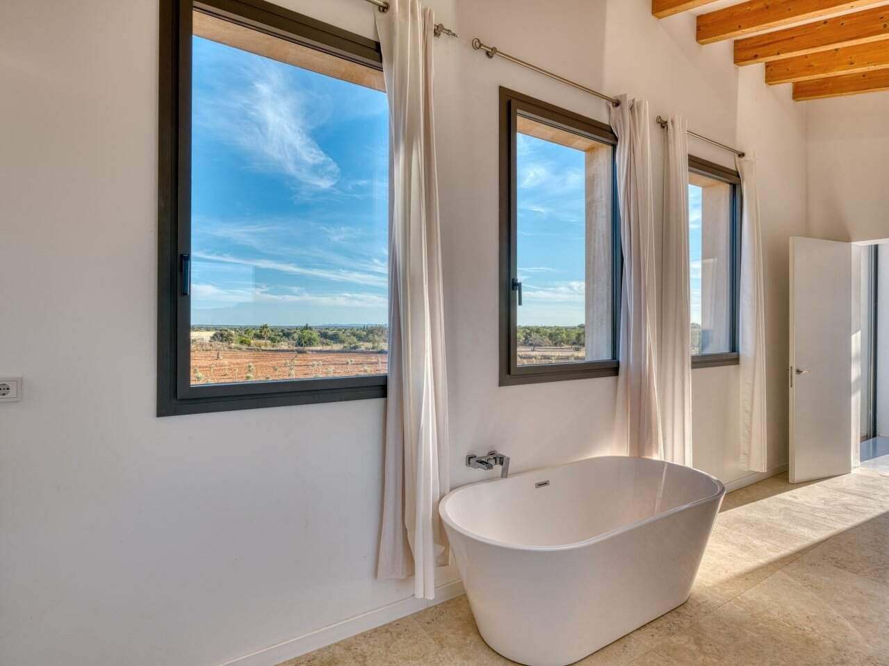 Das Obergeschoss ist vollständig dem Masterbereich gewidmet: Ein großzügiges Schlafzimmer mit eigenem Bad, eleganter Badewanne und privater Sonnenterrasse. Auch hier sorgen raumhohe Fensterflächen für eine helle, offene Atmosphäre und ermöglichen einen unvergleichlichen Blick über die umliegende Landschaft.