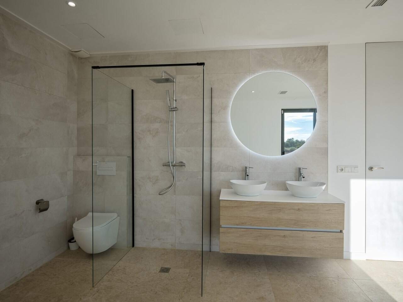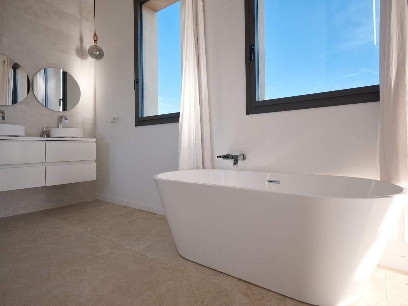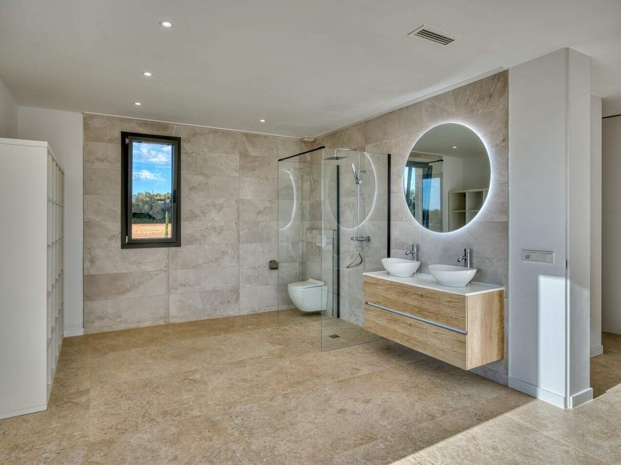 Das Obergeschoss ist vollständig dem Masterbereich gewidmet: Ein großzügiges Schlafzimmer mit eigenem Bad, eleganter Badewanne und privater Sonnenterrasse. Auch hier sorgen raumhohe Fensterflächen für eine helle, offene Atmosphäre und ermöglichen einen unvergleichlichen Blick über die umliegende Landschaft.