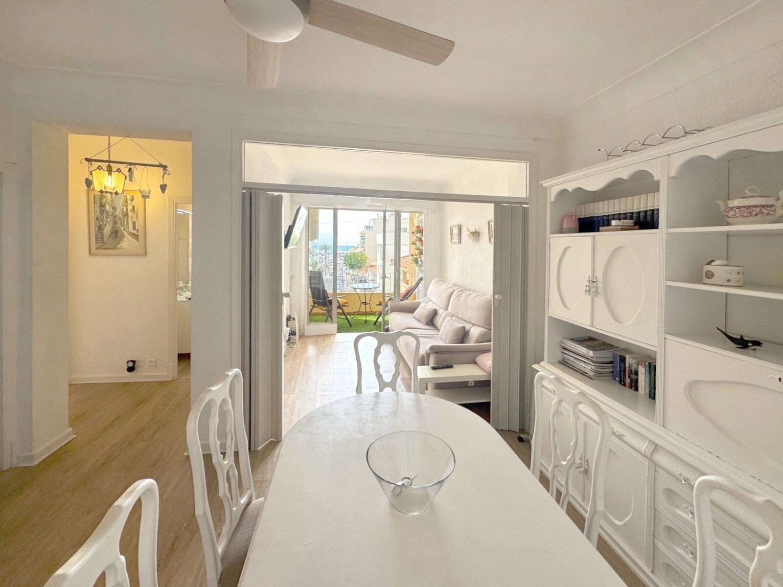 Die Wohnung verfügt über zwei helle Schlafzimmer mit praktischen Einbauschränken sowie ein modernes Badezimmer. Der offene Wohnbereich ist lichtdurchflutet und führt direkt auf eine großzügige Terrasse mit traumhaftem Panoramablick auf die Insel.