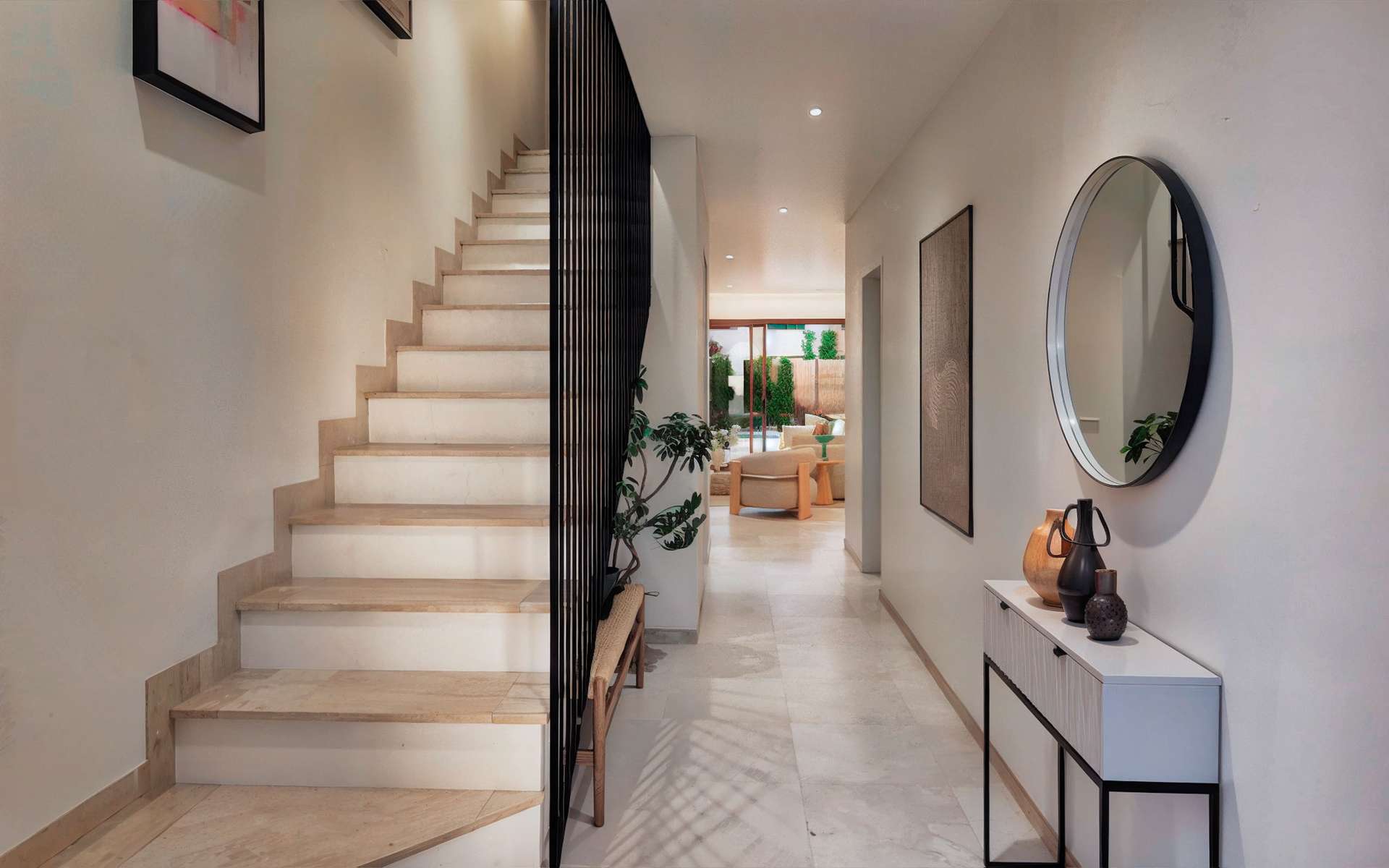 Das Erdgeschoss verfügt über einen gemütlichen Bereich mit einer Designer-Küche, ausgestattet mit Bosch-Geräten, Silestone-Arbeitsplatten, Grohe-Armaturen und einer intelligenten Klimatisierung und Fußbodenheizung. Im Obergeschoss befindet sich ein Waschraum – ein Detail, das die Funktionalität des Hauses optimiert.