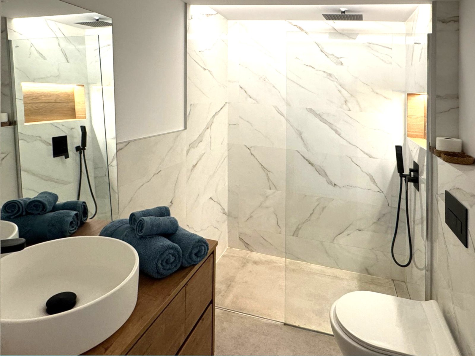 - Cuarto de baño de alta calidad: El cuarto de baño está diseñado con gusto y le ofrece un ambiente lujoso con modernas instalaciones sanitarias y mucho espacio.