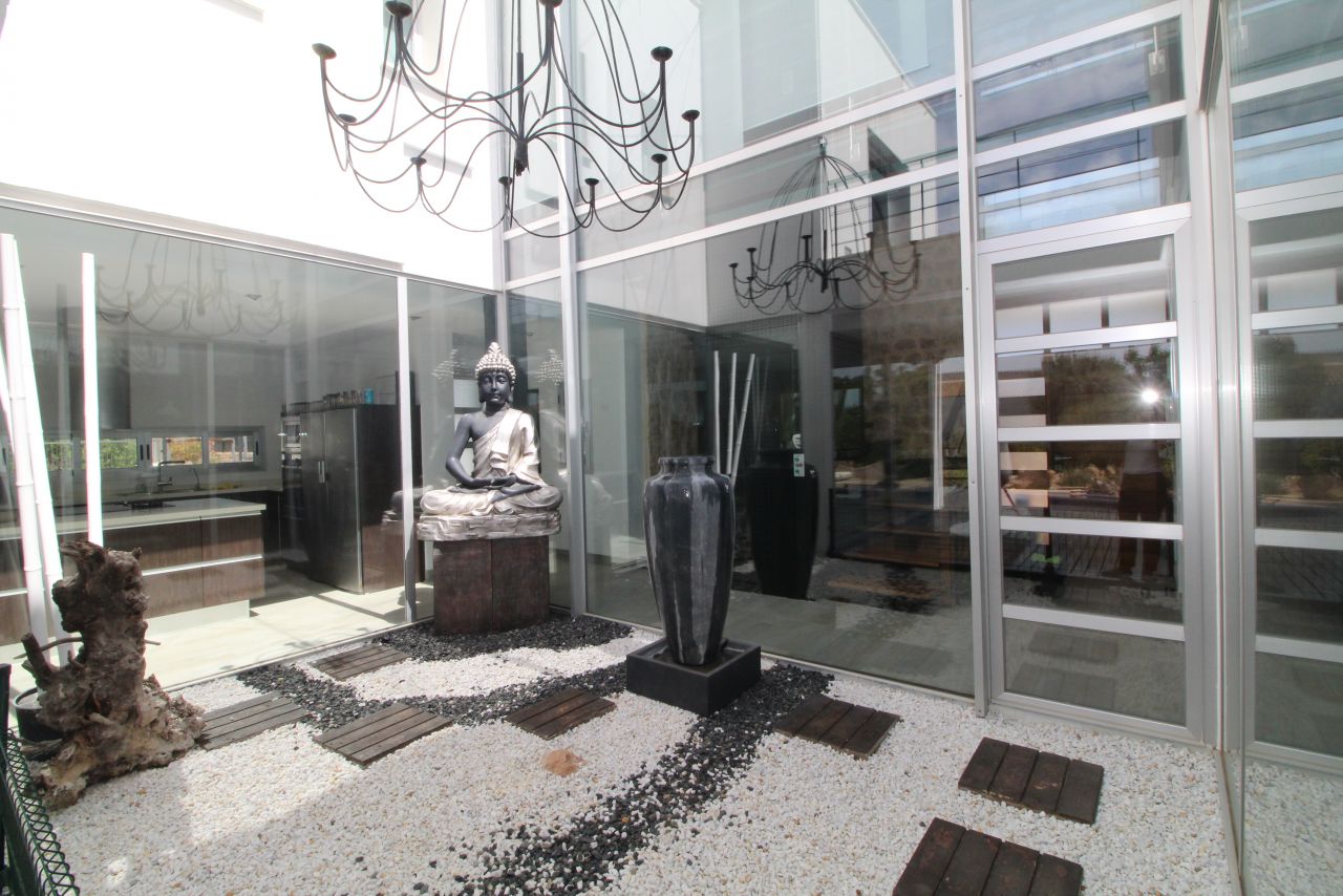 Im Erdgeschoss befinden sich das Wohnzimmer mit Kamin, die Küche sowie ein großes Schlafzimmer mit Badezimmer. Ein Patio im fernöstlichen Stil fügt sich harmonisch in das Casa ein und lädt zum Entspannen ein. Große Glasfronten verbinden ihn mit Küche und Wohnbereich.