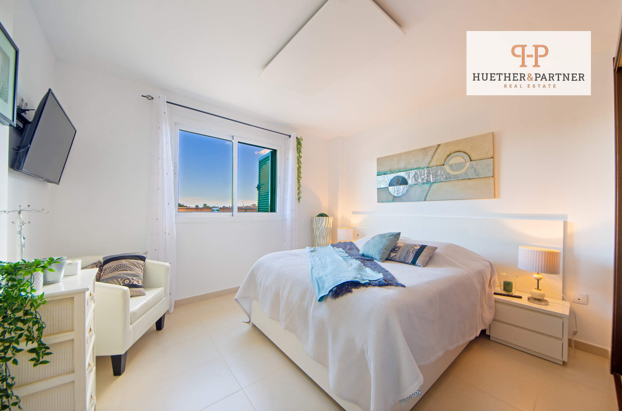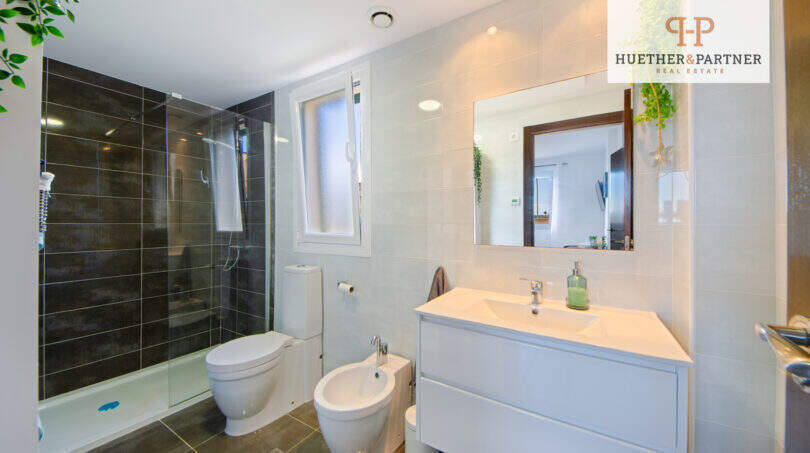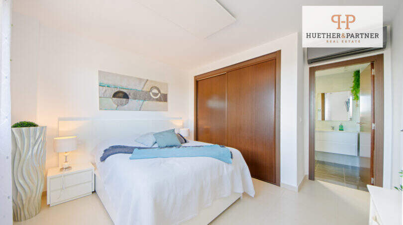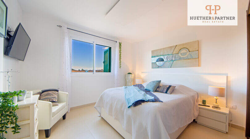 Im Obergeschoss befindet sich das Master-Bedroom mit eigenem en-suite-Duschbad. Von hier gelangen Sie auch auf die großzügige Dachterrasse, die mit einem zauberhaften Ausblick begeistert – der perfekte Ort für Sonnenuntergänge oder einen Kaffee am Morgen.