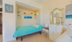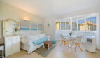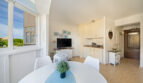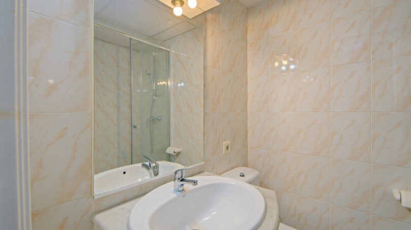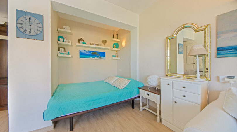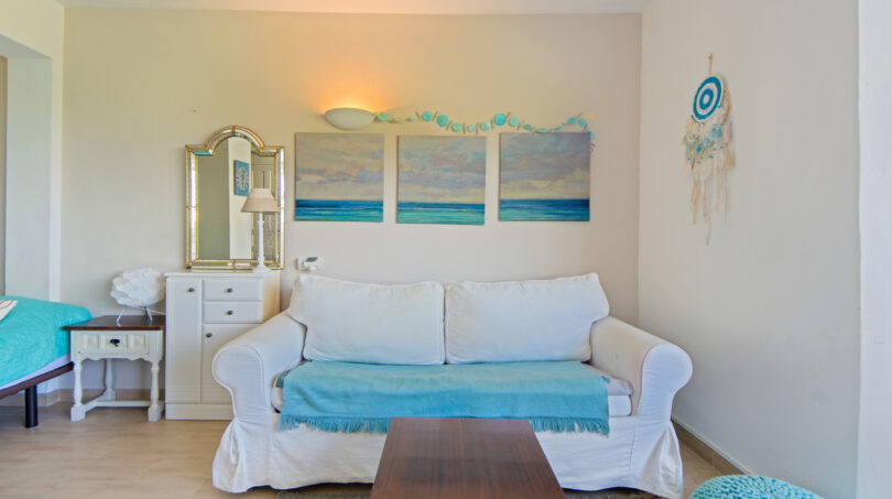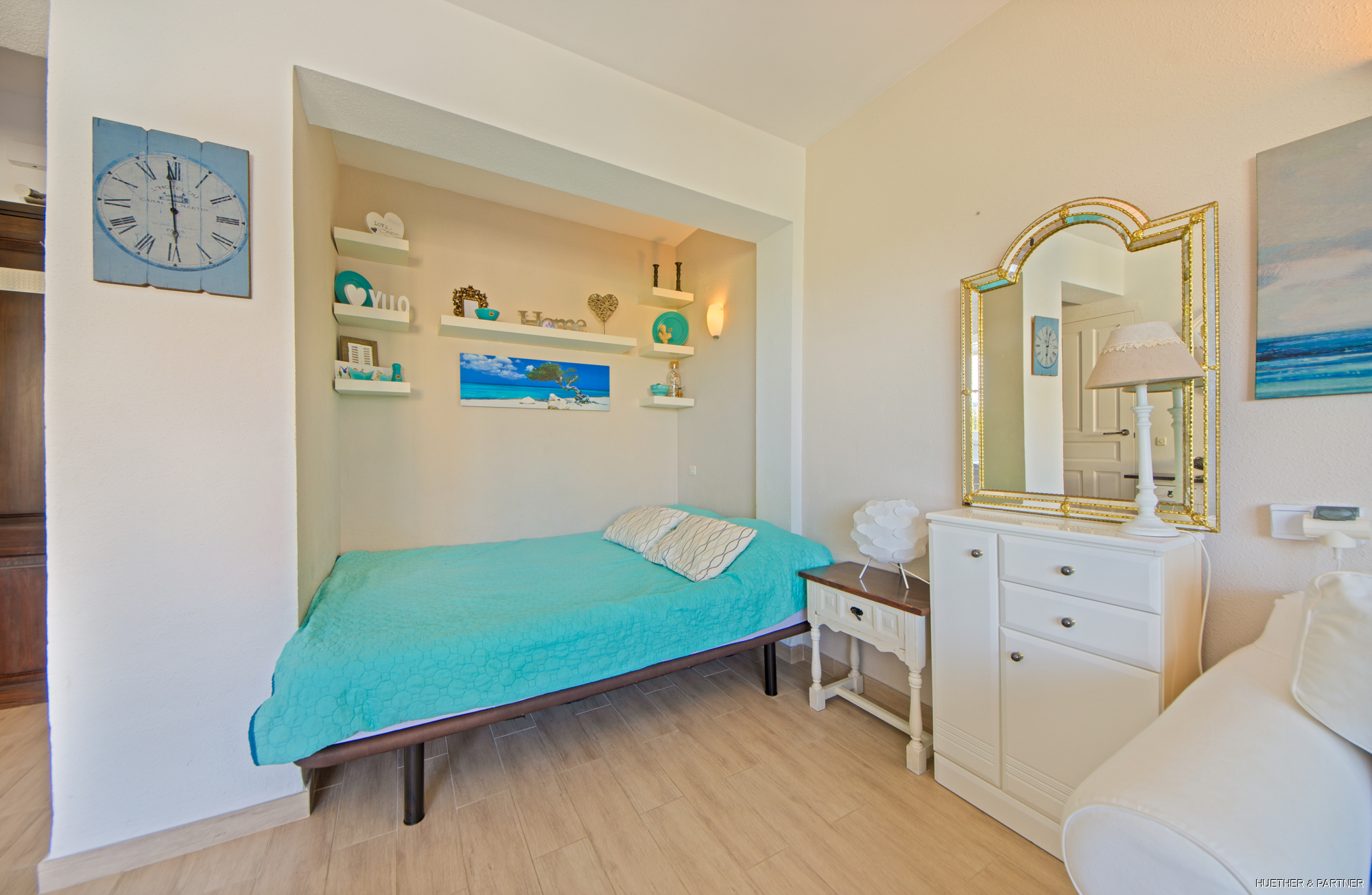 En Plano liegt in einer höheren Etage und bietet dadurch einen herrlichen seitlichen Meerblick sowie einen malerischen Blick auf die umliegenden Hügel der mallorquinischen Landschaft.Das helle Wohn- und Schlafzimmer ist offen gestaltet und funktional eingerichtet. Eine kompakte Pantry-Küche ermöglicht die Zubereitung kleiner Mahlzeiten. Das Badezimmer ist zweckmäßig ausgestattet und verfügt über Dusche, Waschbecken und WC.
