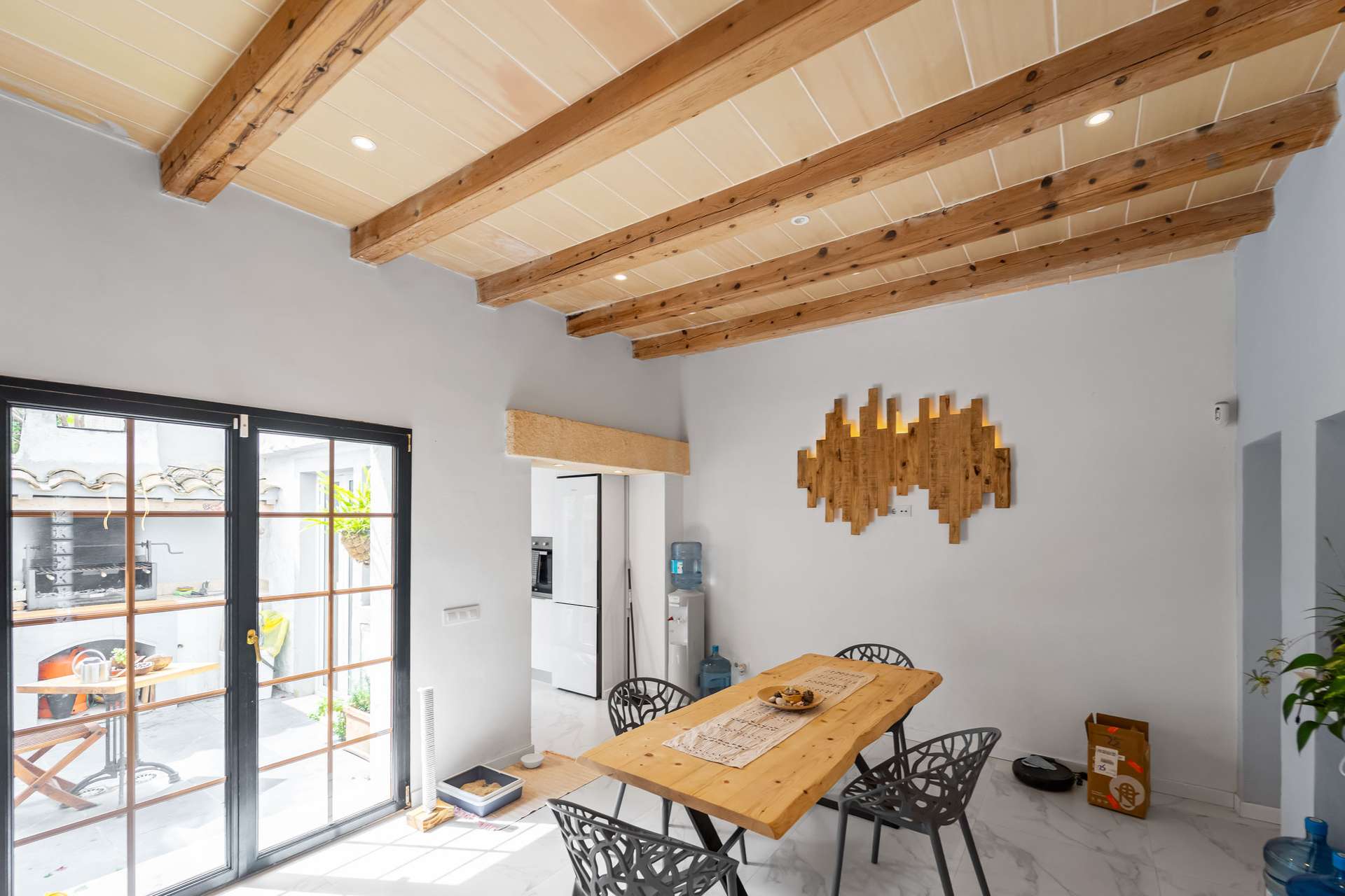 Bei der vor zwei Jahren durchgeführten Komplettrenovierung wurde besonders auf die Details geachtet, wobei originale Elemente wie die freiliegenden Balken erhalten wurden, die dem Ganzen Wärme und Authentizität verleihen.