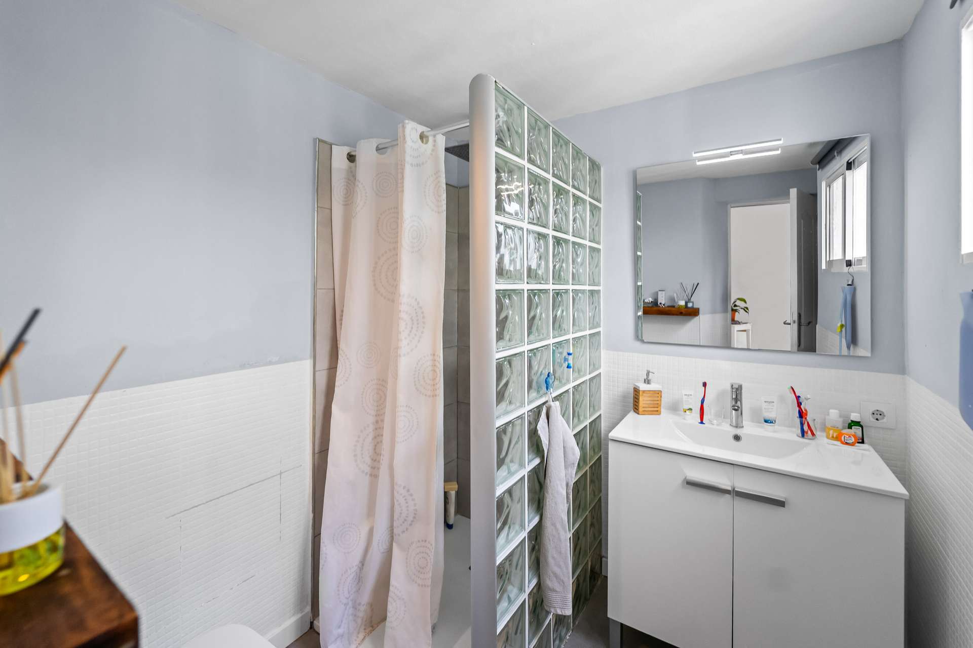 Eine elegante Freitreppe führt in den ersten Stock, wo sich drei Außenschlafzimmer befinden, die alle über Einbauschränke und viel Tageslicht verfügen. Ein Badezimmer mit begehbarer Dusche befindet sich auf dieser Etage, die auch zwei kleine Terrassen bietet, die zum Entspannen einladen.