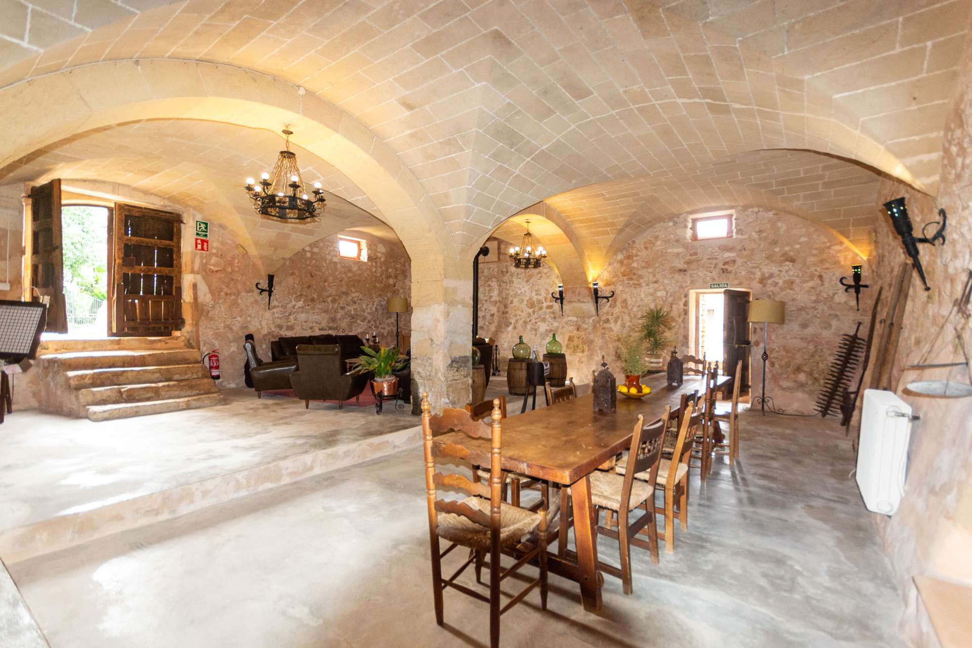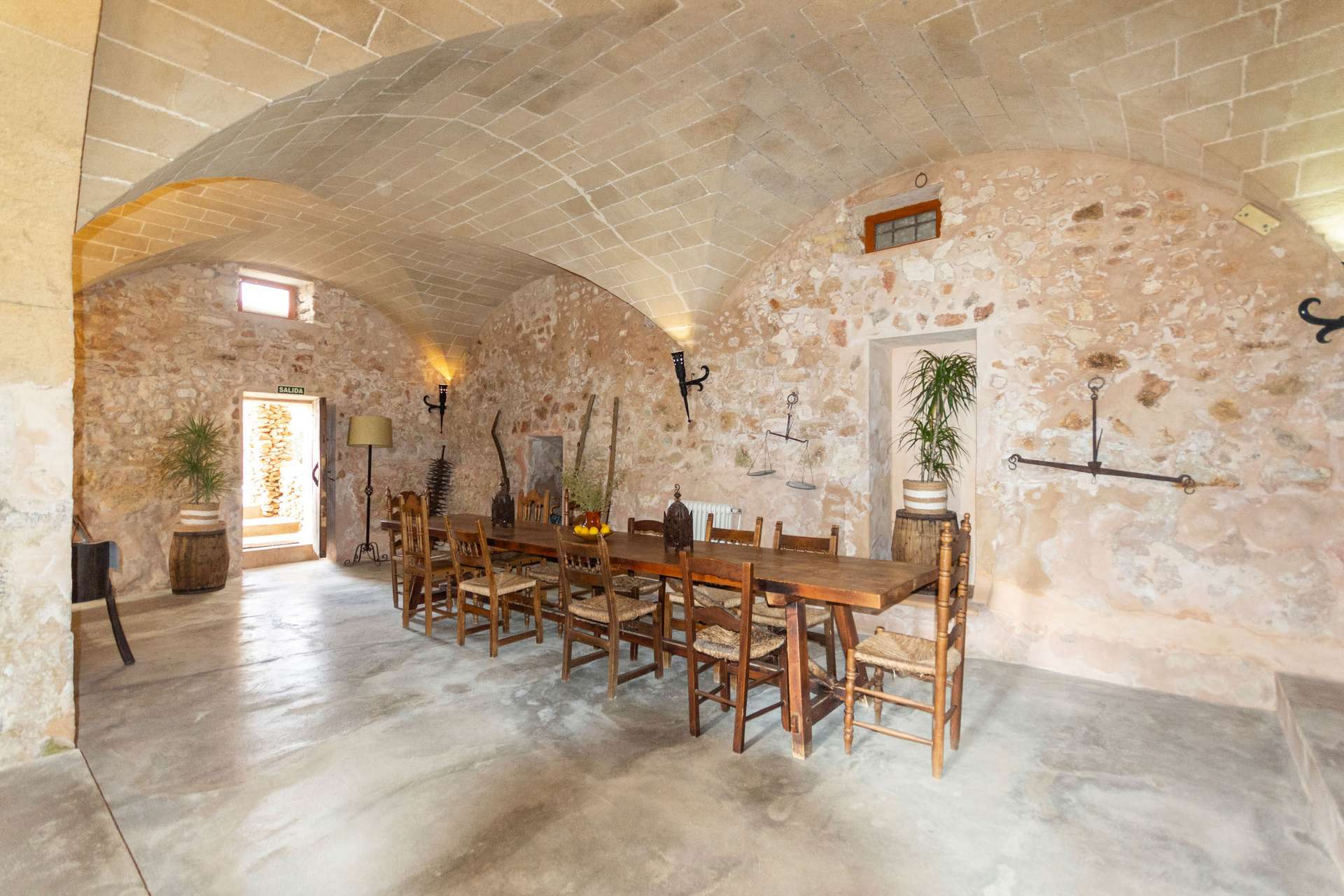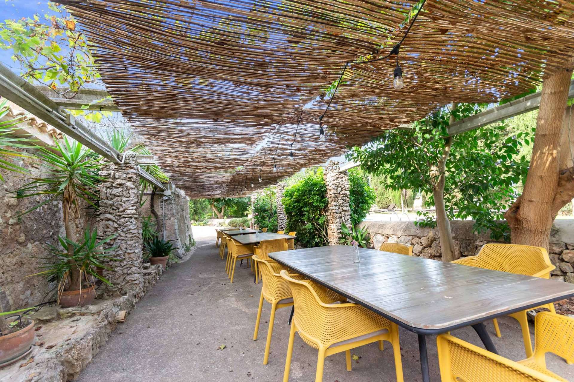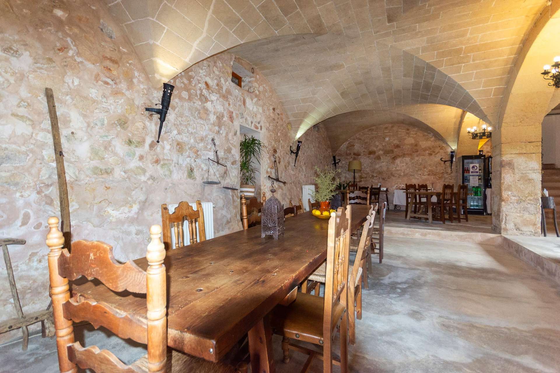 Auf einem 35.000 m² großen Grundstück steht eine Gesamtwohnfläche von 1.500 m² zur Verfügung. Zu den Gemeinschaftsbereichen gehören das Esszimmer und das Lese-/Spielzimmer. Der Speisesaal bietet Platz für 80 Personen und verfügt über die originalen sechseckigen Gewölbe, die seine mallorquinische Authentizität bewahren. Der Speisesaal eignet sich perfekt für Hochzeiten, Taufen und alle anderen Veranstaltungen.