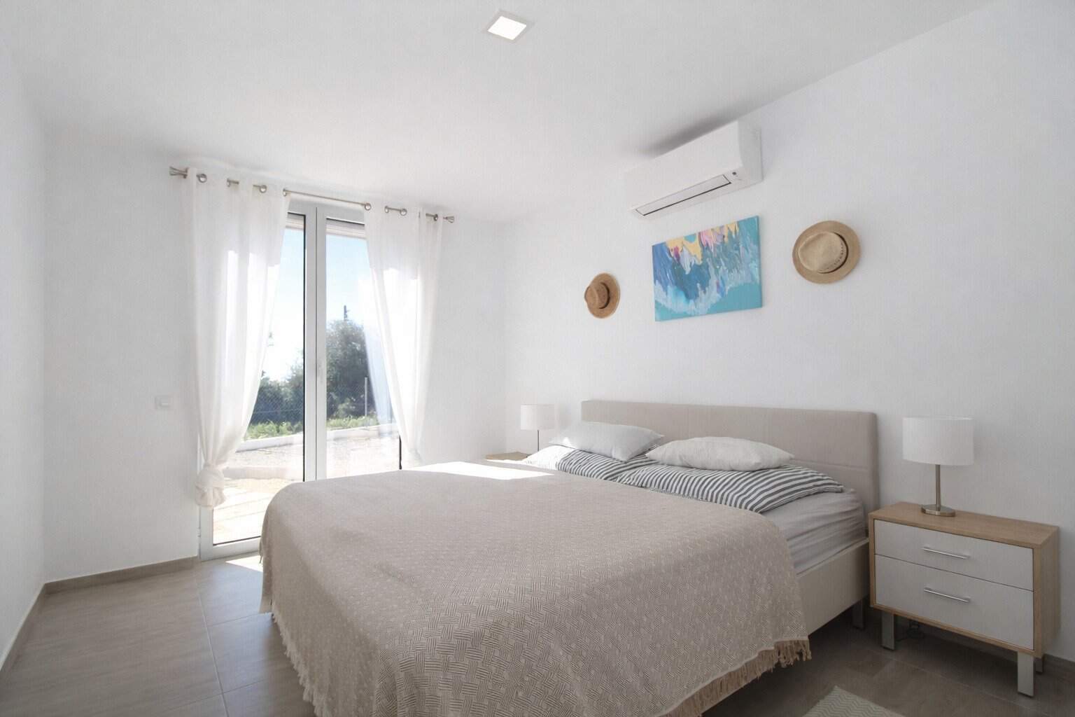 Bereits beim Betreten offenbart sich die Großzügigkeit des Hauses: Der offen gestaltete Wohn- und Essbereich ist lichtdurchflutet und bildet das Herzstück der Immobilie. Bodentiefe Fenster schaffen fließende Übergänge zwischen Innen- und Außenbereich und eröffnen sowohl vom Wohnraum als auch von der Küche aus einen herrlichen Meerblick. Die direkte Verbindung zur Terrasse und zum 2, 8 x 9m großen Salzwasserpool unterstreicht das exklusive Wohngefühl und macht dieses Anwesen zu einer erstklassigen Immobilie auf Mallorca. Die drei komfortablen Schlafzimmer überzeugen durch ihre Helligkeit und ihren unmittelbaren Zugang zur Terrasse. Zwei der insgesamt drei eleganten Badezimmer sind en suite konzipiert und bieten ein Höchstmaß an Privatsphäre. Die durchgängige Ausrichtung aller Schlafräume zum Außenbereich schafft eine besondere Wohnatmosphäre mit viel Licht und Weite.