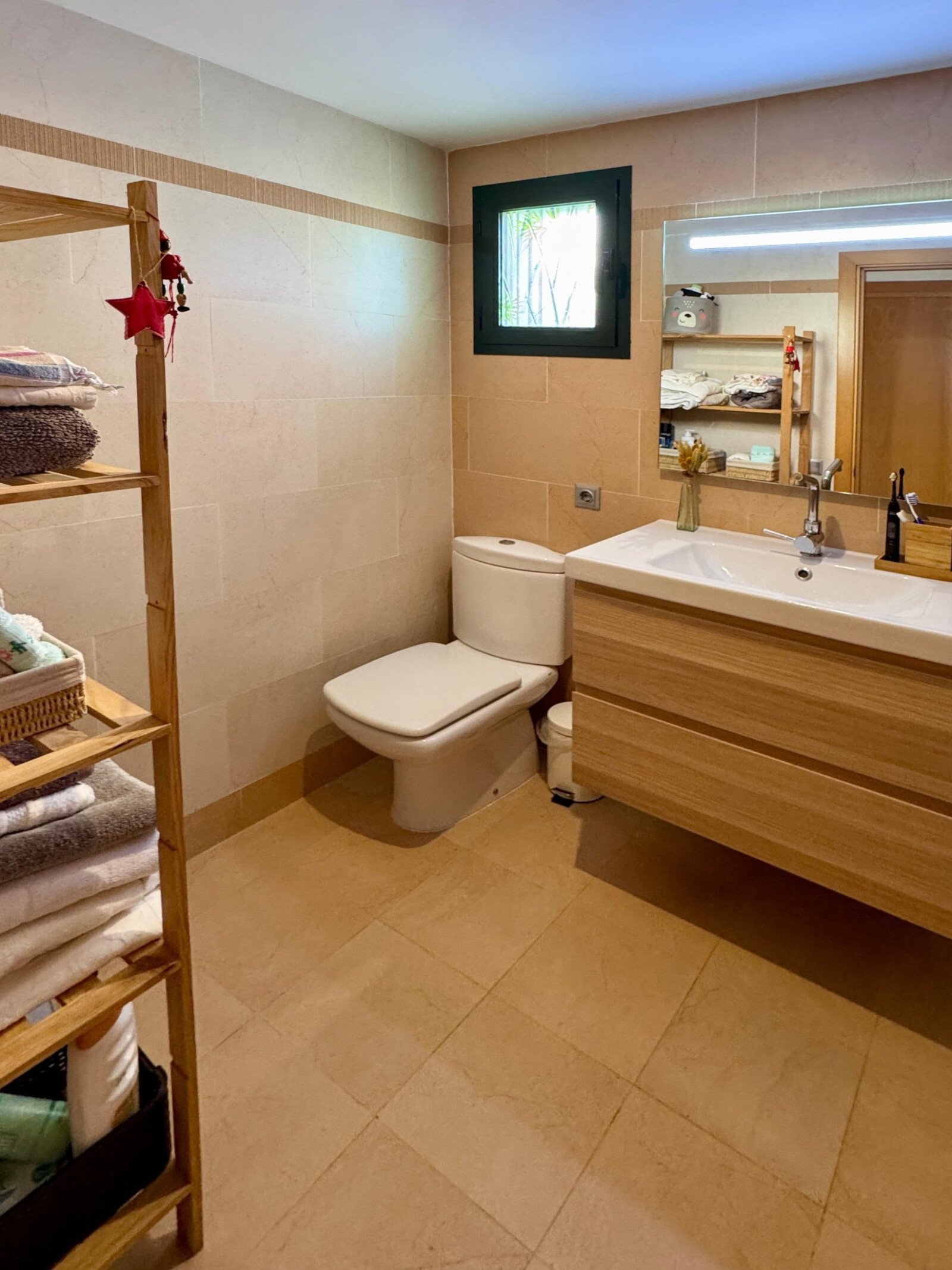 Das elegante Anwesen verfügt über zwei großzügige Schlafzimmer sowie zwei moderne Badezimmer, wobei eines in einer luxuriösen En-Suite-Variante gestaltet ist. Die lichtdurchfluteten Wohnräume sind durch große Fensterflächen mit direktem Zugang zur großzügigen Terrasse verbunden, die einen herrlichen Blick auf den gepflegten Pool und den grünen Garten bietet. Die offene Einbauküche ist mit hochwertigen Einbauten ausgestattet und bietet optimale Bedingungen für stilvolles Kochen und gesellige Zusammenkünfte. Die separate Waschküche sorgt für zusätzlichen Komfort und unterstützt eine praktische Alltagsorganisation. Kürzlich wurden die Außenschreinereien erneuert und sind mit Moskitonetzen versehen, um Fenster- und Türöffnungen auch in den warmen Monaten angenehm zu gestalten.