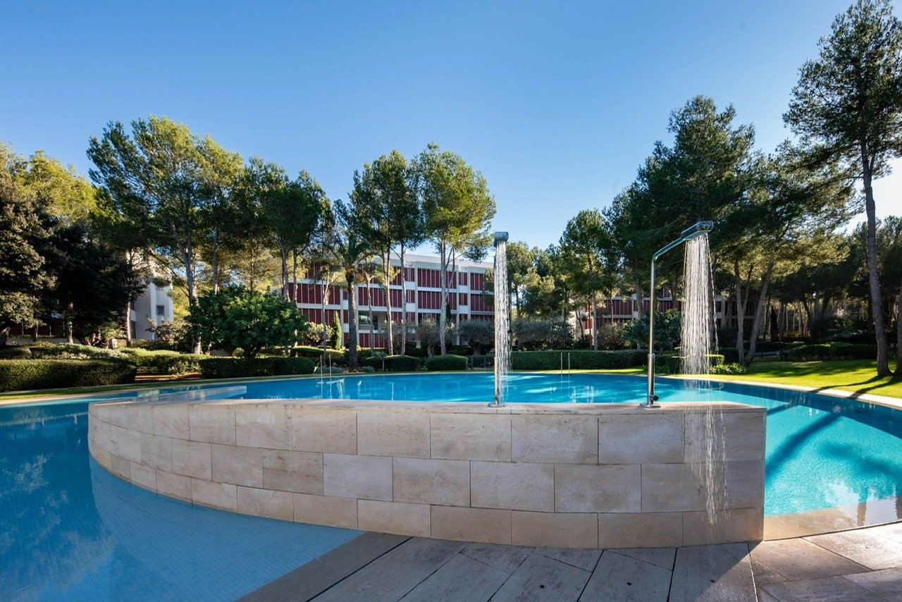 Einladend präsentiert sich auch der private Poolbereich, umgeben von gepflegten Grünflächen – eine Oase der Ruhe mitten im begehrten Südwesten Mallorcas. Weitere Annehmlichkeiten wie ein Aufzug, eine sichere Tiefgarage und die Nähe zu Restaurants, Boutiquen und Stränden machen dieses Objekt zu einem echten Highlight.