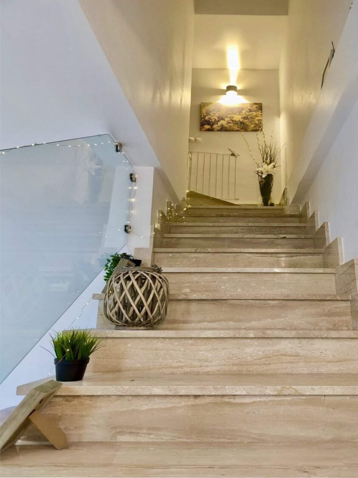 ein lichtdurchflutetes Wohn- und Esszimmer mit offener, modern ausgestatteter Küche schafft einen großzügigen, einladenden Raum, in dem geselliges Leben und entspanntes Wohnen harmonisch verschmelzen. Von hier gelangen Sie direkt auf die 18m² große Terrasse mit Grillbereich – ideal, um das mediterrane Klima und die umliegende Natur ganzjährig zu genießen. Die geschlossene Aluminium-Waschküche sorgt für zusätzliche Funktionalität, während die moderne Marmortreppe mit Glasgeländer Eleganz und Transparenz zwischen den Etagen schafft.