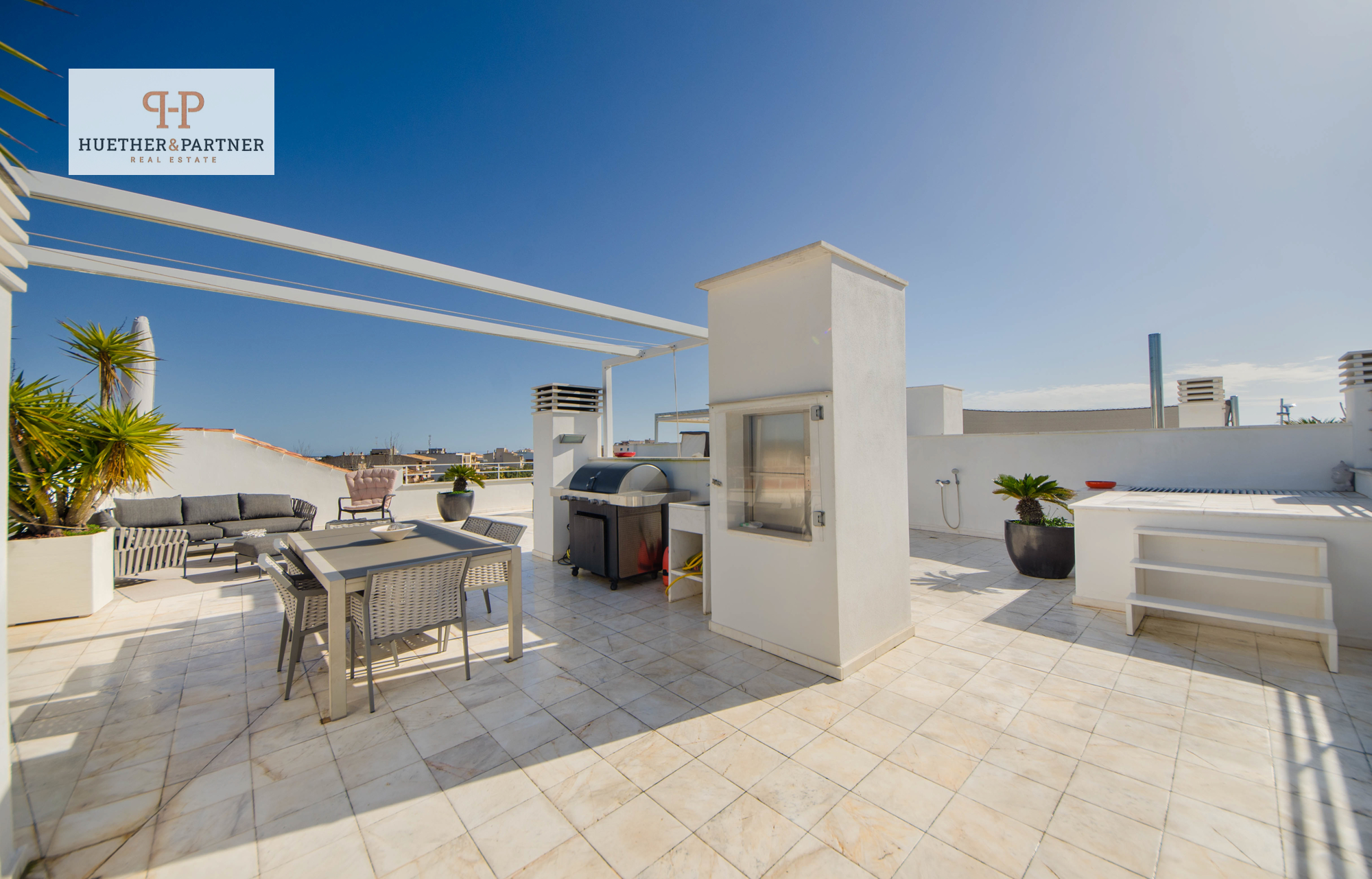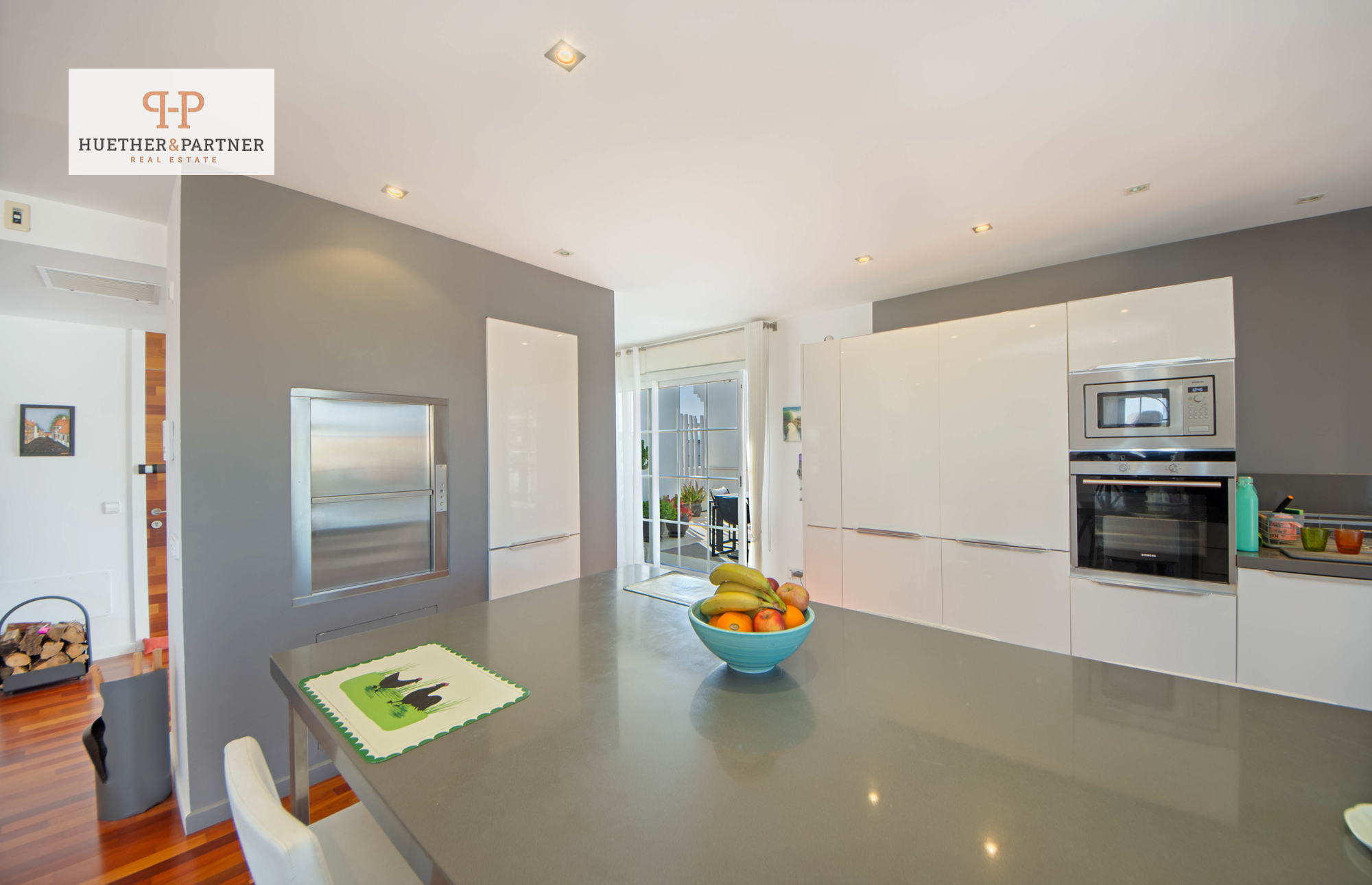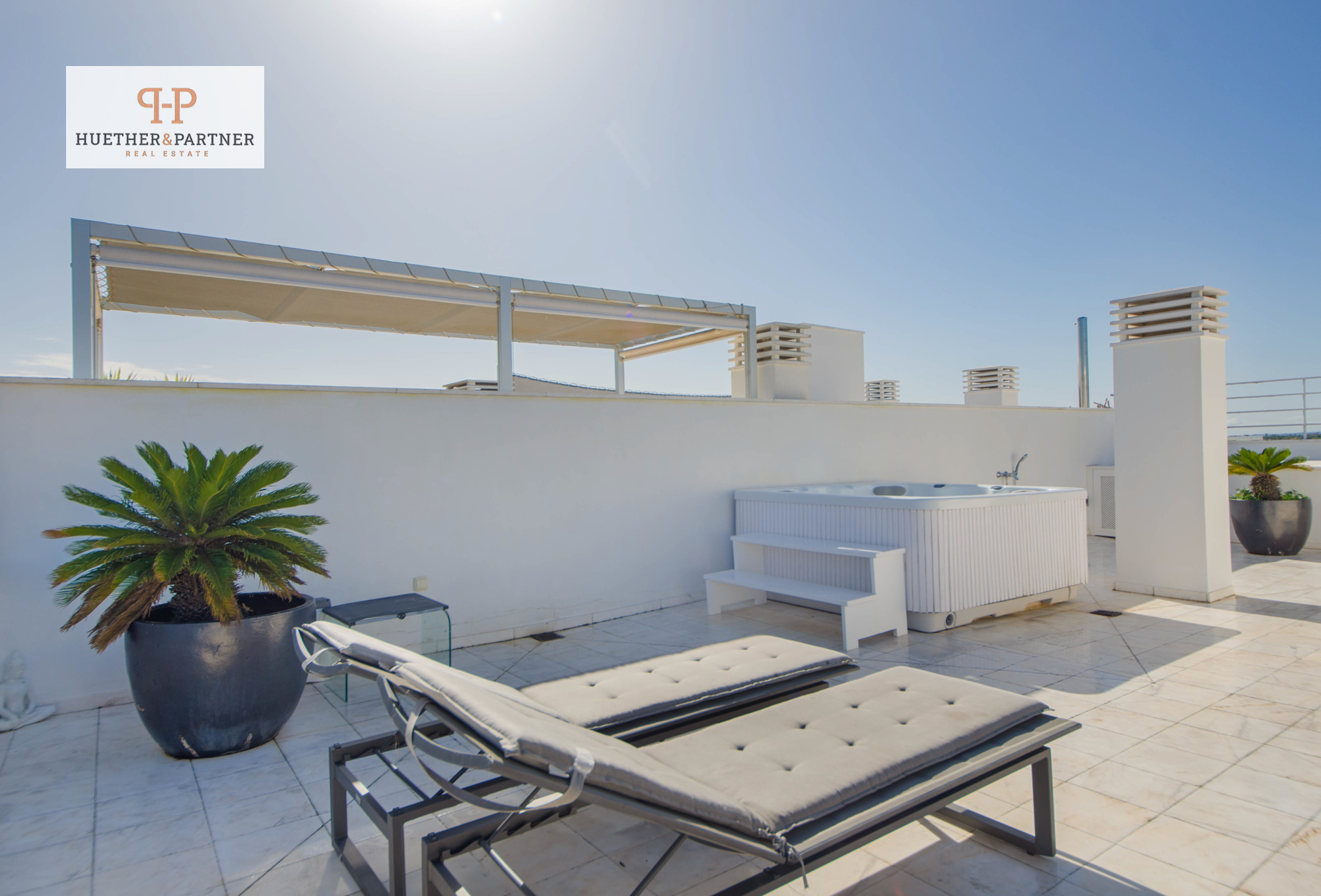 Eine Wendeltreppe führt Sie auf die beeindruckende Dachterrasse, die mit hochwertigen Außenmöbeln, einem Gasgrill und einem Whirlpool ausgestattet ist. Ein kleiner Lastenfahrstuhl sorgt dafür, dass Sie einen direkten Kontakt zur Küche haben. Der herrliche Rundumblick lässt Sie die Welt drumherum vergessen.