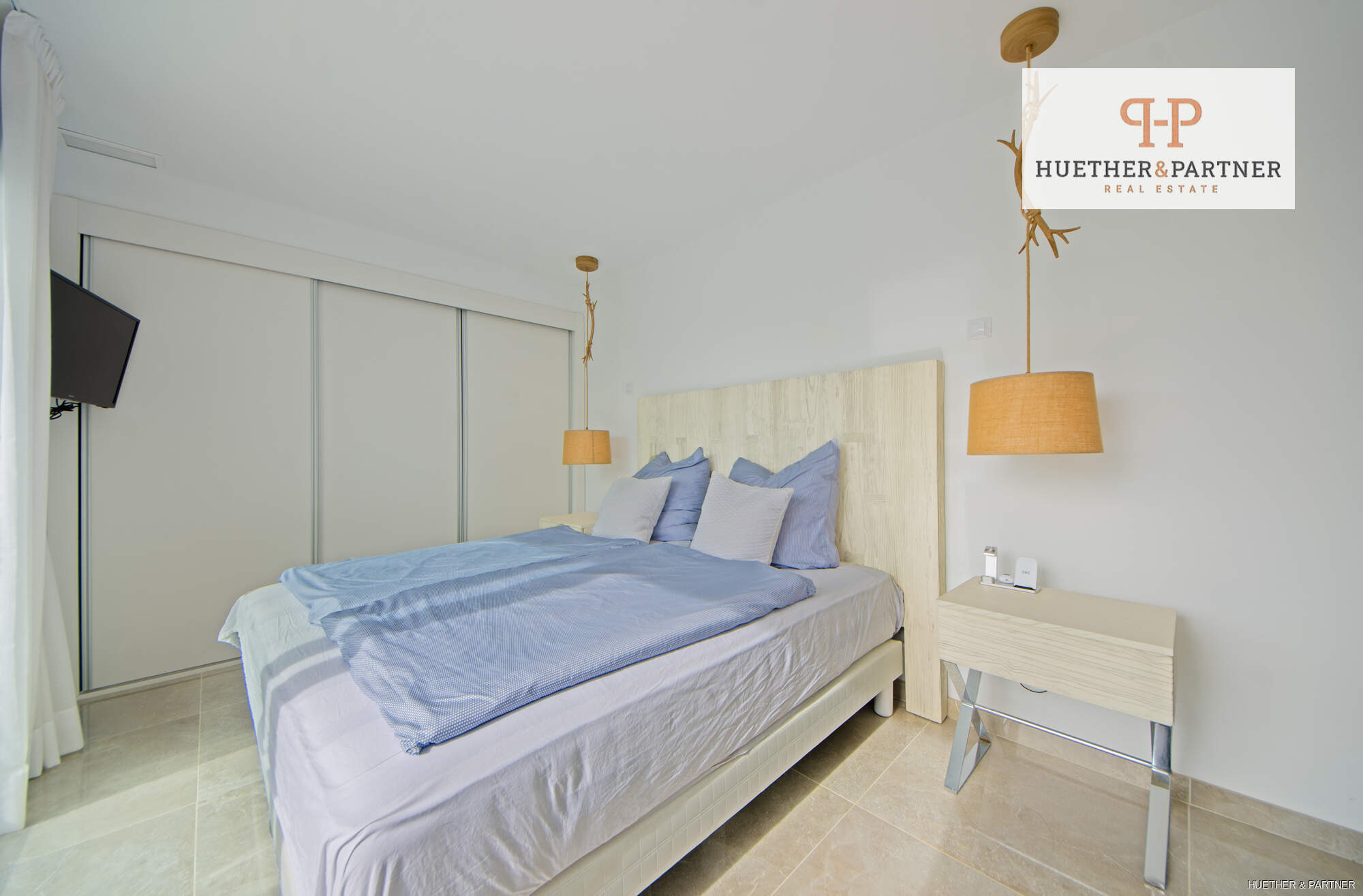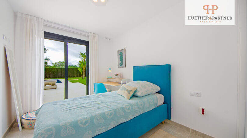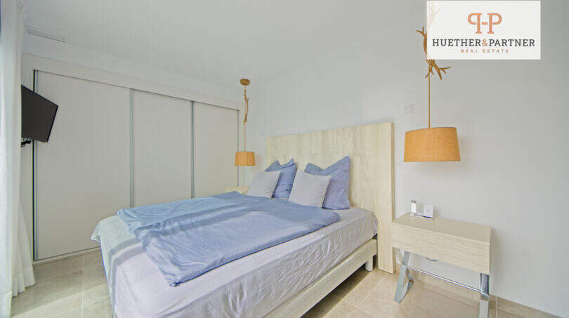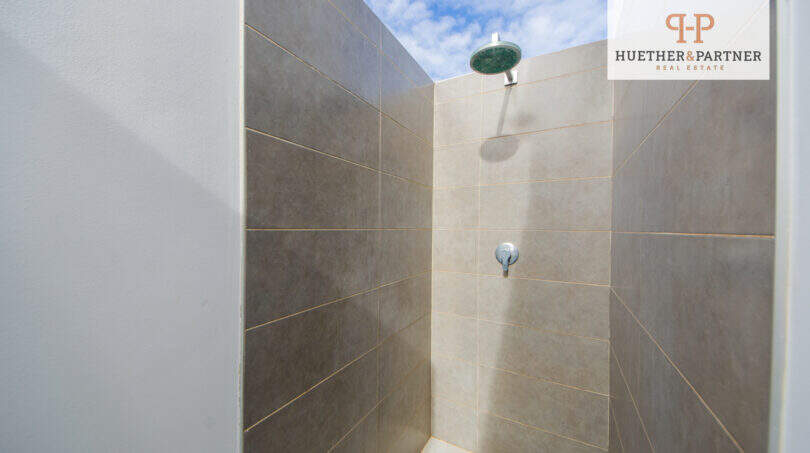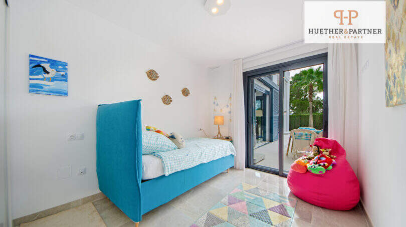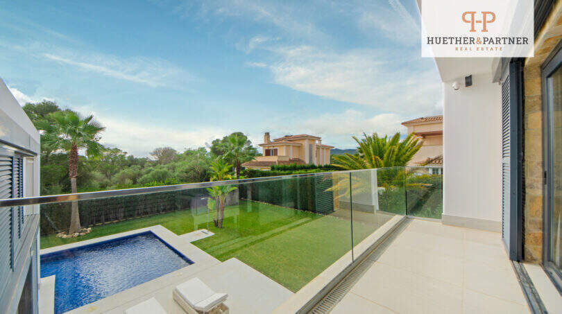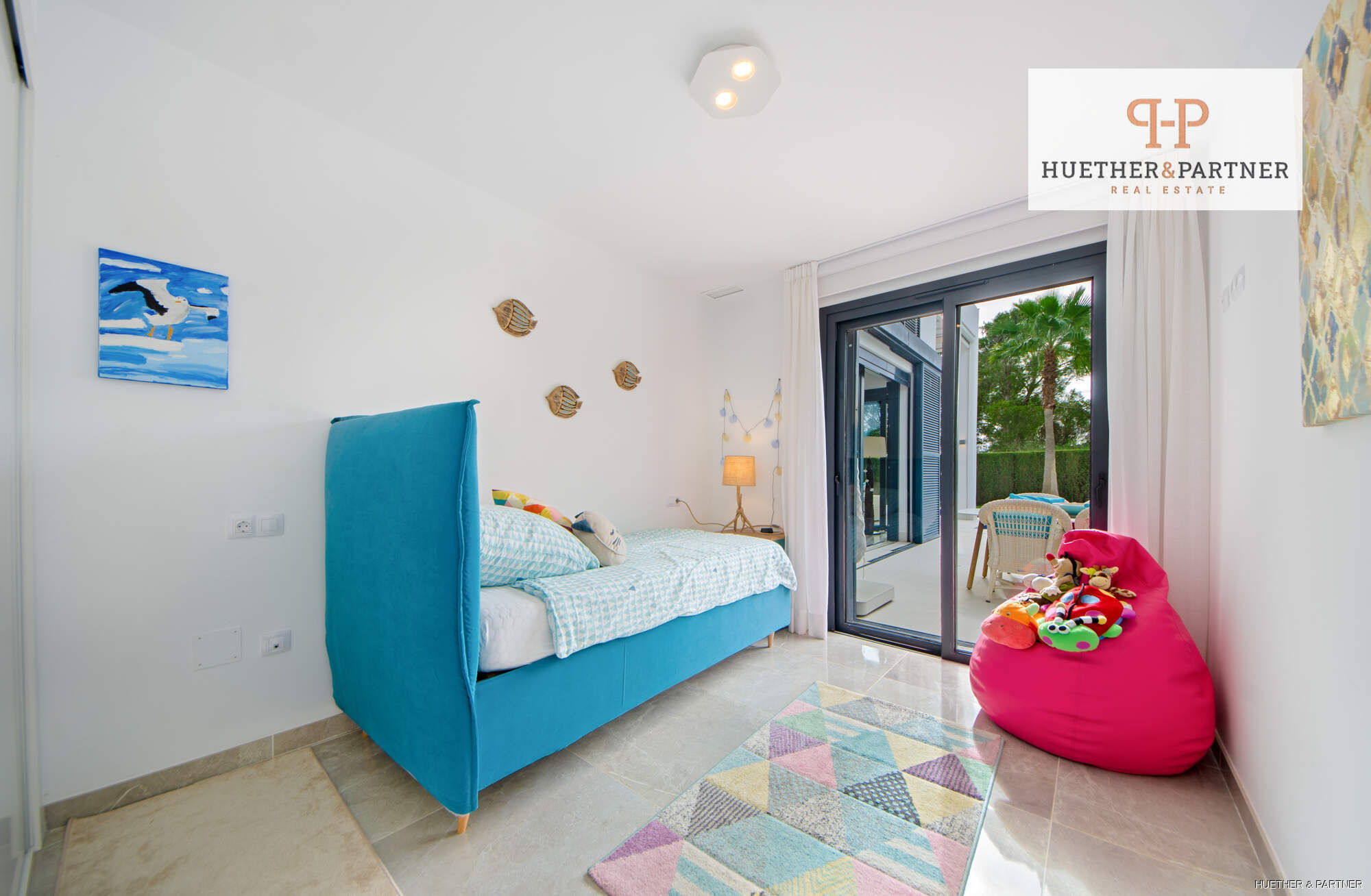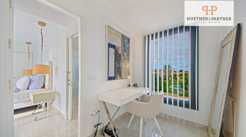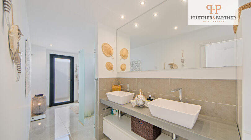 Im Obergeschoss erwartet Sie ein heller Flurbereich, der ausreichend Platz für einen Arbeitsbereich bietet. Das Hauptschlafzimmer verfügt über ein en-suite Bad mit Badewanne und Außendusche sowie einen Balkon mit Blick auf Garten und Pool. Alle Schlafzimmer sind mit maßgefertigten Einbauschränken ausgestattet, die viel Stauraum bieten.