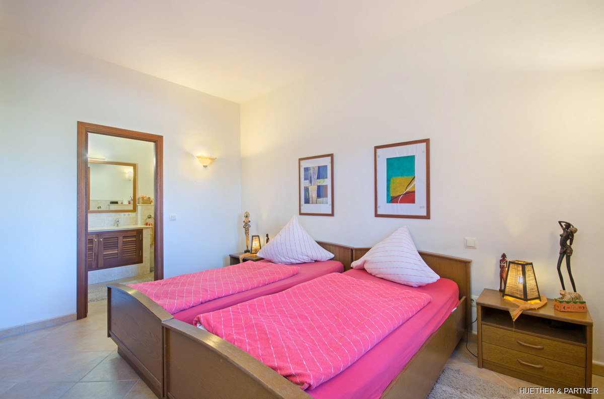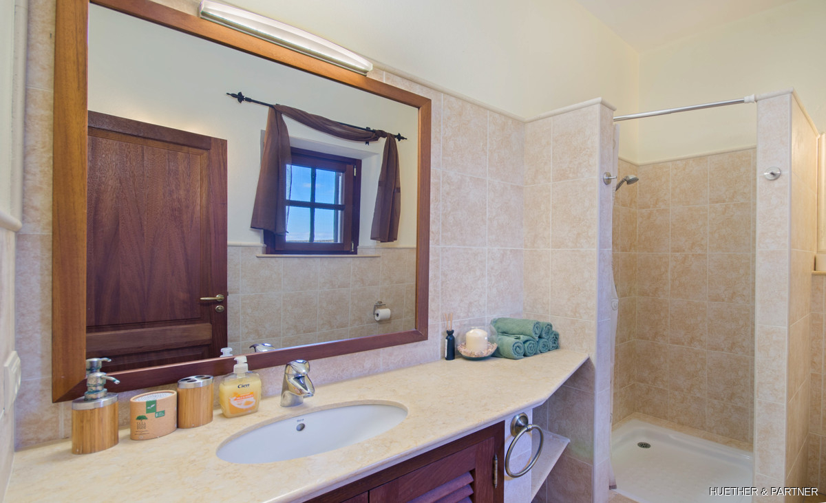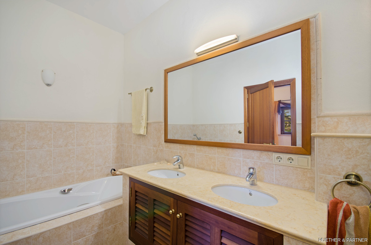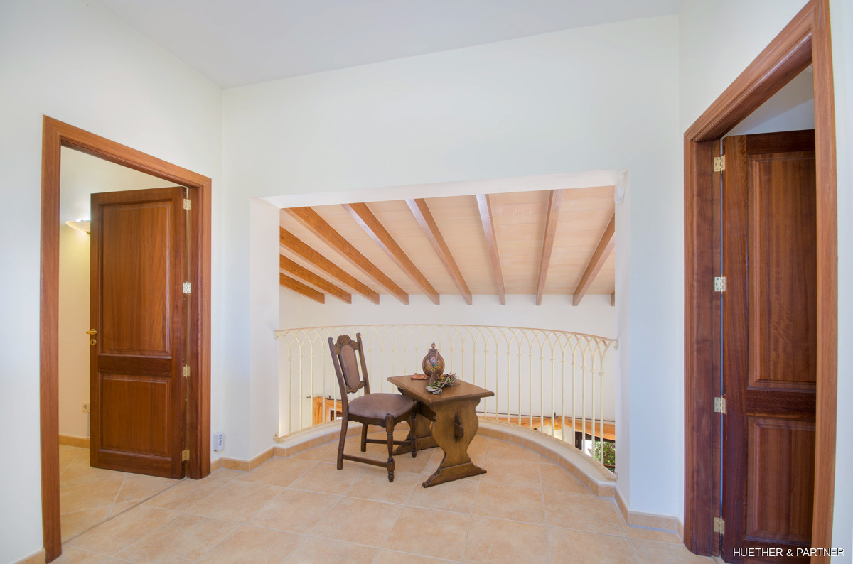 Eine Treppe führt ins Obergeschoss. Dort empfängt Sie eine Galerie, die in das Billardzimmer übergeht. Von hier aus gelangen Sie auf die große Terrasse mit traumhaftem Weitblick bis hin zum Meer. Das Obergeschoss verfügt über zwei Flügel, die jeweils eine große Suite mit privatem Wohnbereich, Schlafzimmer und Badezimmer bieten.