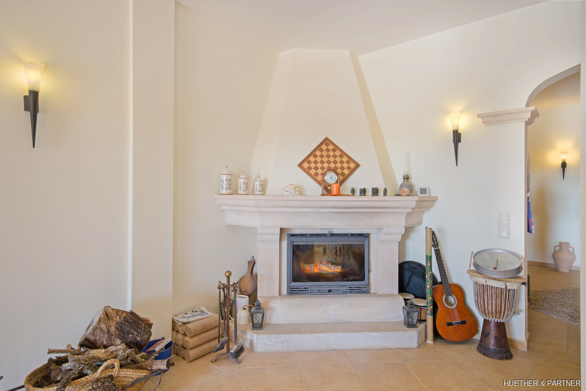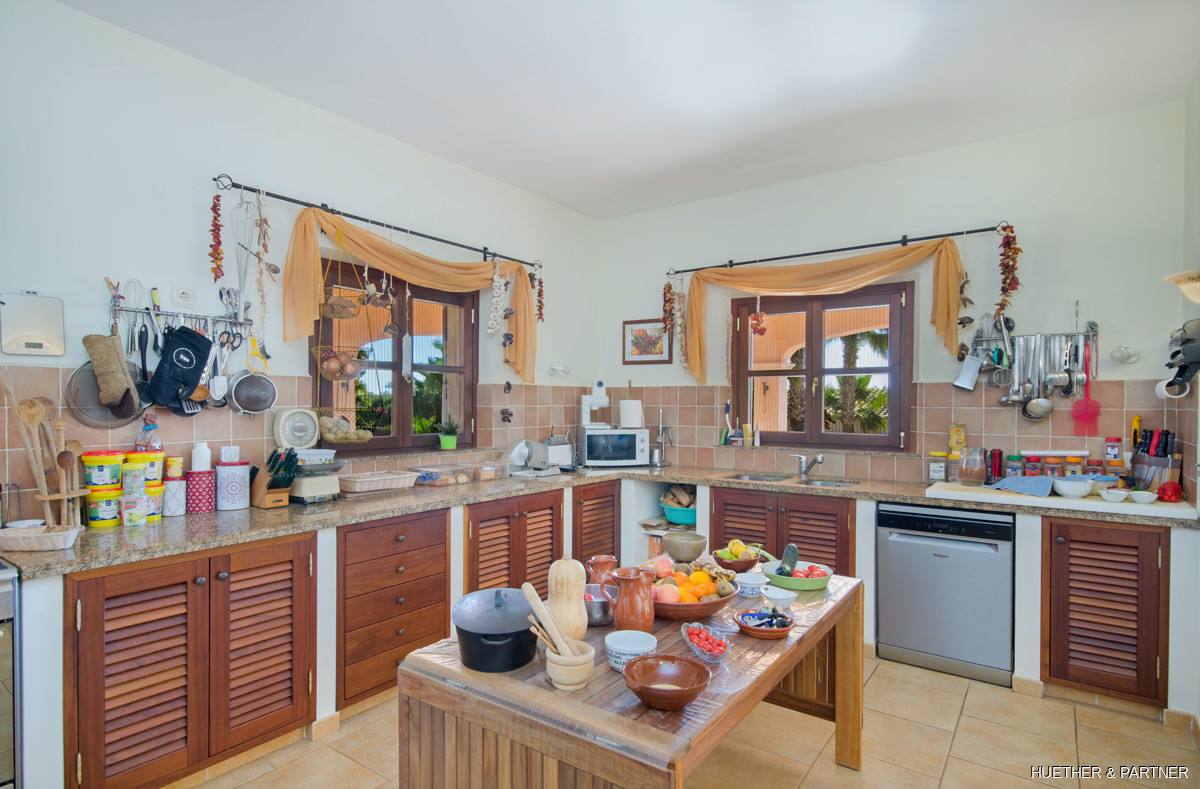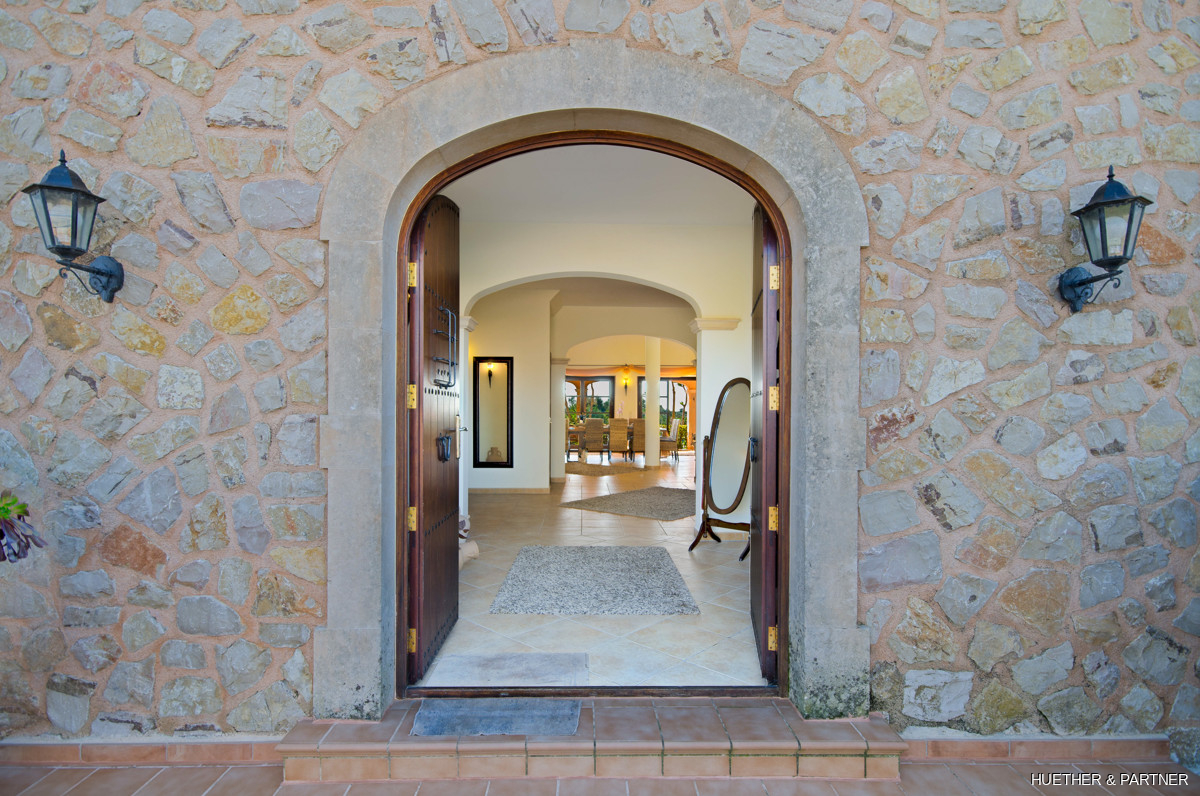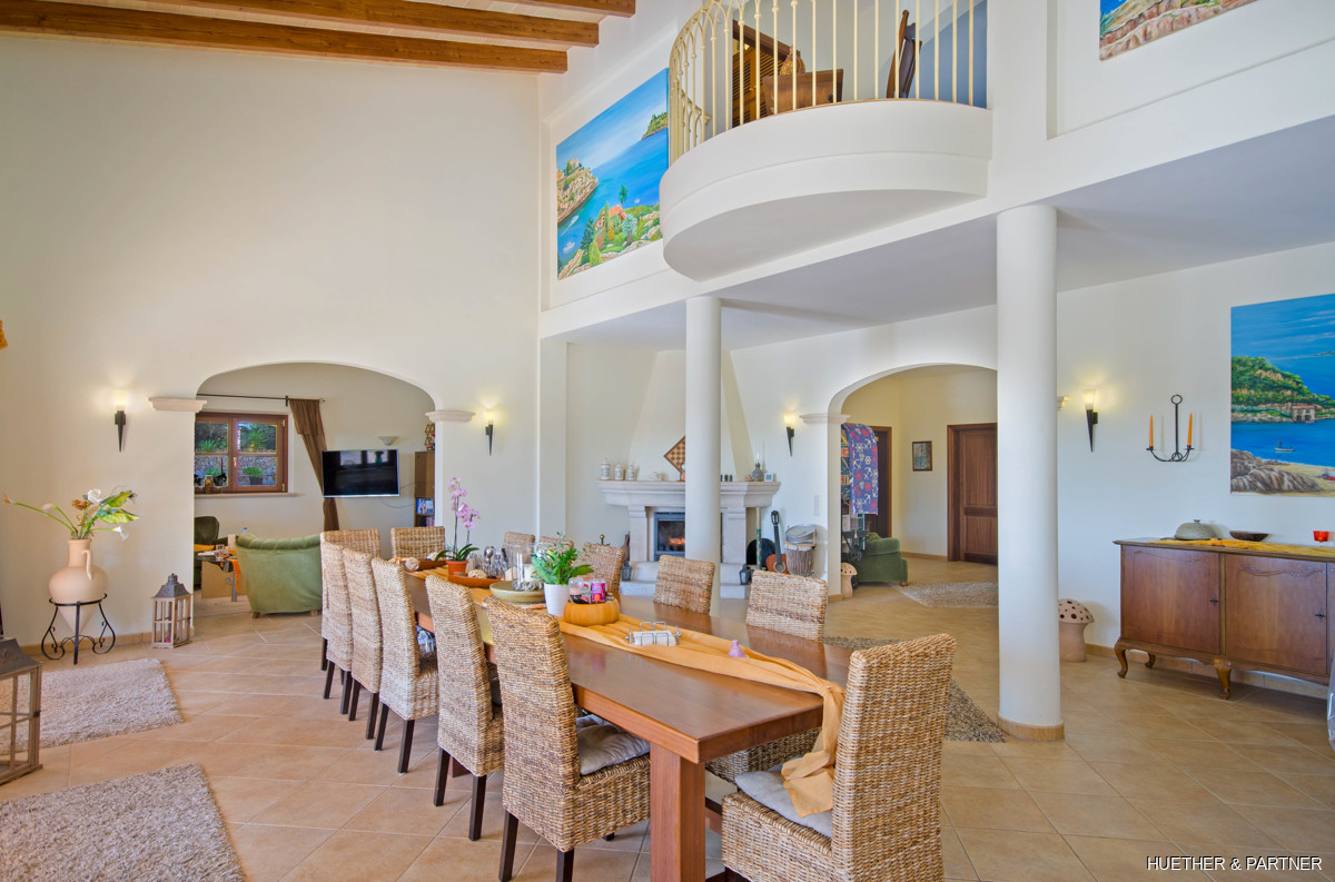 Nur mit den besten Materialien und gut durchdacht wurde eine charmante Immobilie geschaffen, die ausreichend Platz für die ganze Familie bietet. Im mediterranen Stil wurde die Finca liebevoll ausgestattet. Die Finca erstreckt sich über zwei Etagen und bietet sechs Schlafzimmer. Im Erdgeschoss empfängt Sie ein großzügiger Eingangsbereich, der in den gemütlichen Essbereich mit Kamin führt. Die hohe Decke mit betonierten Balken in Holzoptik unterstreicht das luftige Raumgefühl. Große bodentiefe Fenster öffnen den Zugang zur überdachten Terrasse, dem perfekten Schattenplatz im Sommer. Vom Essbereich gelangen Sie in die komplett ausgestattete Küche mit angrenzendem Hauswirtschaftsraum sowie in den separaten Wohnbereich. Zwei Schlafzimmer, eines davon en Suite, und ein Abstellraum befinden sich ebenfalls auf dieser Ebene.