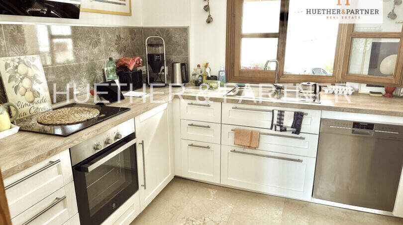 Die großzügige Gestaltung des Hauses umfasst vier Schlafzimmer und drei moderne Badezimmer, von denen zwei en suite sind. Eine neuwertige Einbauküche fügt sich harmonisch in den offenen Wohn- und Essbereich ein, der durch große, bodentiefe Fenster viel natürliches Licht erhält und einen wunderbaren Blick auf die umliegende Natur sowie das Meer bietet. Der helle Wohnbereich verbindet sich nahtlos mit der großzügigen Terrasse, auf der sich ein einladender Pool befindet. Diese Rückzugsorte im Außenbereich bieten einen wunderschönen Blick auf den mediterranen Garten und die angrenzende Grünzone – der perfekte Ort zum Entspannen und Genießen der Natur.