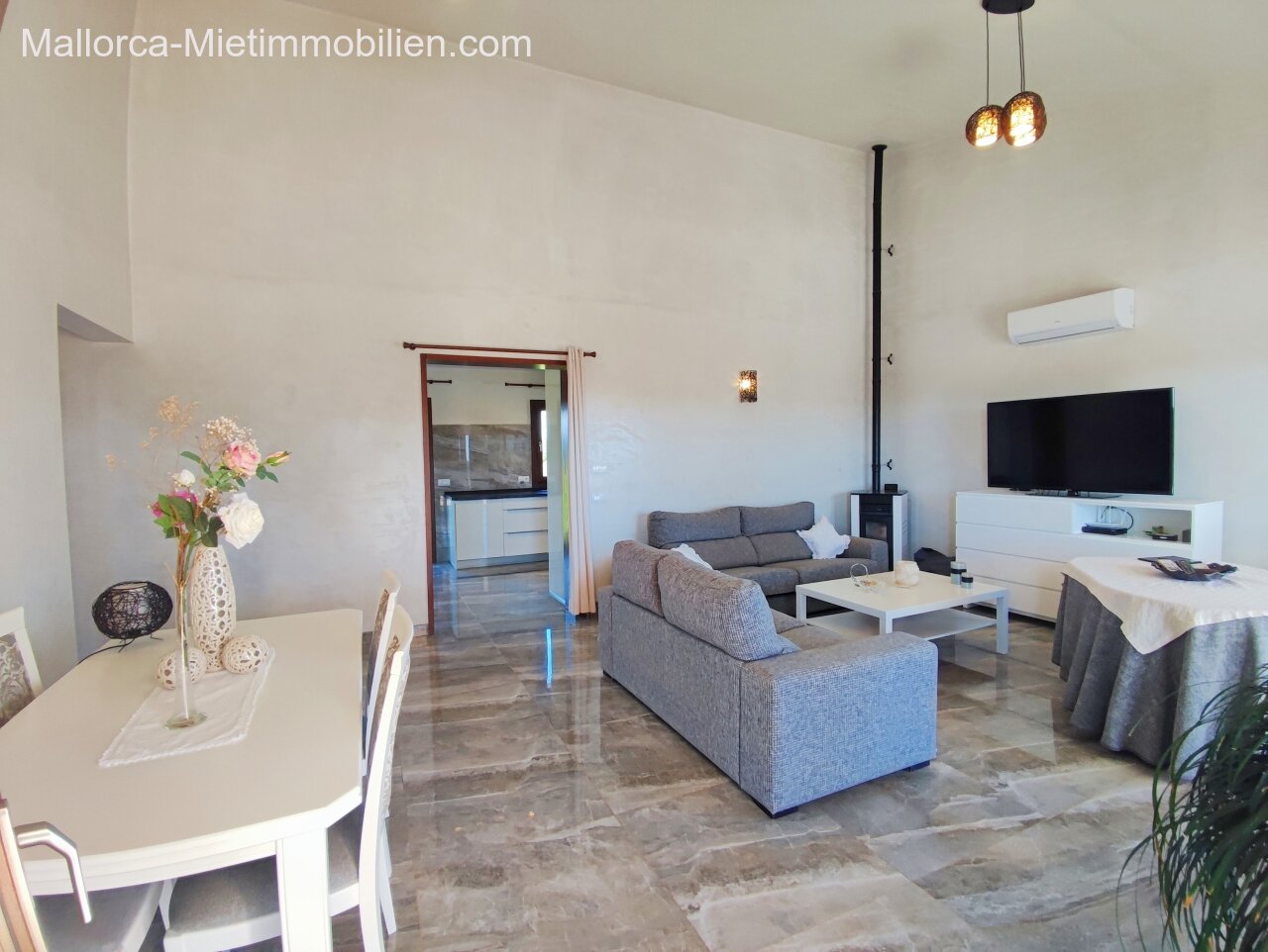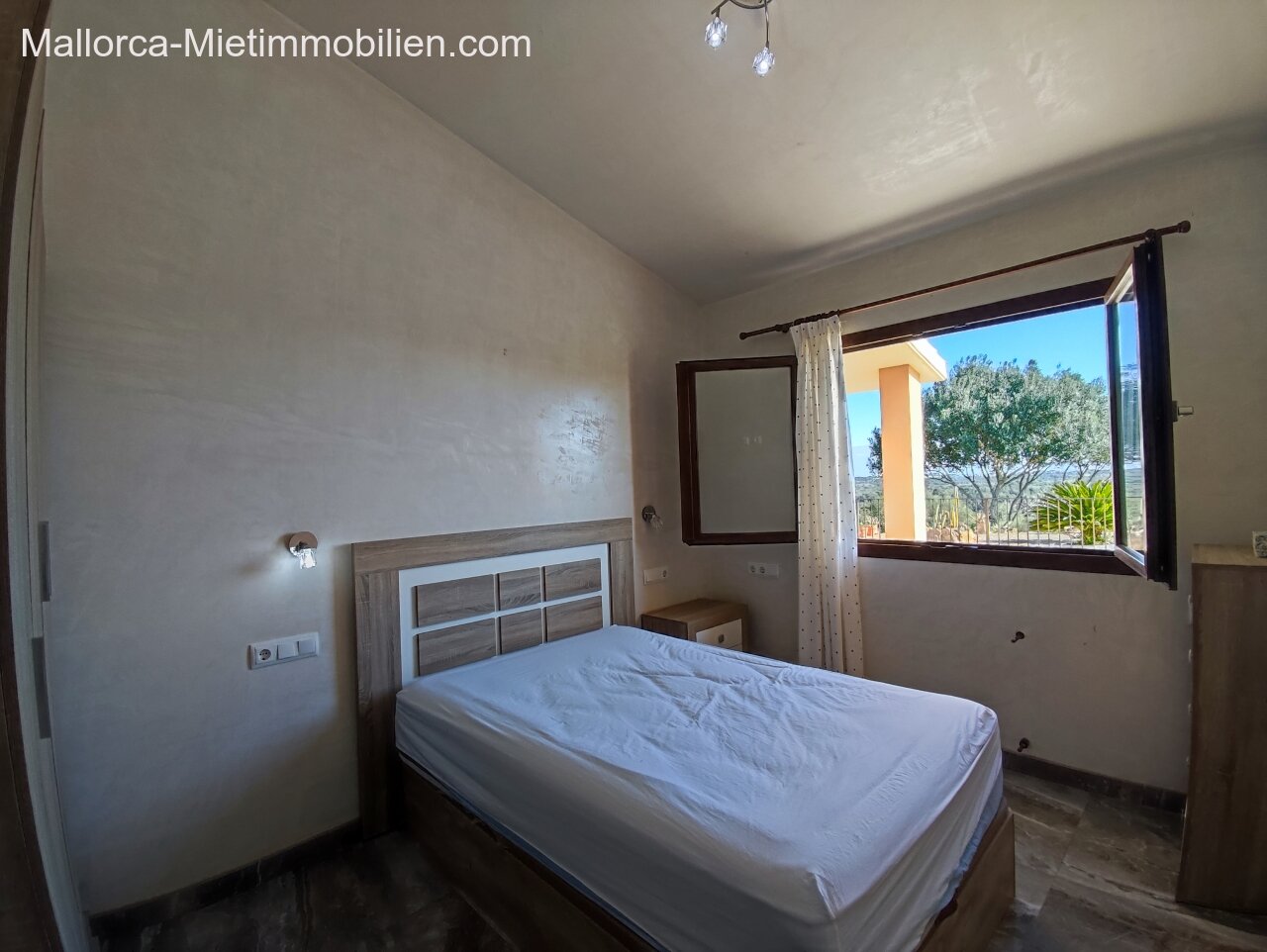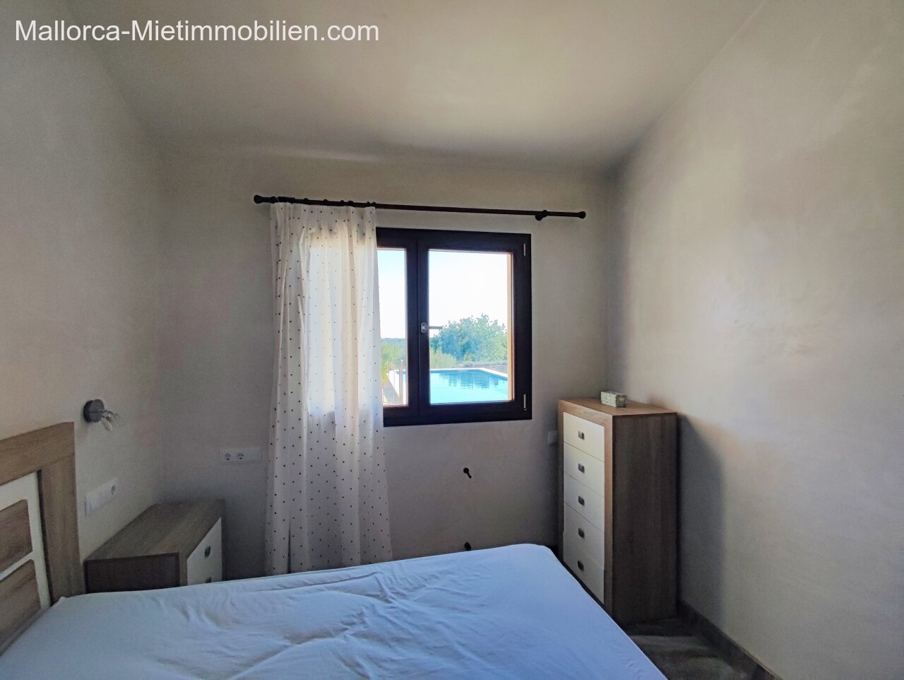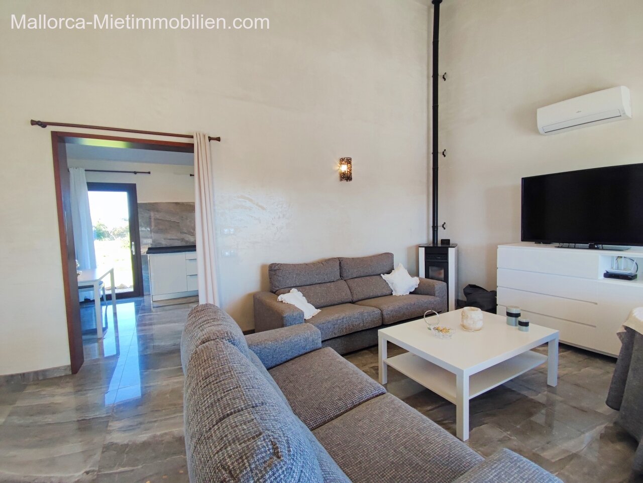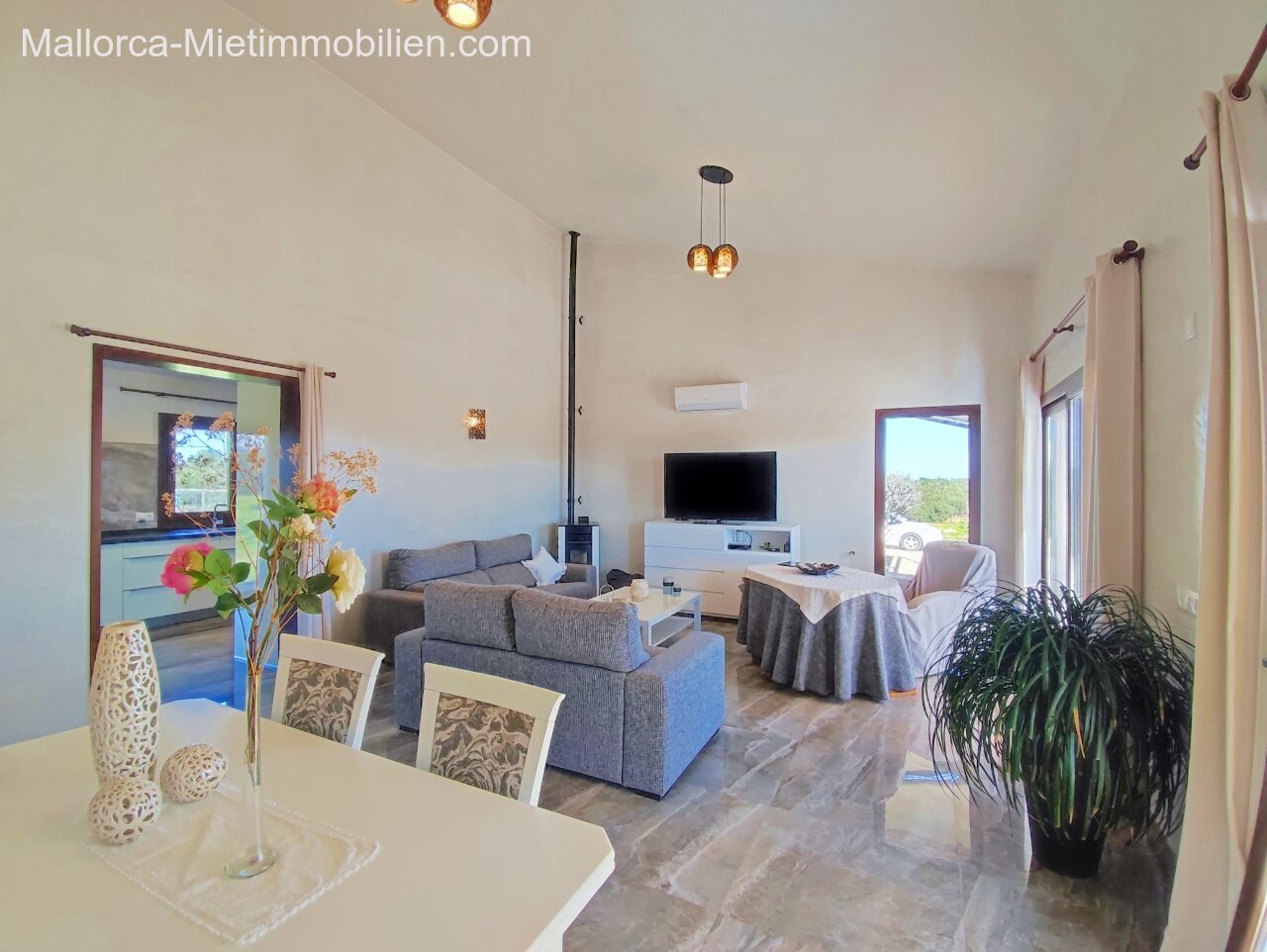 Porto Cristo / Mallorcas OstenSchöne moderne, edle Finca zur Miete mit gefälliger Auffahrt und elektrischem Tor. Die Finca ist nicht komplett eingezäunt (Steinmauer ja). Für Hunde gibt es bereits ein Hütebobsystem. Das Haus gliedert sich über einen hellen Wohnbereich mit Pelletofen und Sichtfenster bei der Sitzgruppe sowie eine AC warm/kalt/Entfeuchter, Essgruppe und angrenzender gemütlicher Vollküche mit modernen Elementen. Die Schlafzimmer haben eine gute Größe, der Masterbedroom ist nochmals etwas größer, mit Einbauschränken und Bad en suite. Der Masterbedroom wird unmöbliert übergeben.