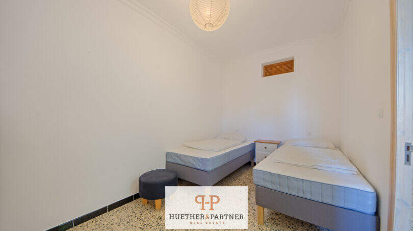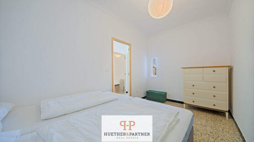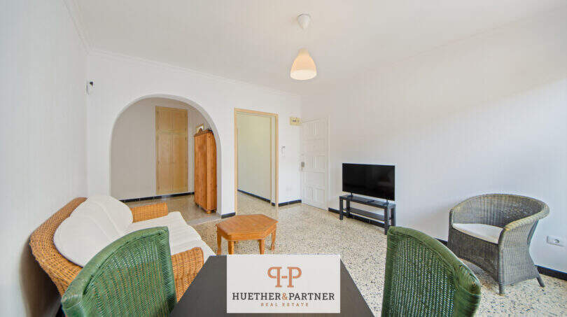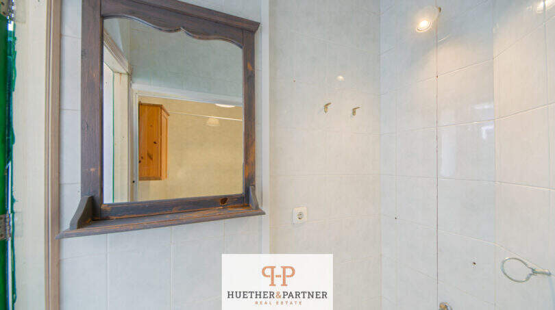Sie verfügt über eine klassische Raumaufteilung mit zwei Schlafzimmern, einem separaten Wohnzimmer, einem Esszimmer sowie einer Küche. Ergänzt wird das Raumangebot durch zwei Balkone, die zusätzliche Aufenthaltsmöglichkeiten im Freien bieten. Das Badezimmer ist mit einer Badewanne ausgestattet und über den zweiten Balkon bzw. einen Durchgang erreichbar, was eine besondere, typisch mediterrane Bauweise widerspiegelt. Die Eigentumswohnung ist insgesamt renovierungsbedürftig, bietet jedoch eine solide Grundlage für eine individuelle Gestaltung. Erste Maßnahmen wie Malerarbeiten sowie das Streichen der Balkongeländer wurden bereits durchgeführt.