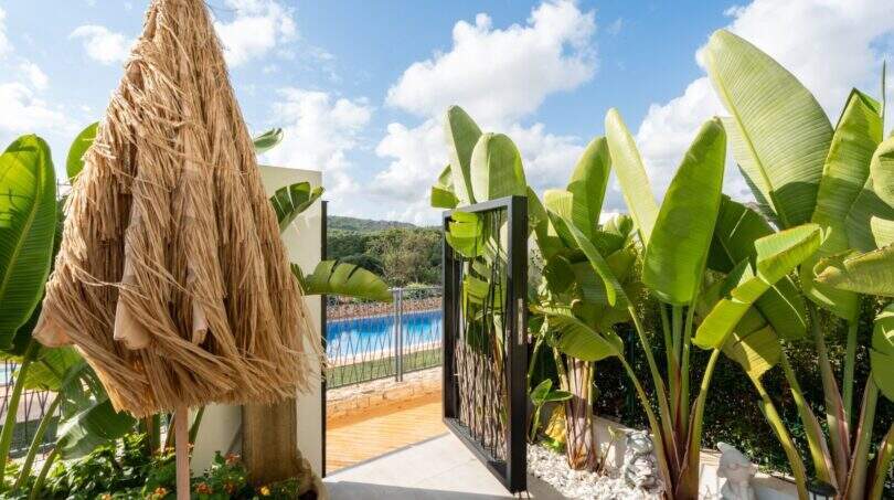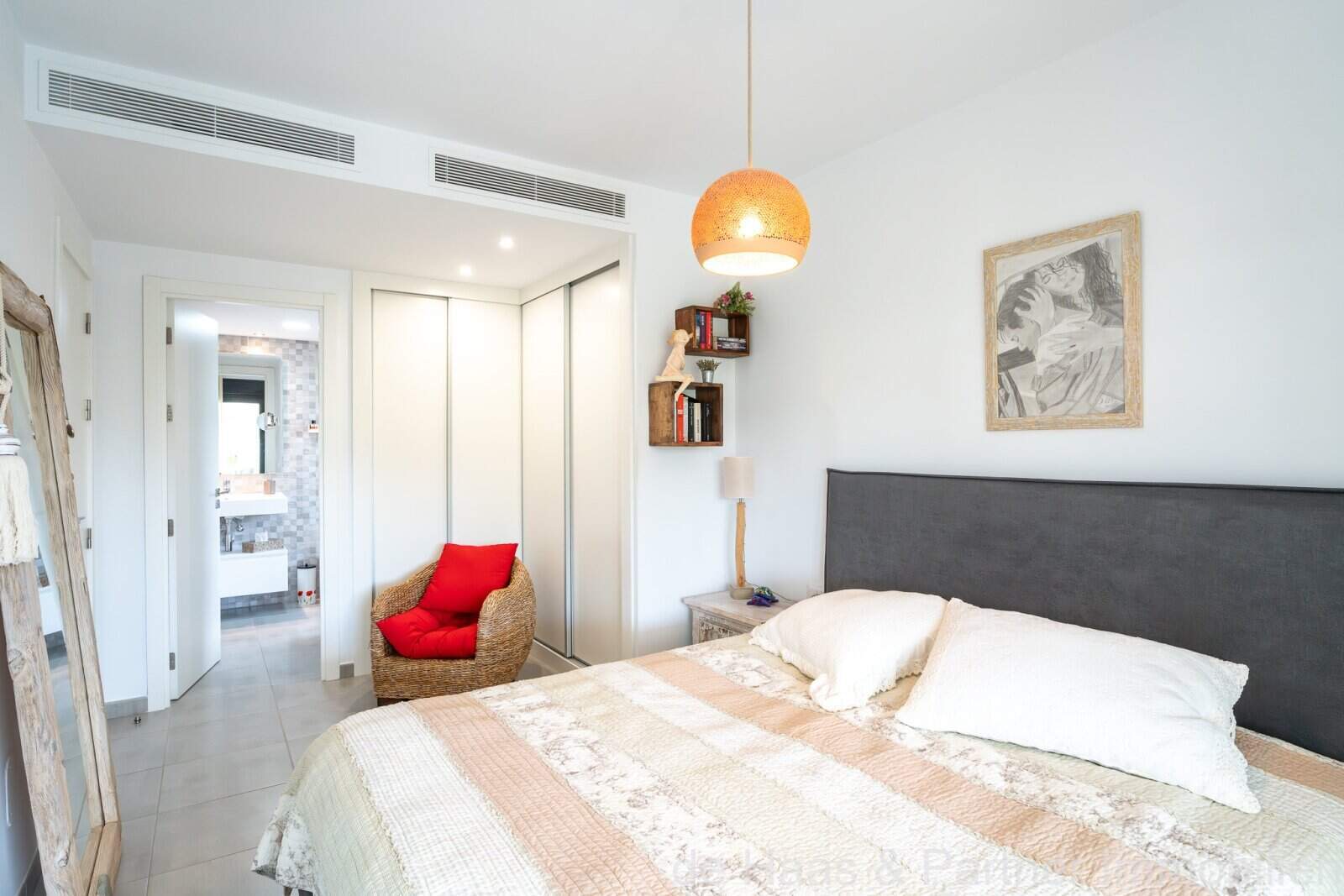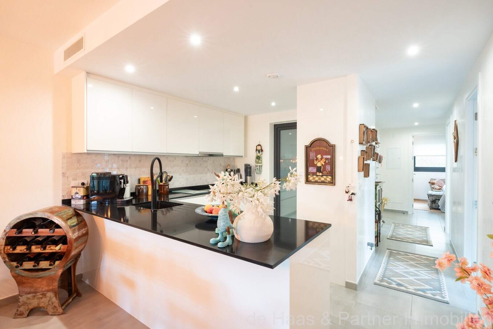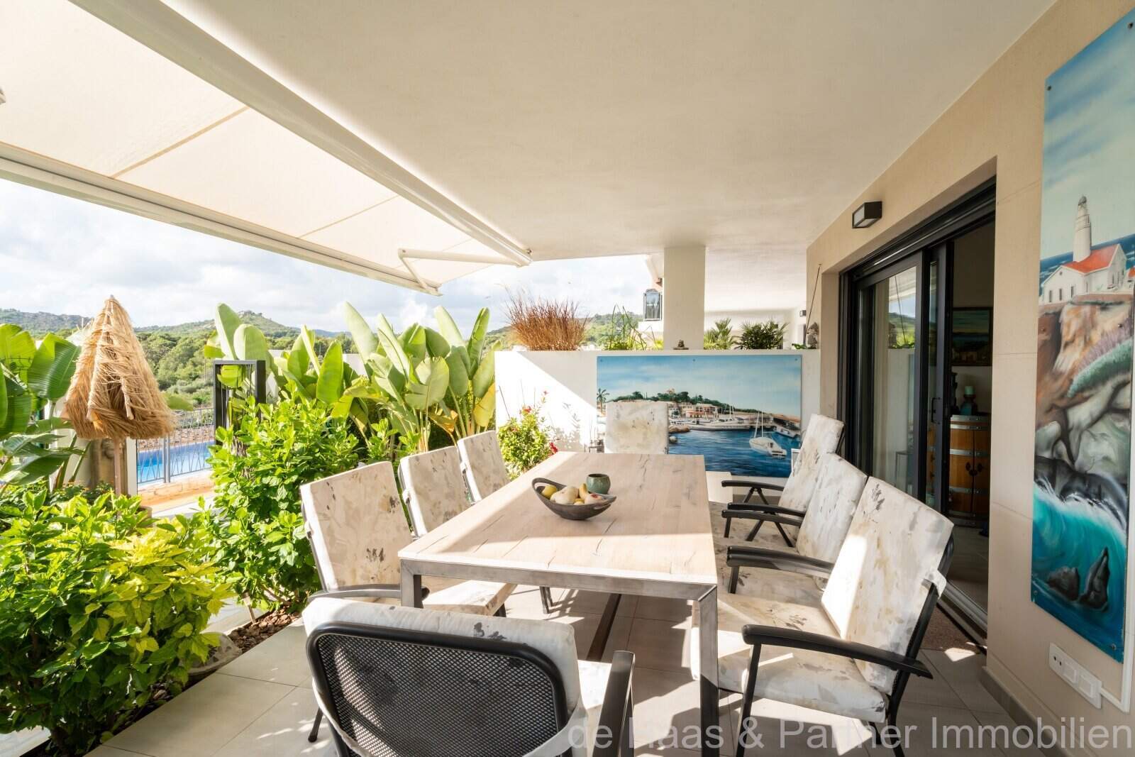 Vom Eingangsbereich befindet sich links ein Schlafzimmer sowie ein Abstellraum. Im rechten Teil der Wohnung sind ein Tageslichtbad mit Regendusche sowie zwei weitere Schlafzimmer (eines davon mit Bad en Suite) vorhanden. Der offen gestaltete Wohn- Essbereich mit amerikanischer Küche bietet eine absolute Wohlfühlatmosphäre. Vom Wohnbereich und vom Master-Schlafzimmer ist der Zugang zur Terrasse, die in den wunderschön angelegten mediterranen Garten übergeht. Genießen Sie von hier aus eine atemberaubende Aussicht. Ein HWR rundet das Angebot ab. Der private Garten wird einmal pro Woche von einem Gärtner gepflegt.
