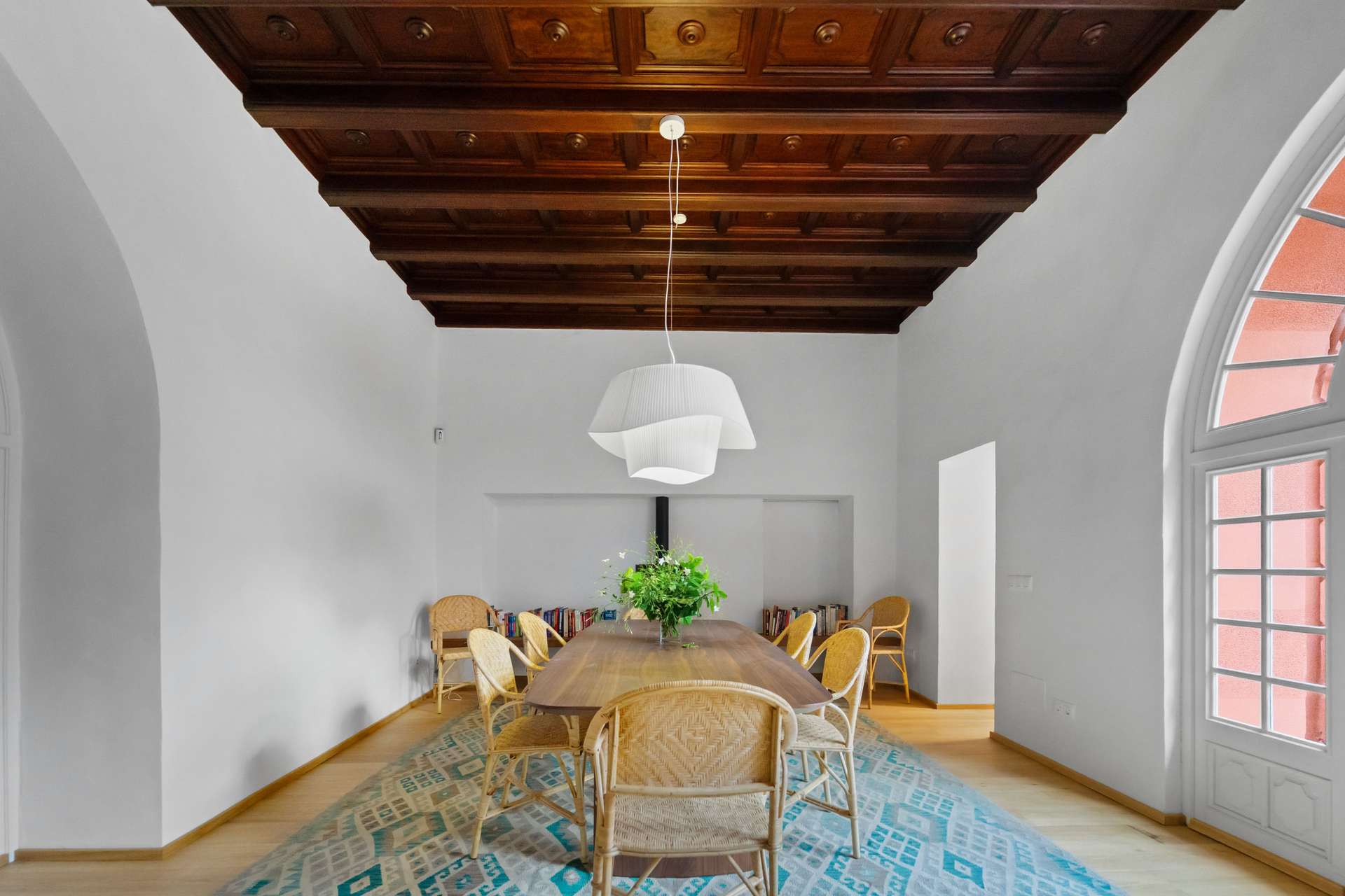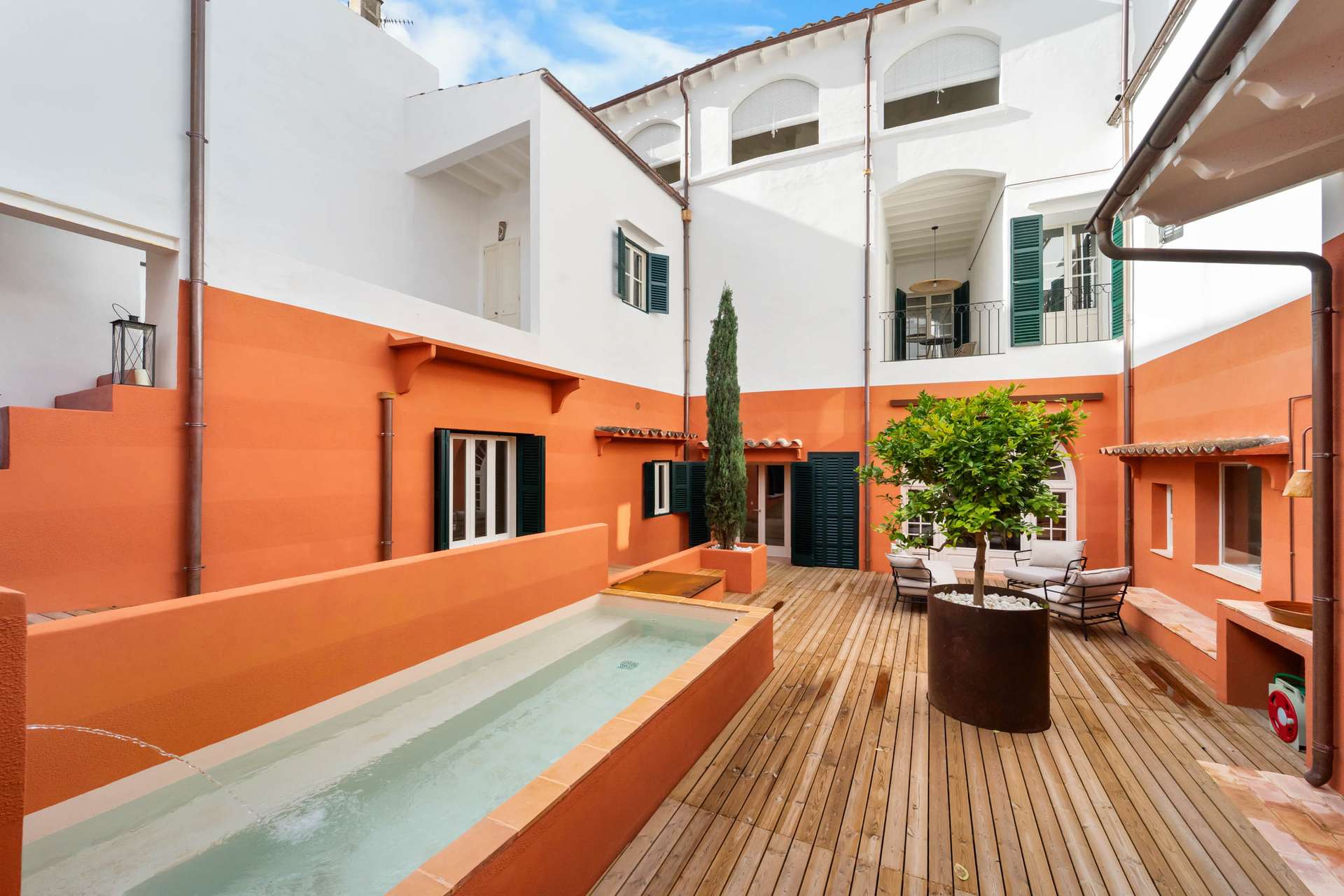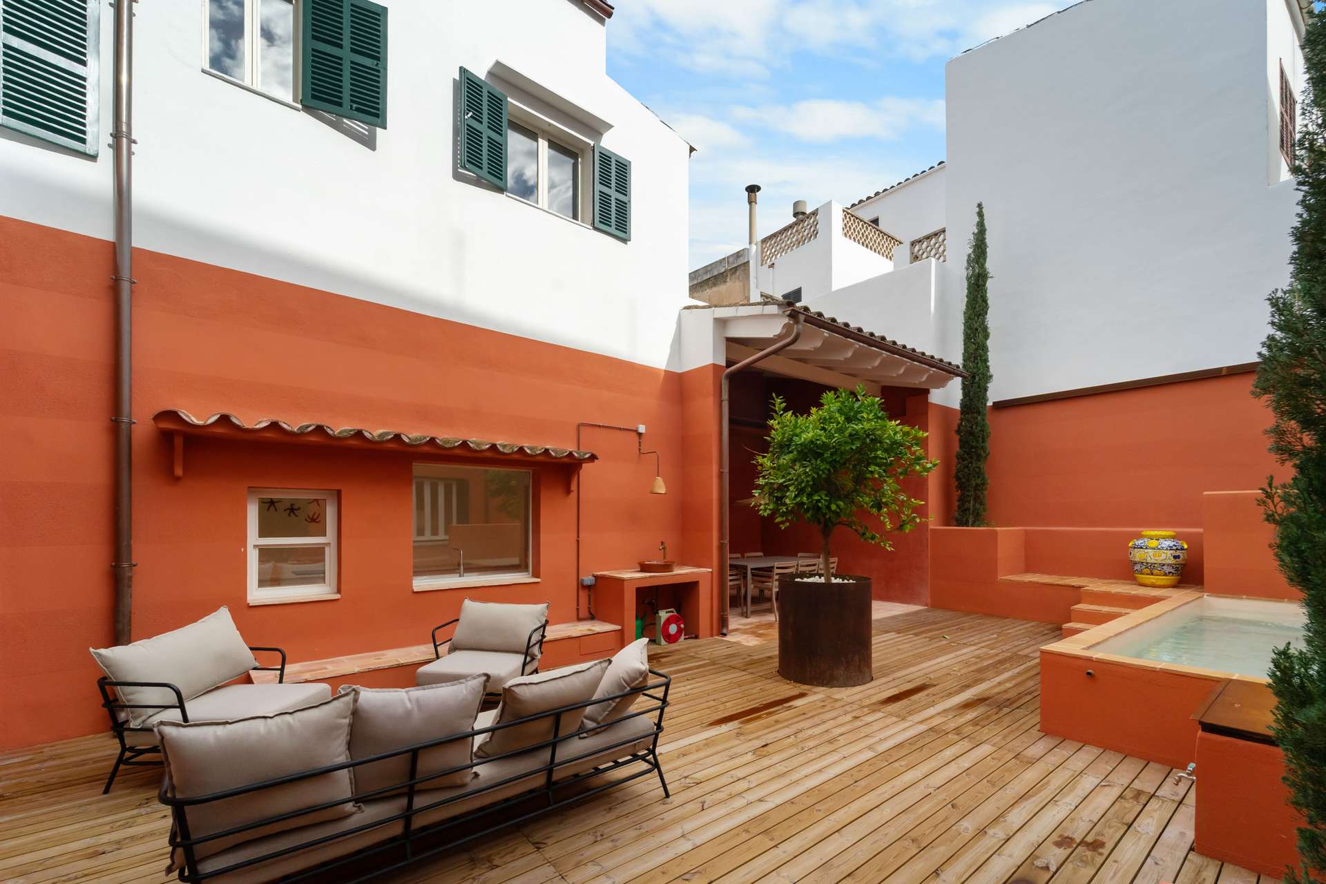 Im Erdgeschoss führt der Eingangsbereich zu einem Wohnzimmer, zwei Schlafzimmern mit en-suite Bädern, einem gemütlichen Kaminzimmer, dem Hauptspeisezimmer und einer offenen Küche mit direktem Zugang zur Terrasse. Der Außenbereich lädt zum Entspannen ein: Essbereich im Freien, Dekorbrunnen, Ruhezone sowie Zugang zur Garage und zum Lagerraum, die zur Hinterstraße führen. Holzböden, sichtbare Balken und weitere mallorquinische Originalelemente verschmelzen harmonisch mit modernen Materialien von höchster Qualität und schaffen ein warmes, luxuriöses Ambiente.