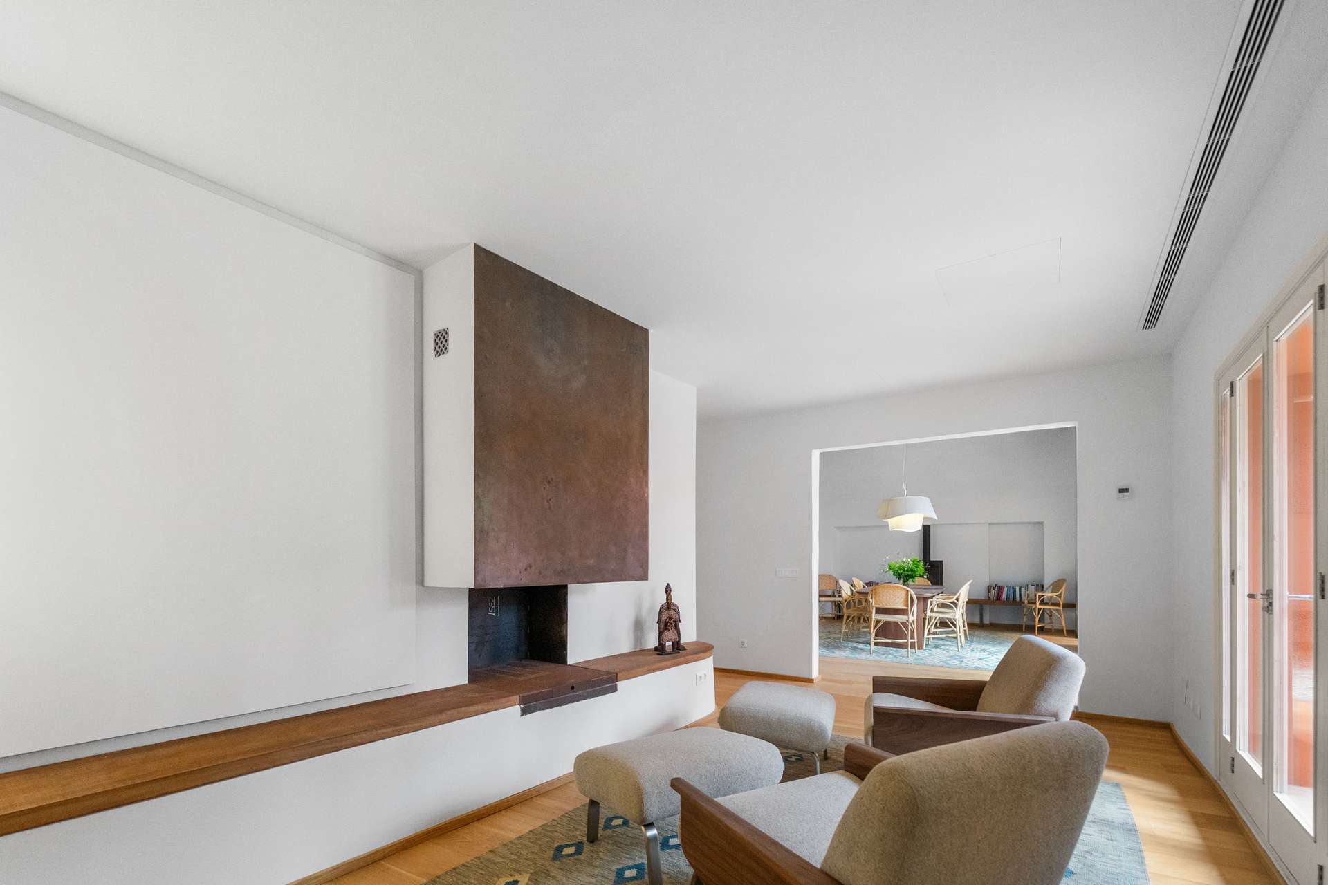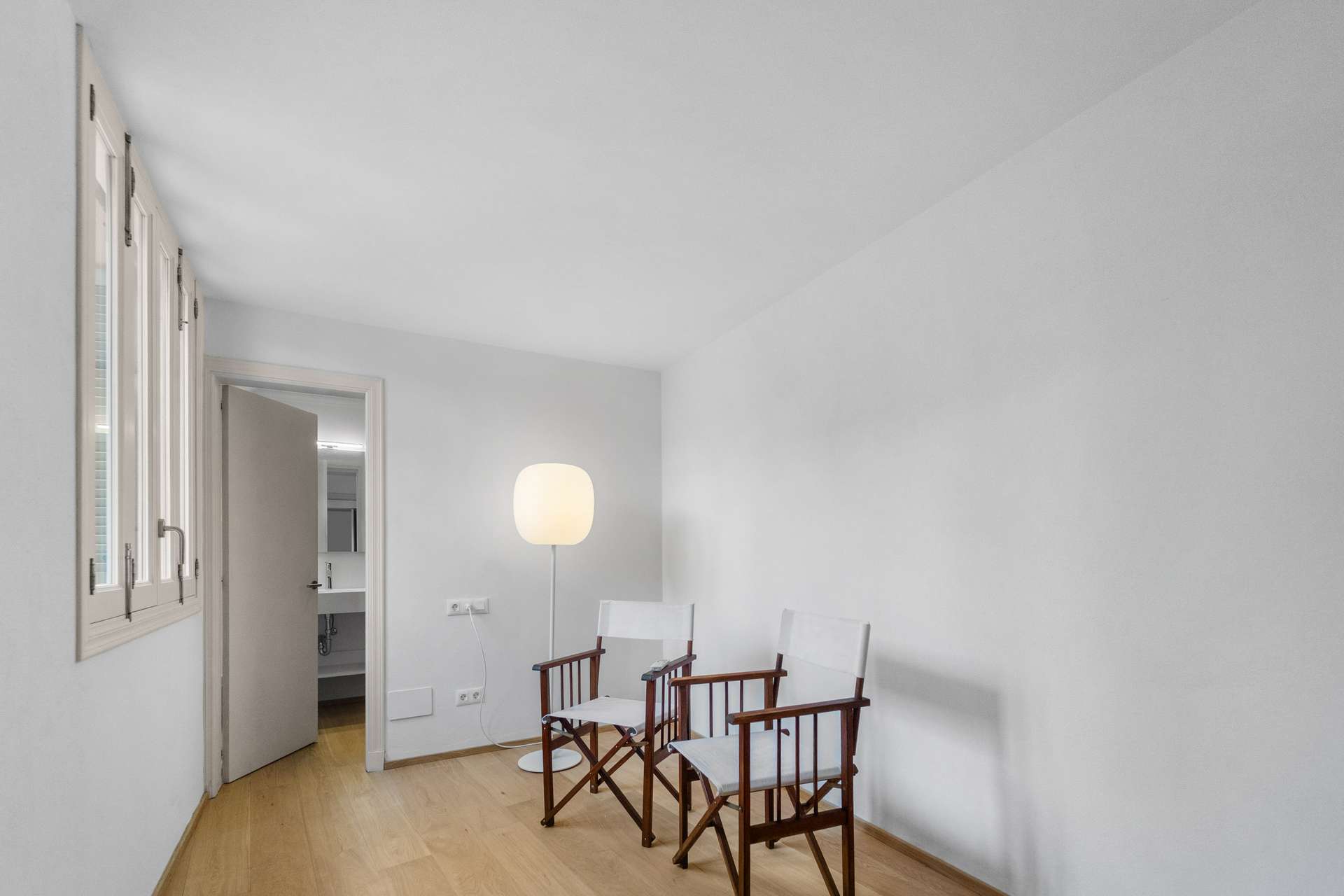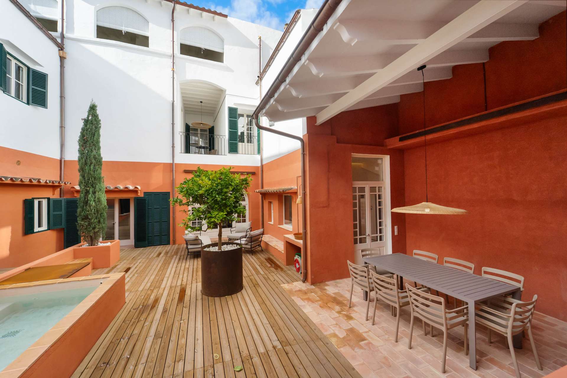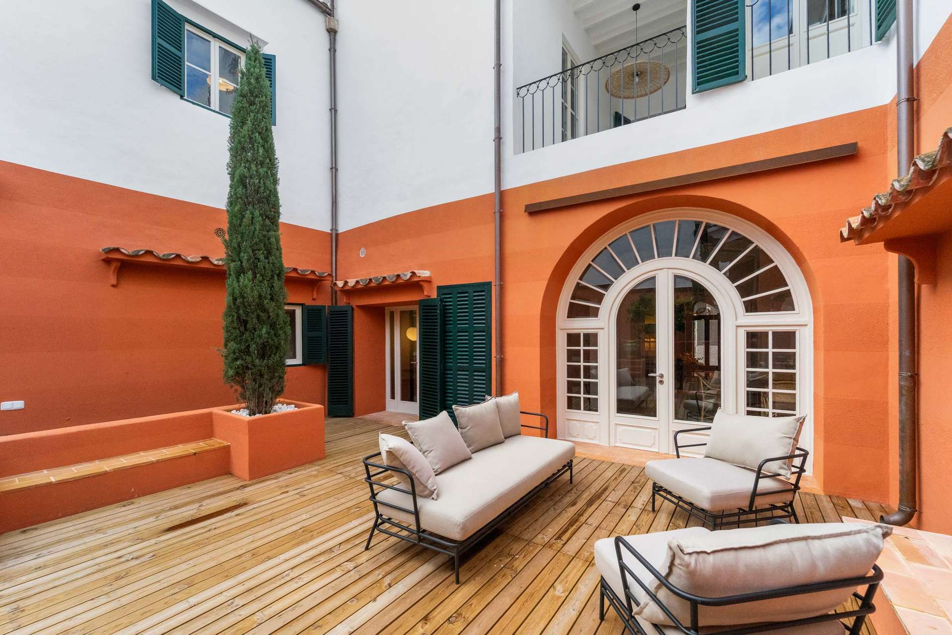 Im Erdgeschoss führt der Eingangsbereich zu einem Wohnzimmer, zwei Schlafzimmern mit en-suite Bädern, einem gemütlichen Kaminzimmer, dem Hauptspeisezimmer und einer offenen Küche mit direktem Zugang zur Terrasse. Der Außenbereich lädt zum Entspannen ein: Essbereich im Freien, Dekorbrunnen, Ruhezone sowie Zugang zur Garage und zum Lagerraum, die zur Hinterstraße führen. Holzböden, sichtbare Balken und weitere mallorquinische Originalelemente verschmelzen harmonisch mit modernen Materialien von höchster Qualität und schaffen ein warmes, luxuriöses Ambiente.